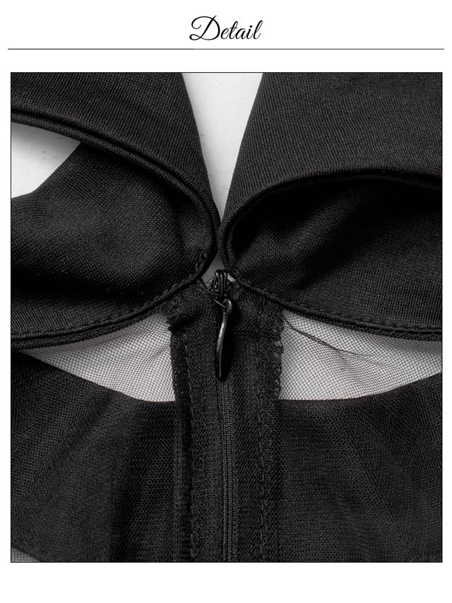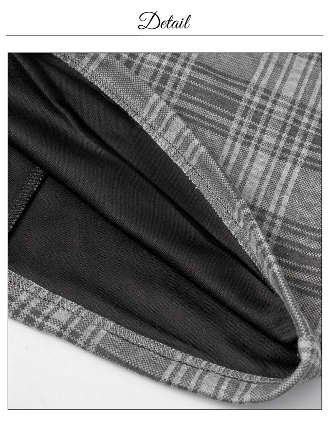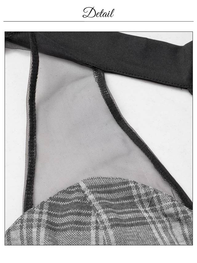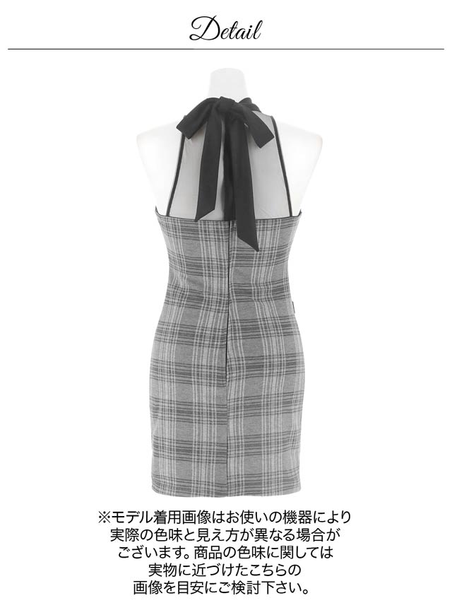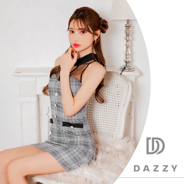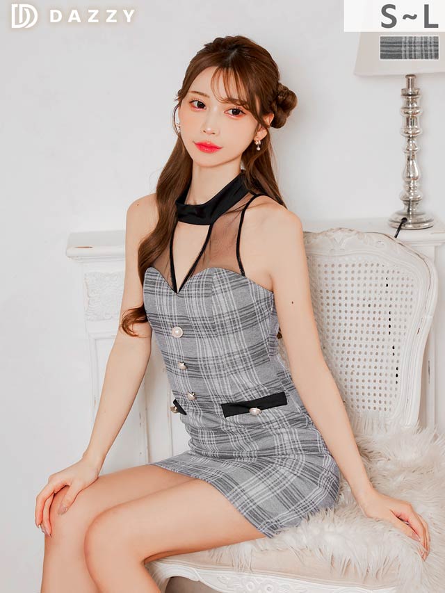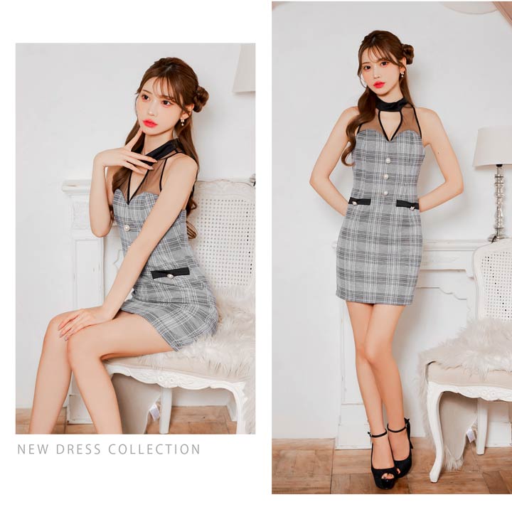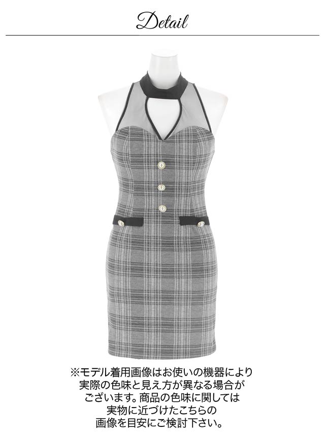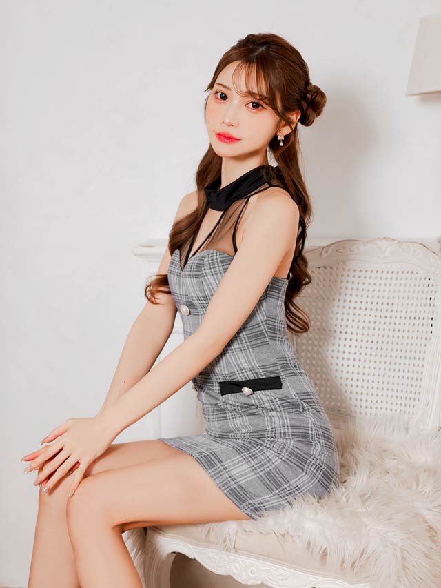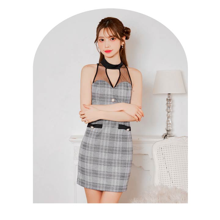 クラシカルなチェック柄に透け感のあるアメスリデザインがお洒落なキャバドレス。デコルテのシアー素材に大胆な谷間ホールが視線を釘付けに◎ フロントの大粒なパールボタンが上品さもプラスしてくれる1着です。