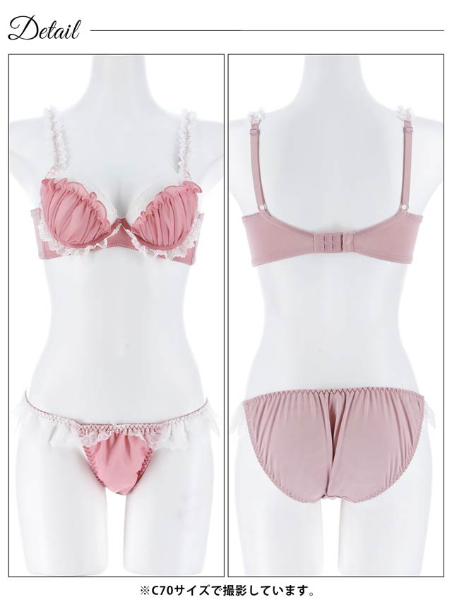 レースのカップにふんわりとフリルを重ねた、甘さあふれるキュートなランジェリー。肩ストラップ・アンダー・ショーツサイドにもレースフリルをたっぷりあしらい、華やかな印象に仕上げました♪身に着けるだけで心ときめく、とっても女の子らしいブラセットです◎