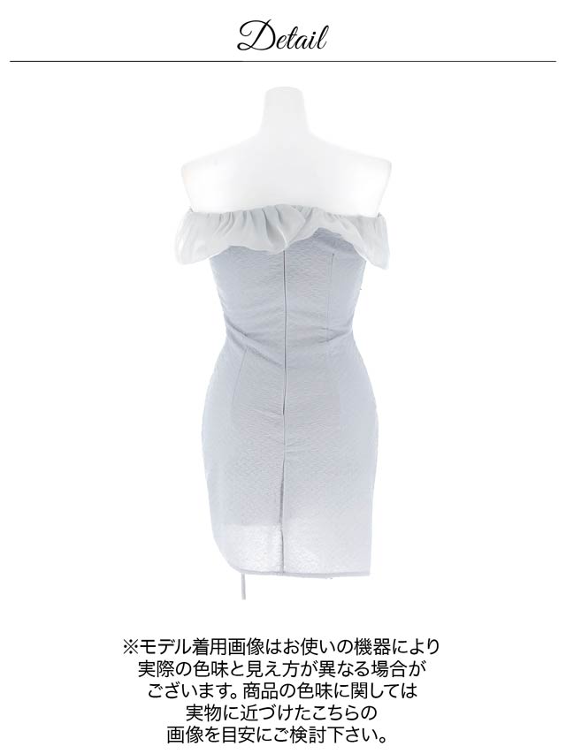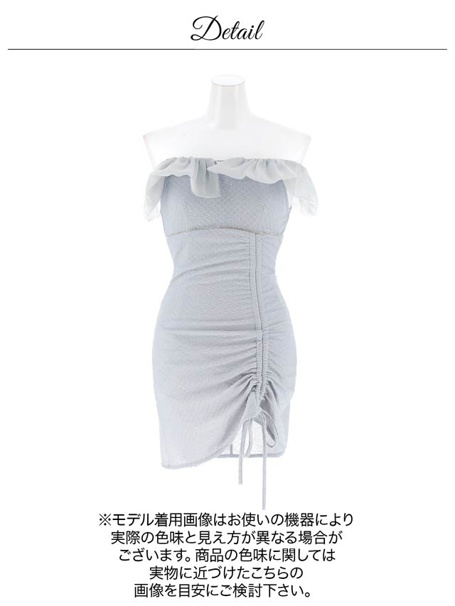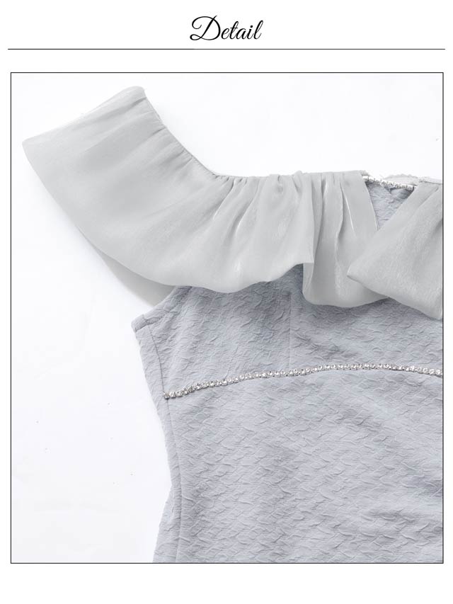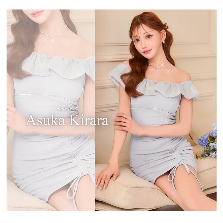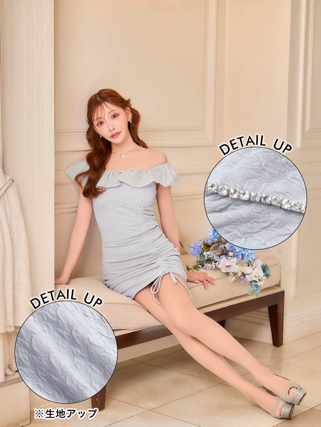 煌めくビジューで高級感をプラス◎デコルテを綺麗に見せてくれるオフショルキャバドレス。ふんわりとしたフリルが可愛らしく、気になる二の腕をさりげなくカバーしてくれます♪フロントのギャザーデザインが立体感を生み、細見えも期待できる一着です。