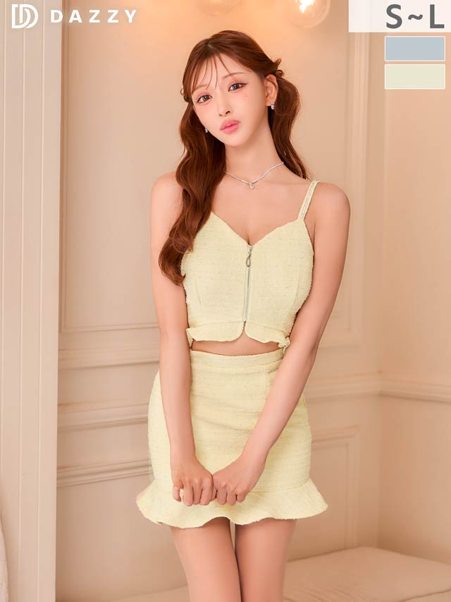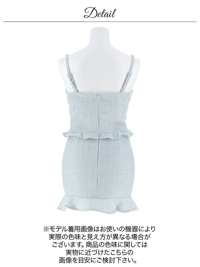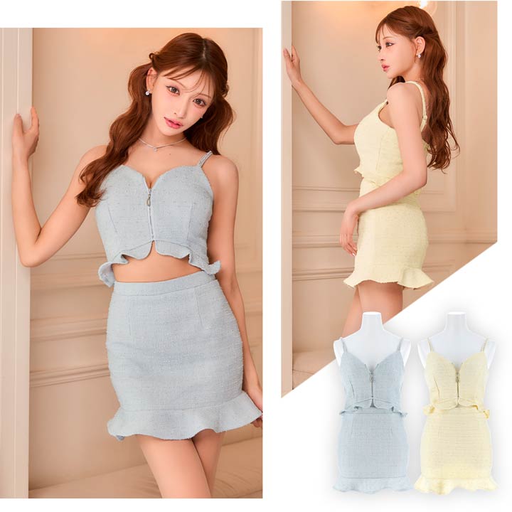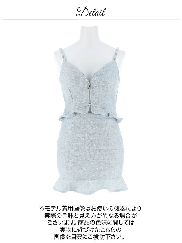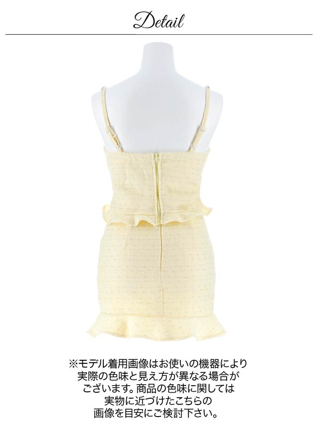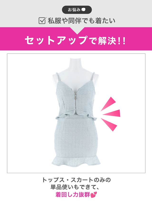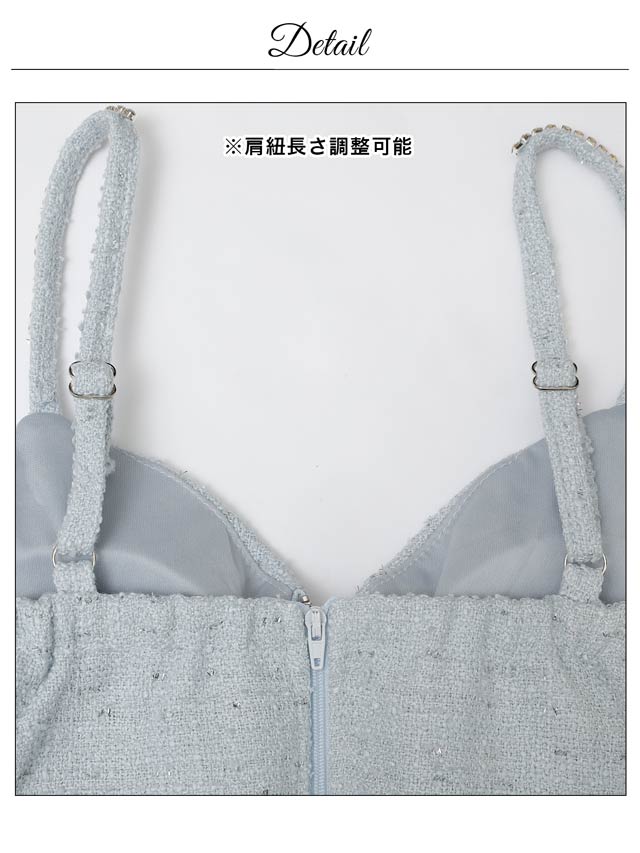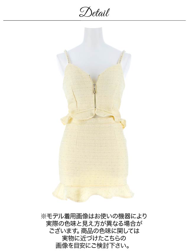 上品なツイード素材と春らしいカラーがこれからの季節にぴったりのセットアップドレス。裾のフリルで甘さを演出しつつ、胸元のジップを開けて色っぽい谷間魅せもできちゃいます♪肩紐はお好みの長さに調節可能。きらりと光るビジューもポイントです!