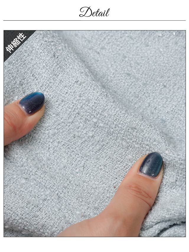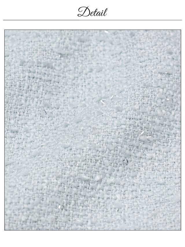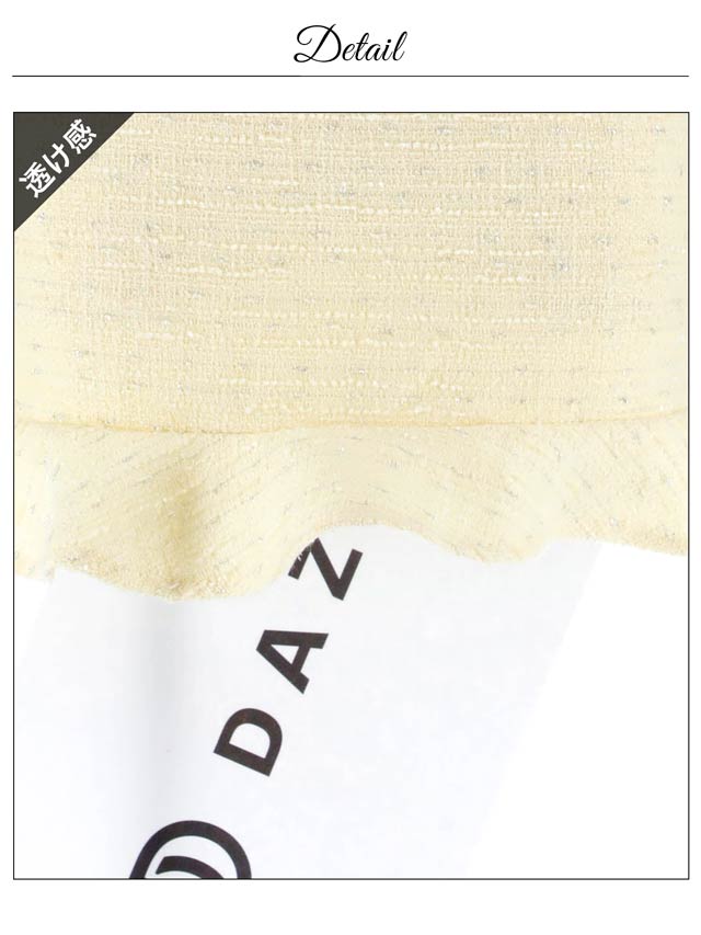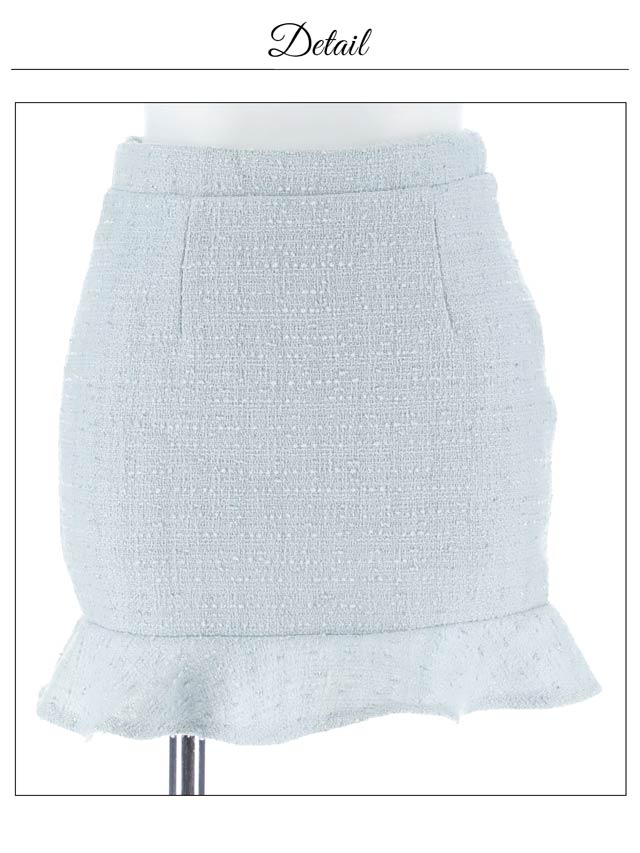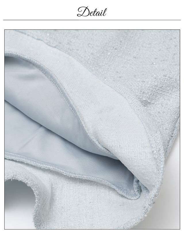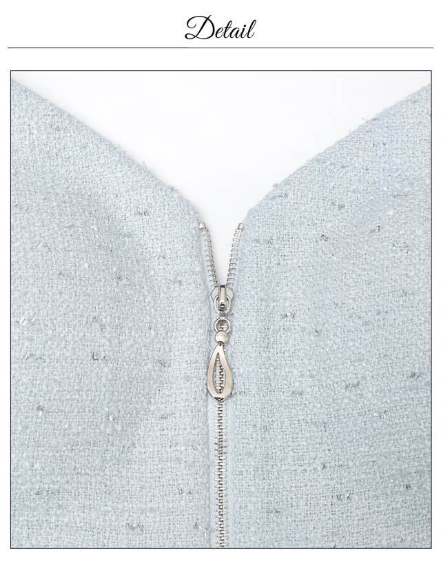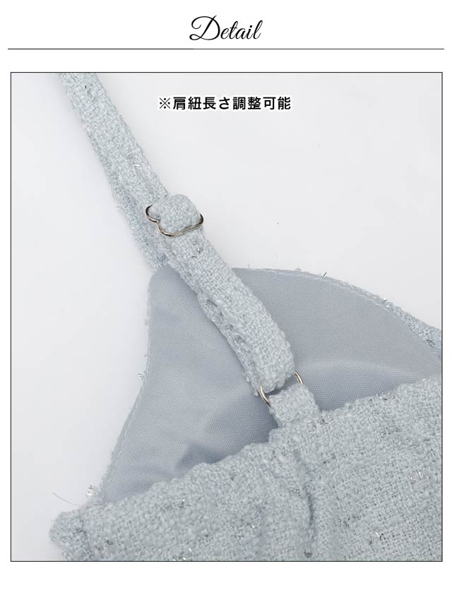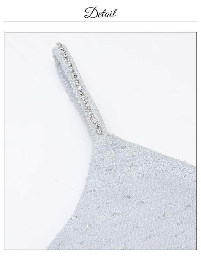 上品なツイード素材と春らしいカラーがこれからの季節にぴったりのセットアップドレス。裾のフリルで甘さを演出しつつ、胸元のジップを開けて色っぽい谷間魅せもできちゃいます♪肩紐はお好みの長さに調節可能。きらりと光るビジューもポイントです!