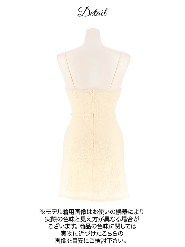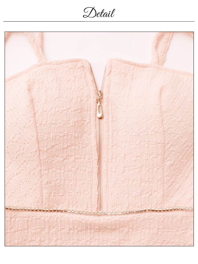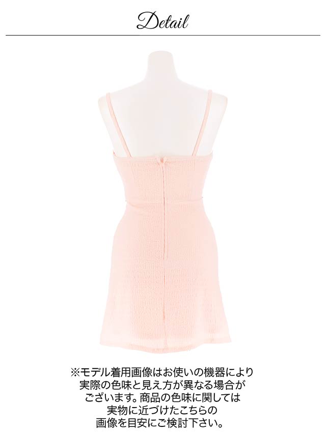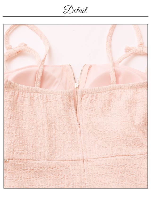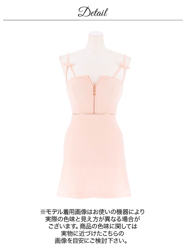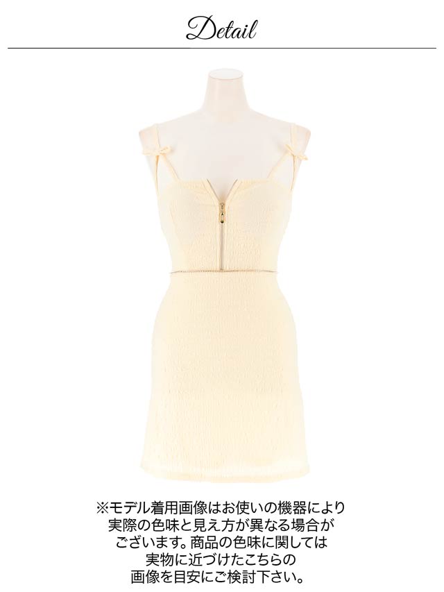 春ムード漂う淡いカラーとリボンディテールが可愛らしいキャミソールのキャバドレス。谷間見せを自在に調節できちゃうフロントジップ付きで、甘さと色っぽさを兼ね備えたデザイン!ウエストには高見えなビジューをあしらい、視線を上に集めてスタイルアップを叶えます◎
