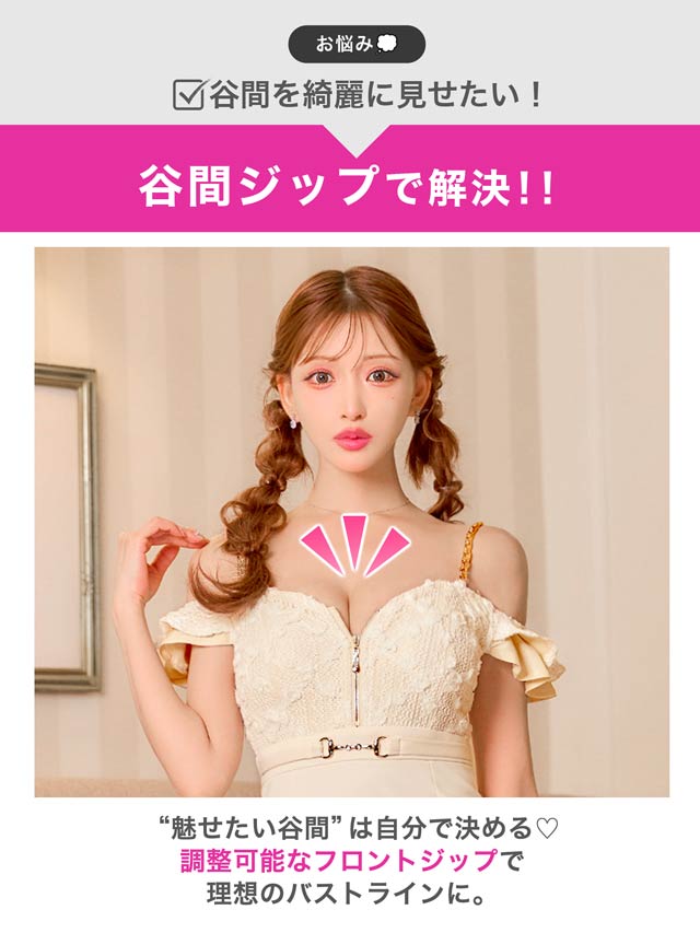 大胆なオフショルデザインとフロントジップで谷間を色っぽく魅せるキャバドレス。肩口のフリルがほどよく甘さをプラスし、女性らしい柔らかな印象を演出します♪ベルトモチーフをあしらったハイウエストの切り替えで脚長効果も抜群です!