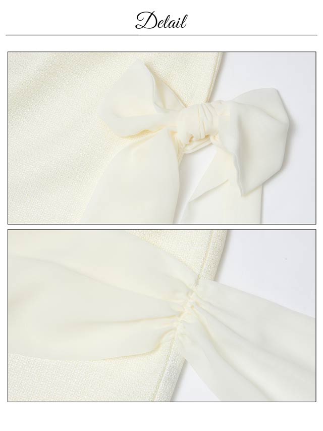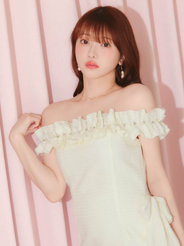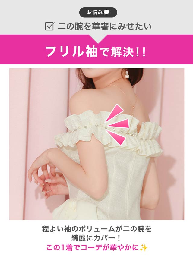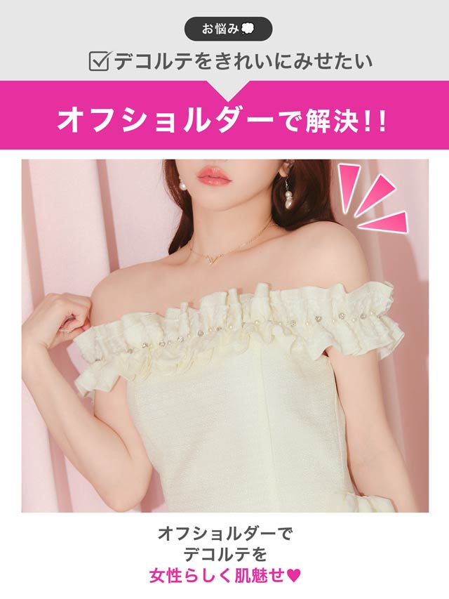 デコルテ部分のフリル×ワンショル風デザインが顔まわりを華やかに&可愛く演出するキャバドレス。タイトシルエットが甘さの中にもしっかり女っぽさをキープ。サイドに施された立体リボンのディテールが存在感抜群な1着です。