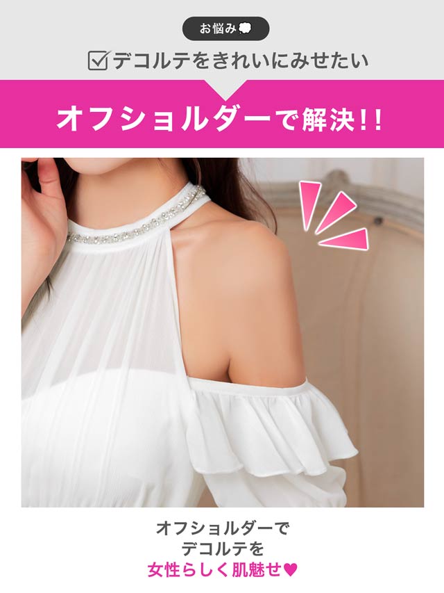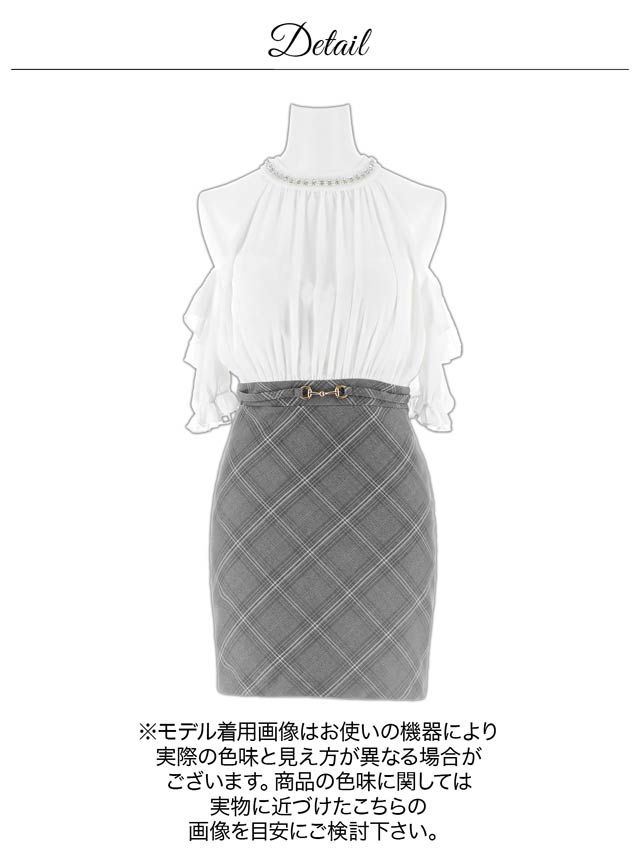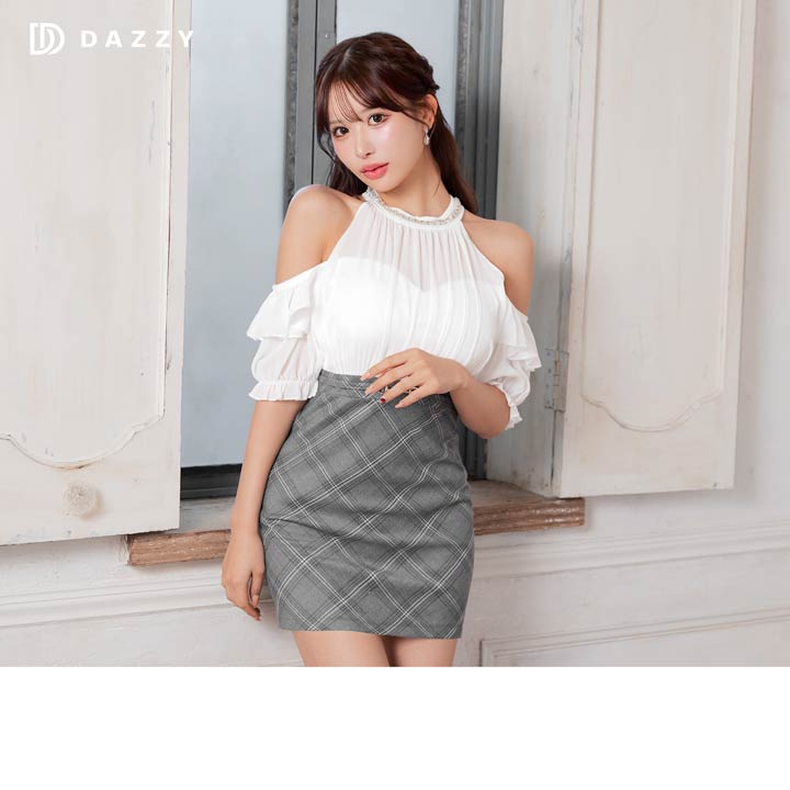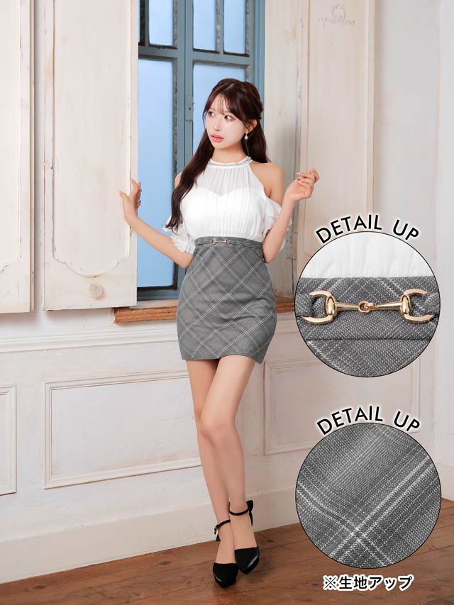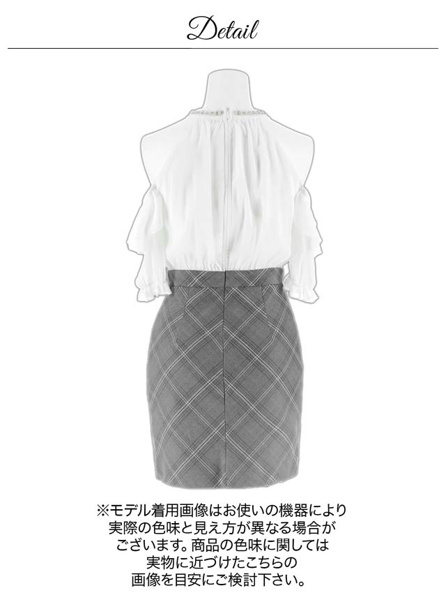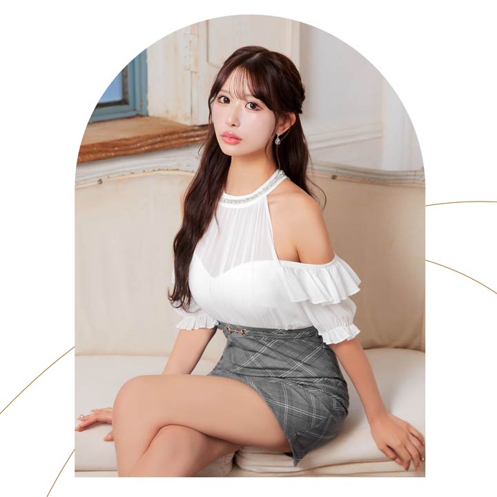 タイトなチェック柄スカートが甘すぎず程よく大人っぽい清楚系キャバドレス。ふんわりとしたシフォン素材のトップスが優しく女性らしい印象を演出します。華奢な肩魅せをアピールしつつオフショルで二の腕カバーも出来ちゃう1着です。