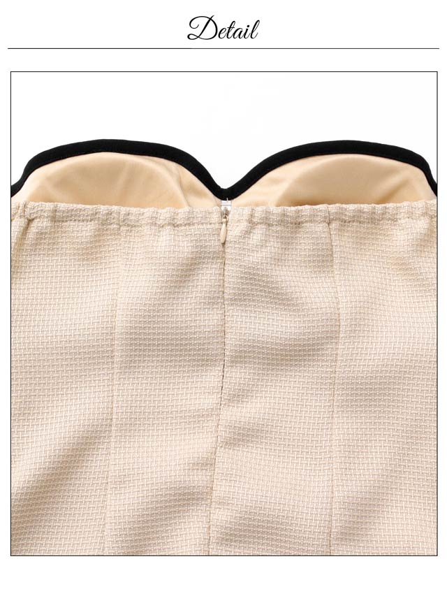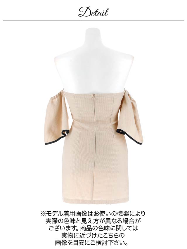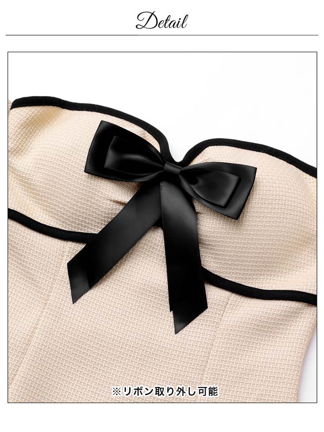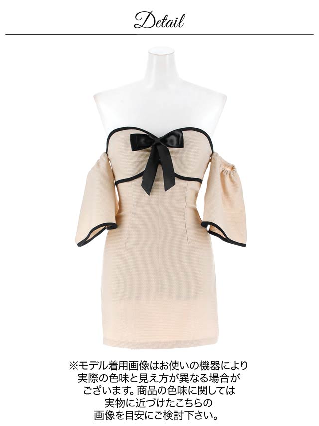 ベアトップデザインに胸元の大きなリボンが大人かわいいキャバドレス。パイピングラインが全体を引き締めメリハリのあるシルエットを演出します。ふんわりと広がるオフショル袖は腕周りのカバーにもおすすめな1着です。