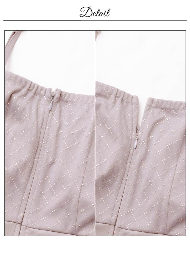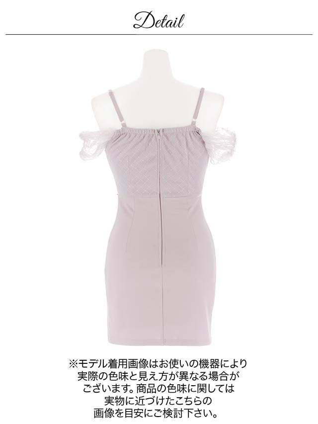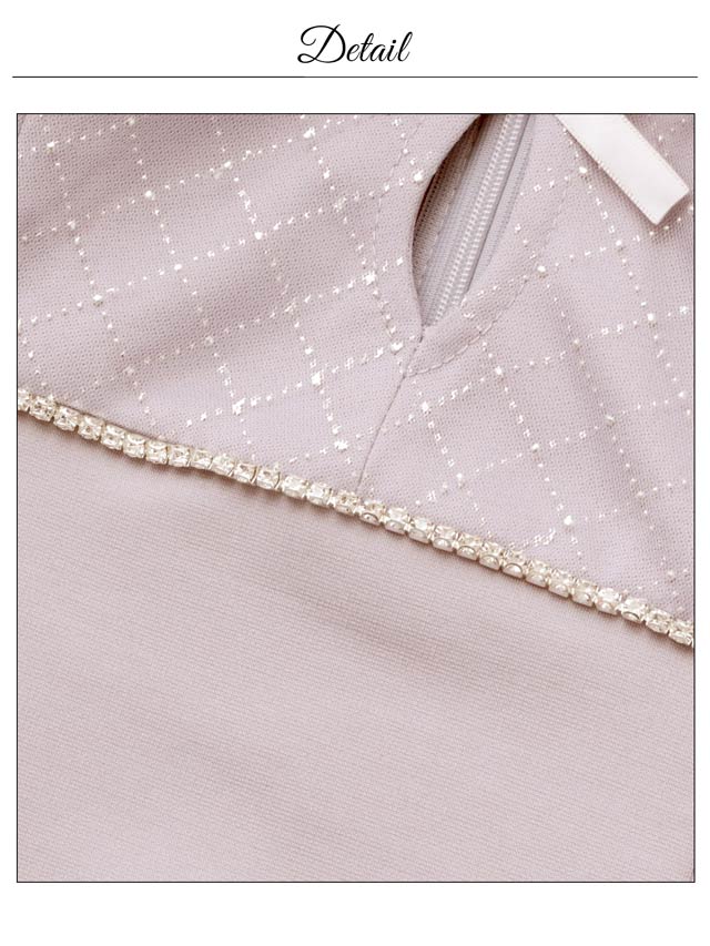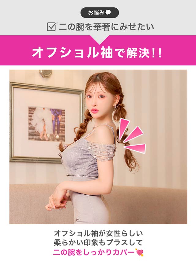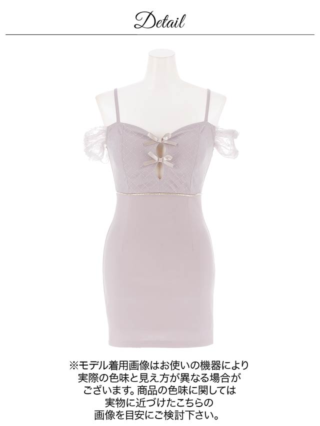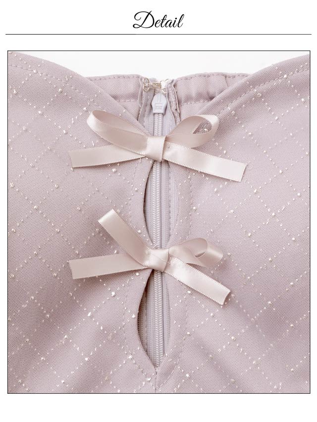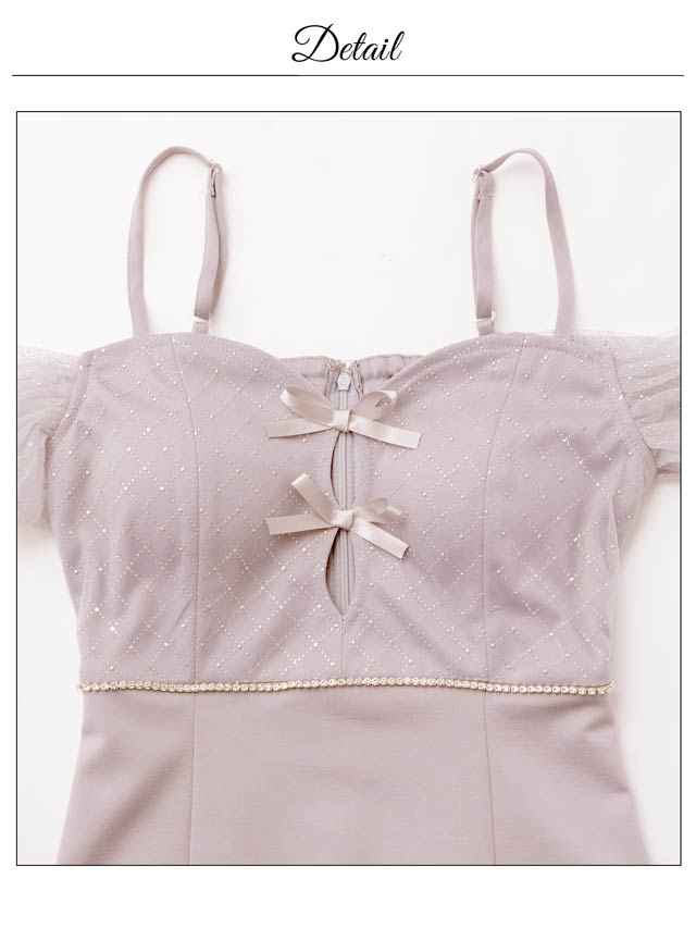 ビジュー使いのチェック柄とフロントのダブルリボンがキュートなキャバドレス。谷間ホールデザインで甘さの中にもしっかり視線を惹きつける一着。オフショルのチュールスリーブが二の腕をふんわりカバーし、華奢見え効果もばっちりです。