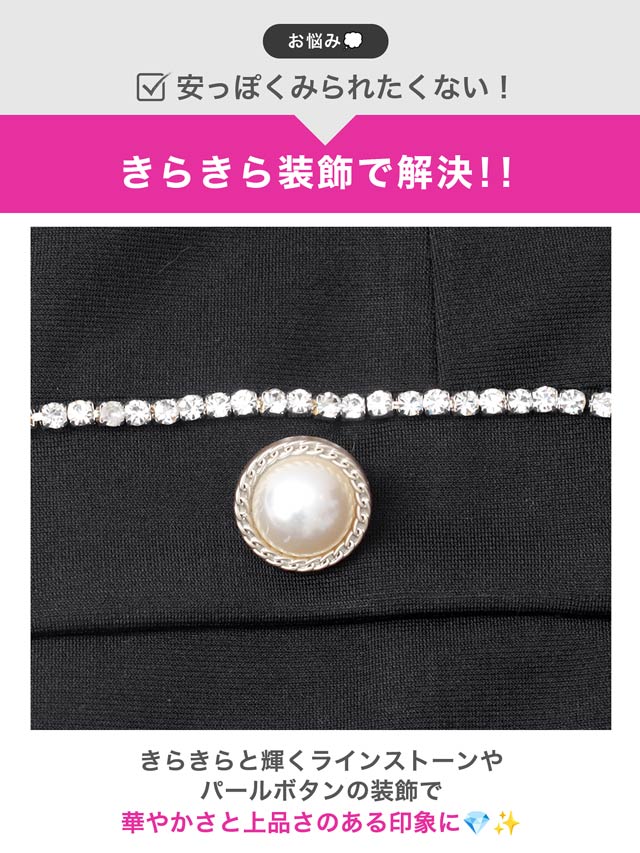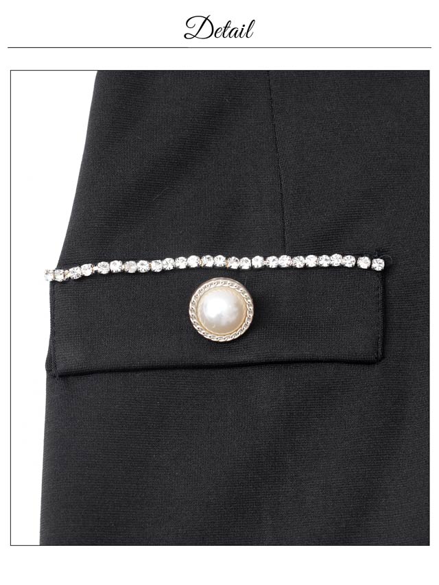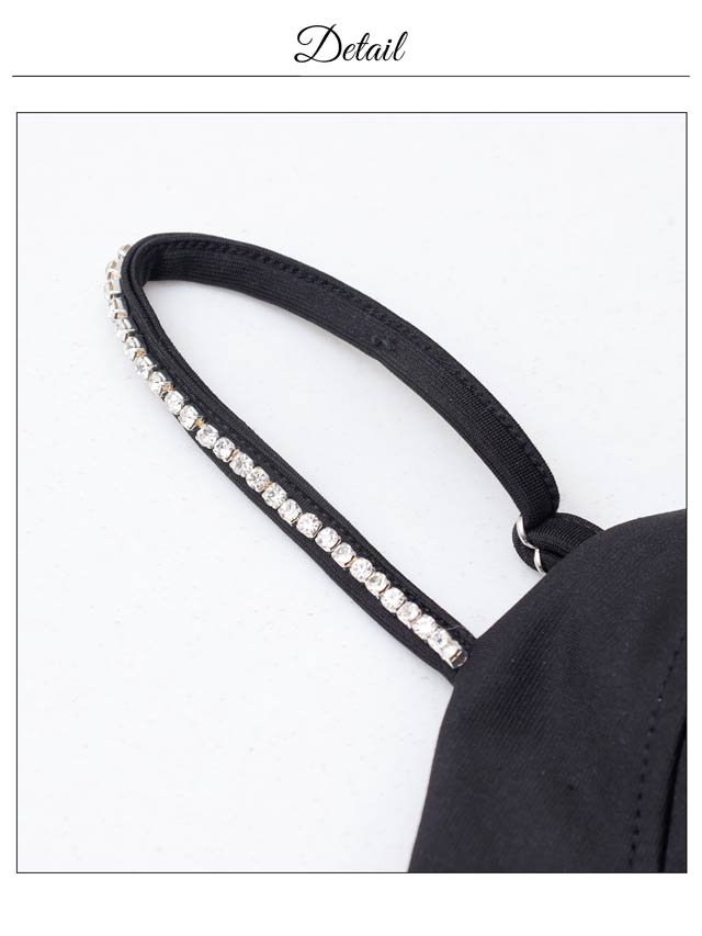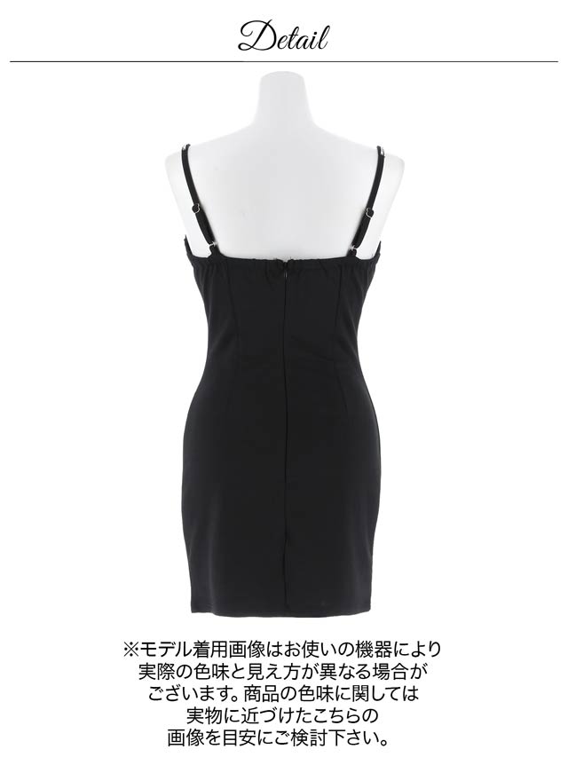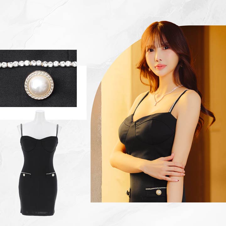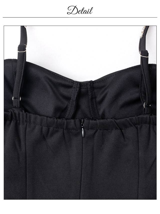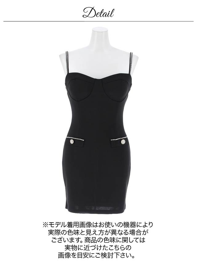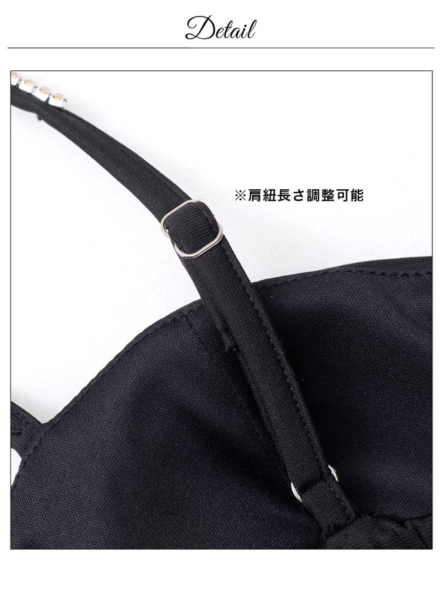 バストを強調する大胆なキャミソールデザインで、視線を惹きつけるセクシーなキャバドレス。きらきらと輝くラインストーンやパールボタンの装飾が華やかさをプラス♪肩紐はアジャスター付きなのでお好みのフィット感に調節できます。