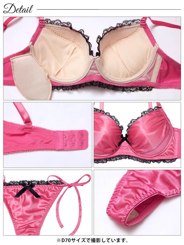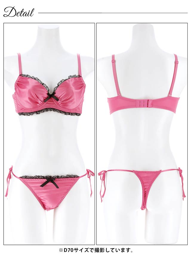 艶めくサテンと繊細なレースを組み合わせた、大人かわいいデザインが魅力のランジェリー。ブラックのレースとリボンがアクセントになり、全体を上品に引き締めます◎ショーツはセクシーな解けるサイド紐仕様なので特別な日にもぴったりです♪
