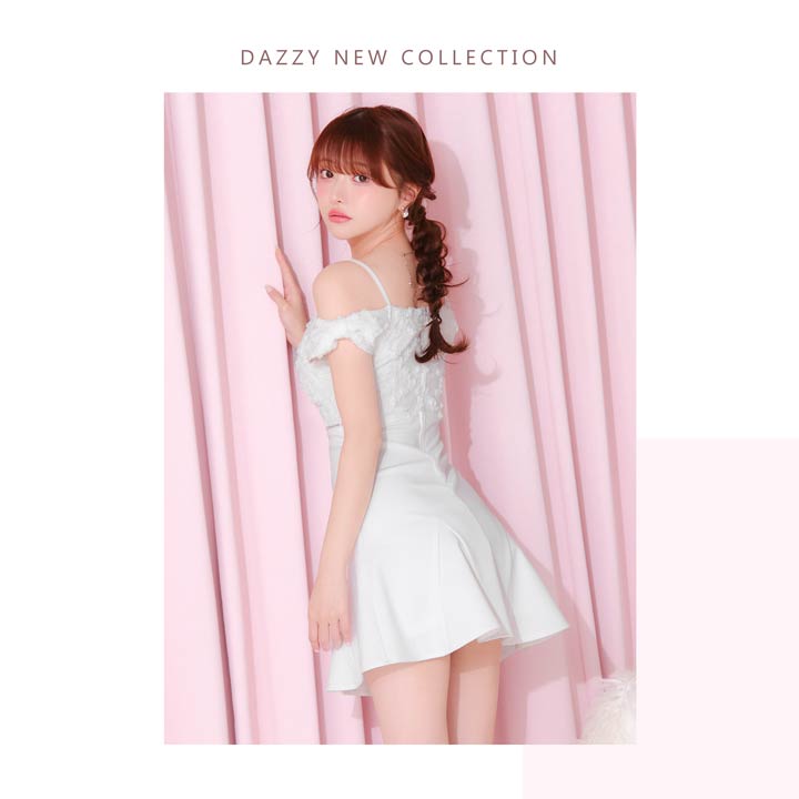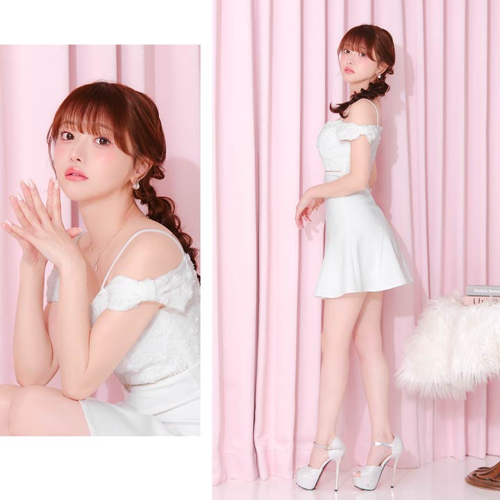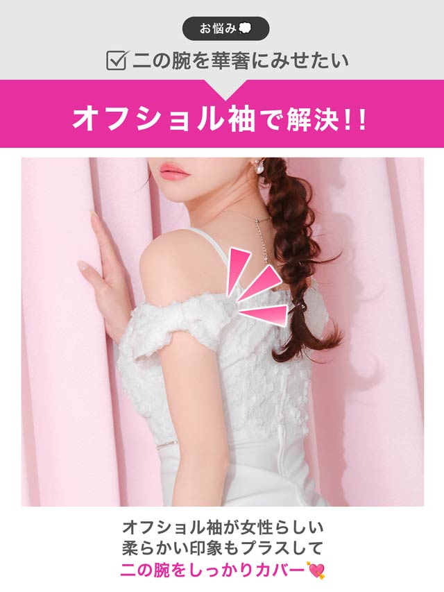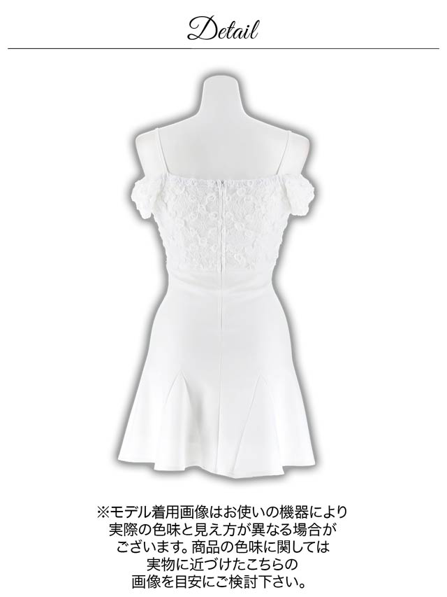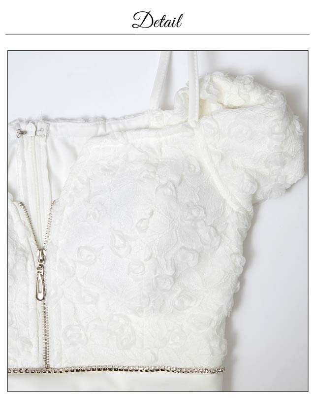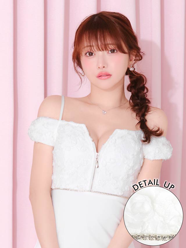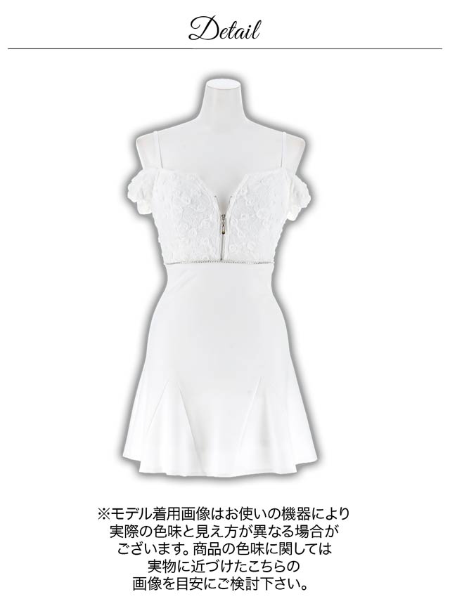 立体感のあるフラワーレースを贅沢にあしらったキャバドレス。フロントジップ仕様でさりげなく色気をプラスし、甘さの中に大人の雰囲気を漂わせます。ウエストに施されたビジューラインがくびれを強調してメリハリのあるシルエットを叶えます。