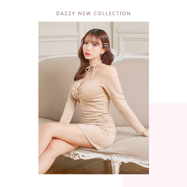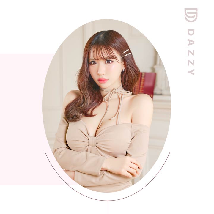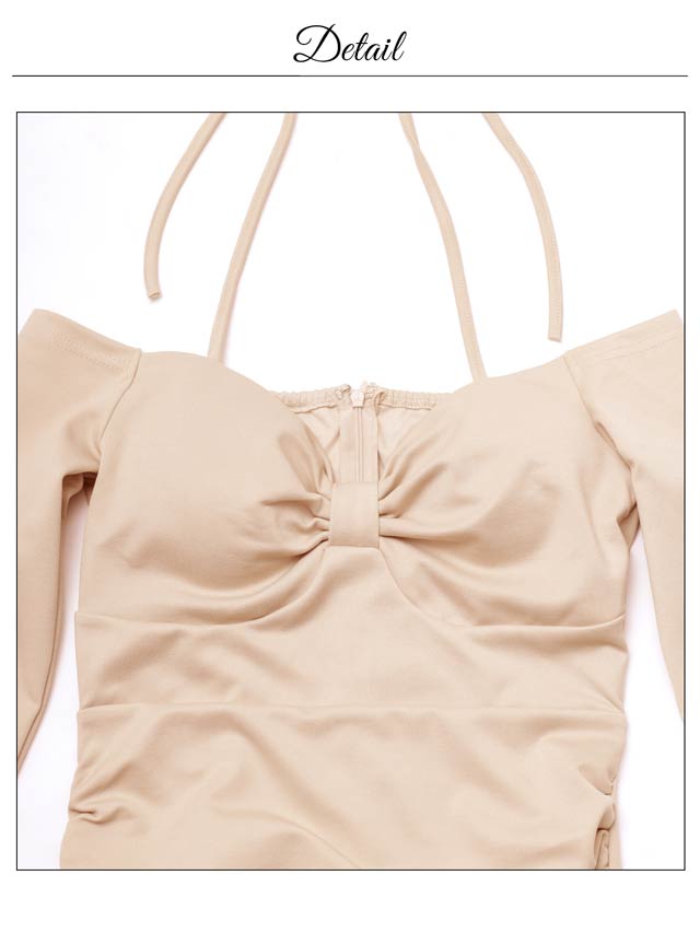 華奢なホルターデザインがデコルテに視線を集めるキャバドレス。胸元のリボンモチーフデザインがバストラインを立体的に魅せてくれるのもポイント。オフショル×長袖仕様で二の腕周りをさり気なくカバーしてくれる1着です。
