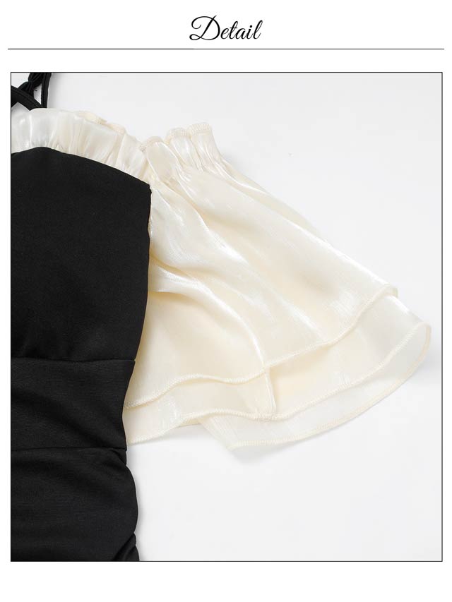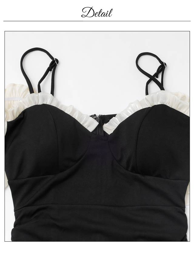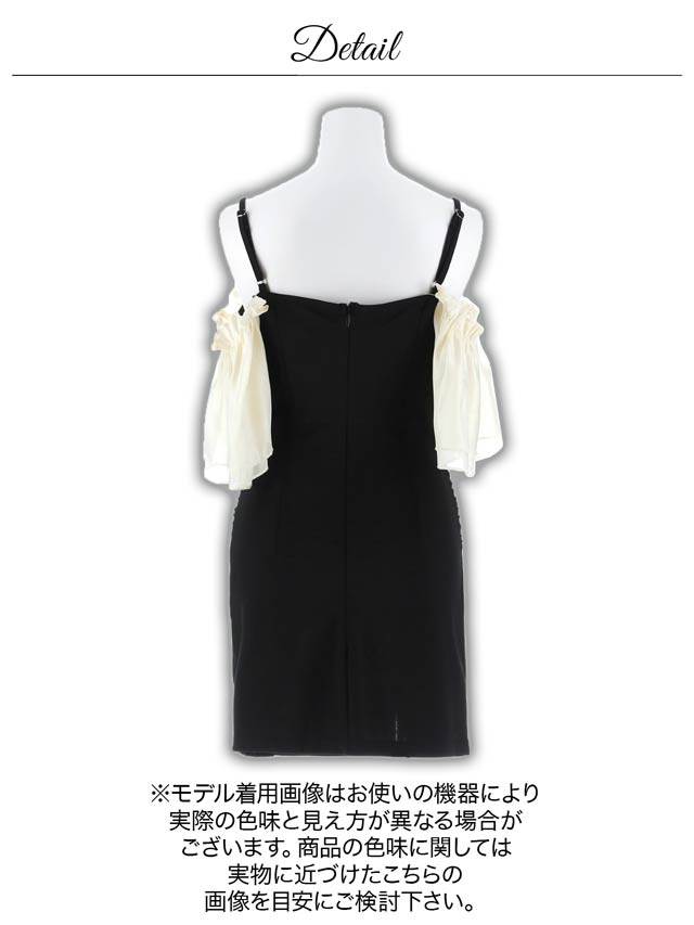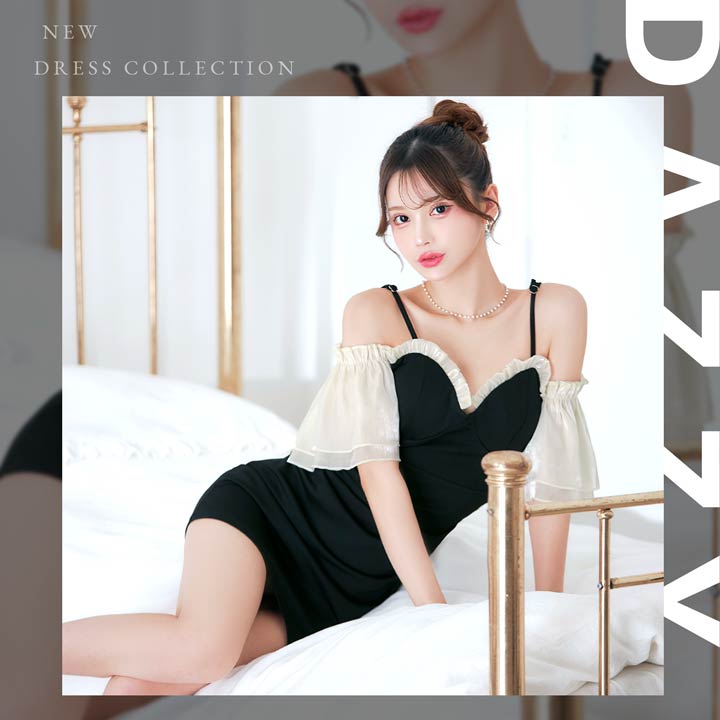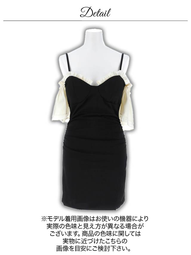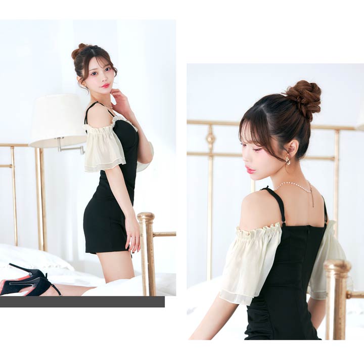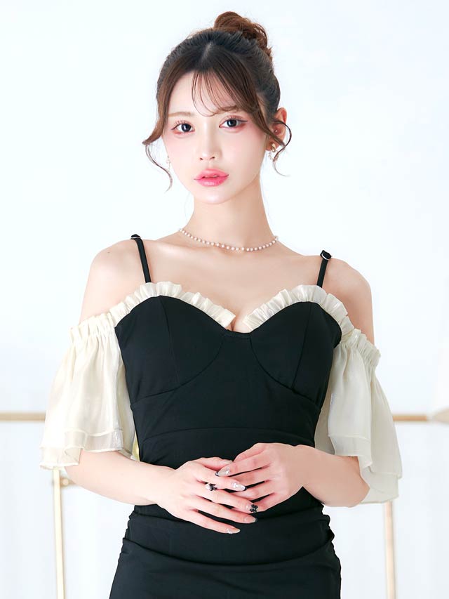 バイカラー配色のフリルラインが大人かわいいキャバドレス。大胆なオフショルスタイルは女性らしい華奢なデコルテや肩魅せを際立たせます◎ スリット入りのタイトなシルエットが大人の色気とスタイルの良さを引き立てる1着です。