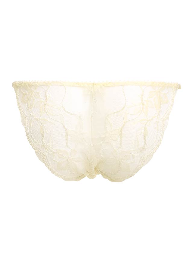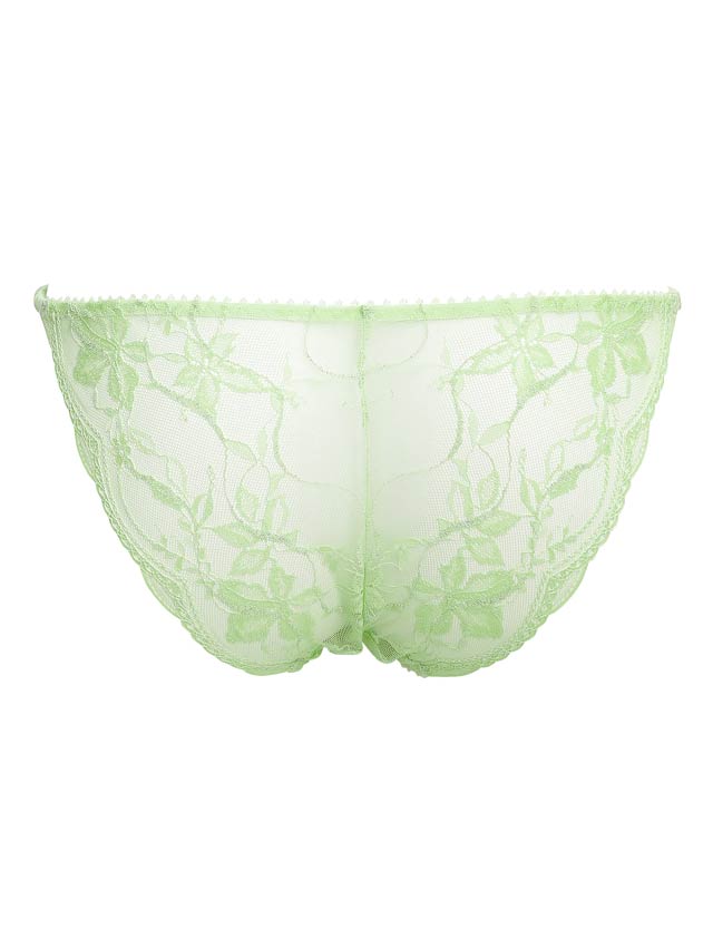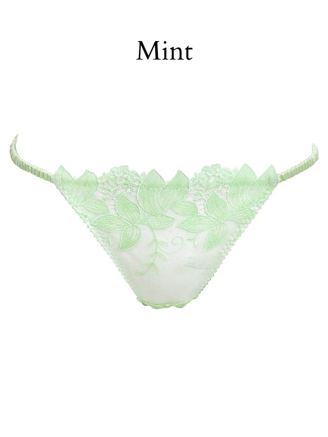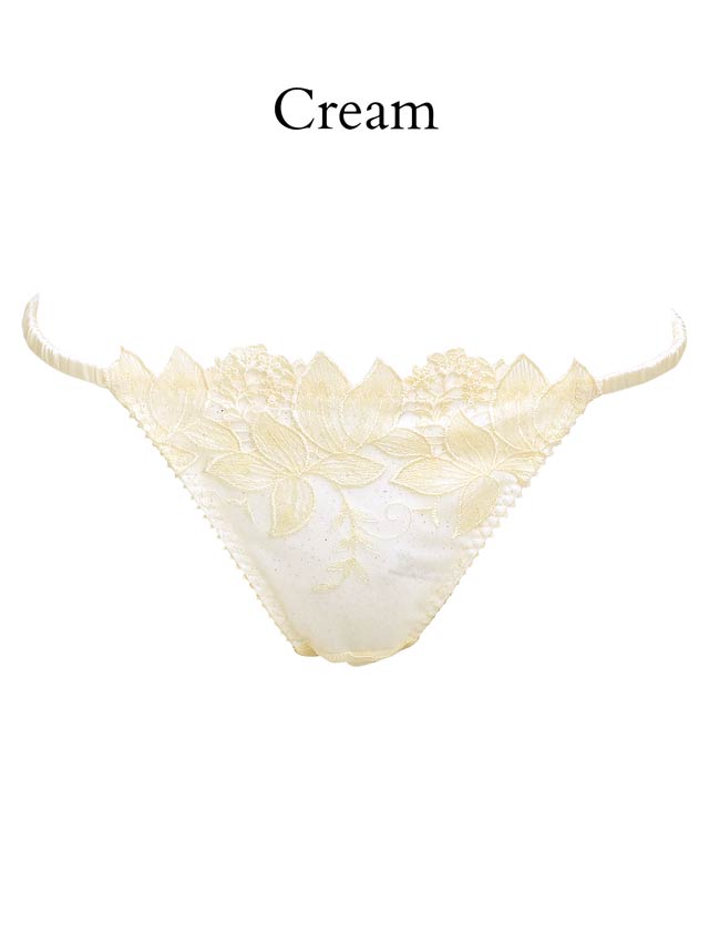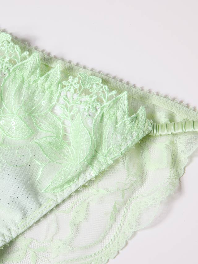 妖精の羽を思わせる美しいエンブロイダリーレースに、ストレッチシルクを沿わせた高級ランジェリー。エンブロイダリーレースにはスパンコールが入り込まれており、雨に濡れて艶やかな輝きを見せる妖精の羽を思わせます。レース下にはより一層輝きが増すようラメチュールを入れて、上品な光沢感のストレッチシルクで包み込みすっきりと仕上げました。 ショーツ脇部分には、人の肌に一番近い繊維と言われるシルクを使用。肌あたりなめらかで、乾燥を防いでくれます。ラメ入りの繊細なストレッチレースをショーツバックに使用。 妖精をイメージしたMINTとCREAMの2色展開。春風をまとったランジェリーです。