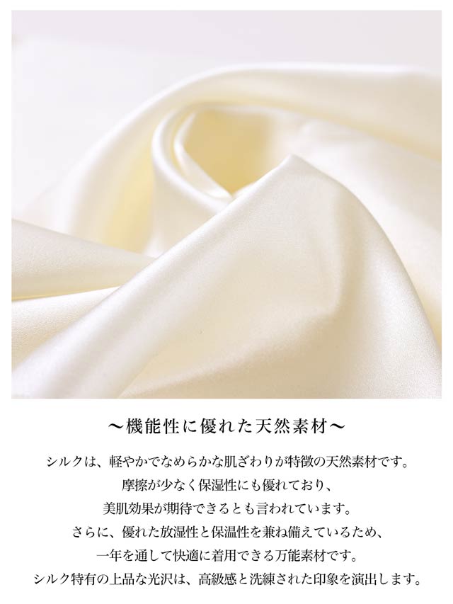 ショーツ脇部分には、人の肌に一番近い繊維と言われるシルクを使用。肌あたりなめらかで、乾燥を防いでくれます。ラメ入りの繊細なストレッチレースをショーツバックに使用。
