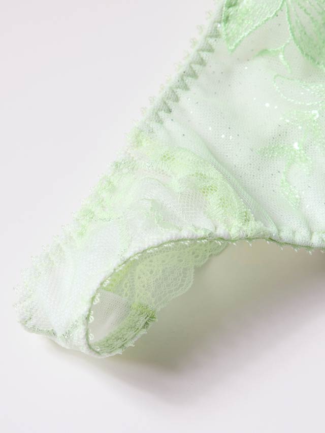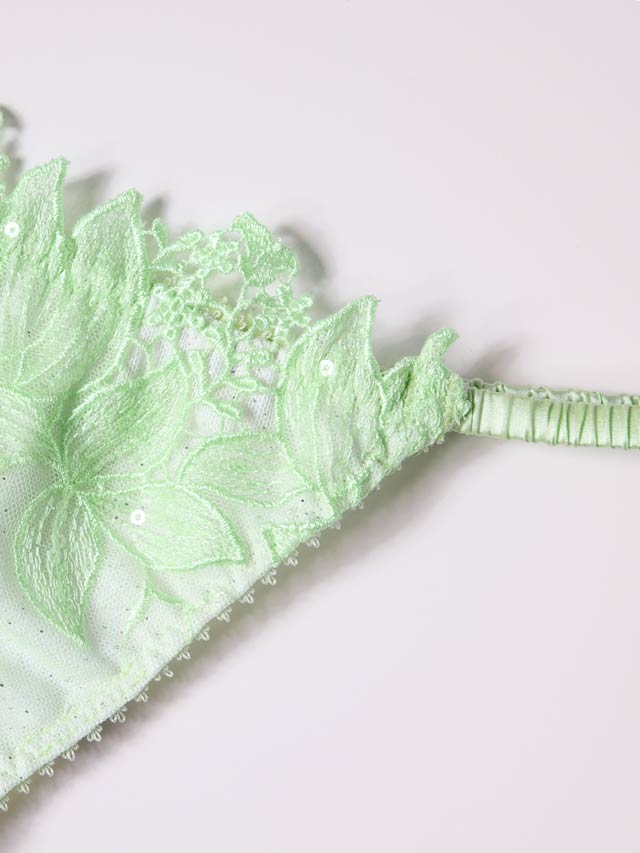 妖精の羽を思わせる美しいエンブロイダリーレースに、ストレッチシルクを沿わせた高級ランジェリー。エンブロイダリーレースにはスパンコールが入り込まれており、雨に濡れて艶やかな輝きを見せる妖精の羽を思わせます。レース下にはより一層輝きが増すようラメチュールを入れて、上品な光沢感のストレッチシルクで包み込みすっきりと仕上げました。