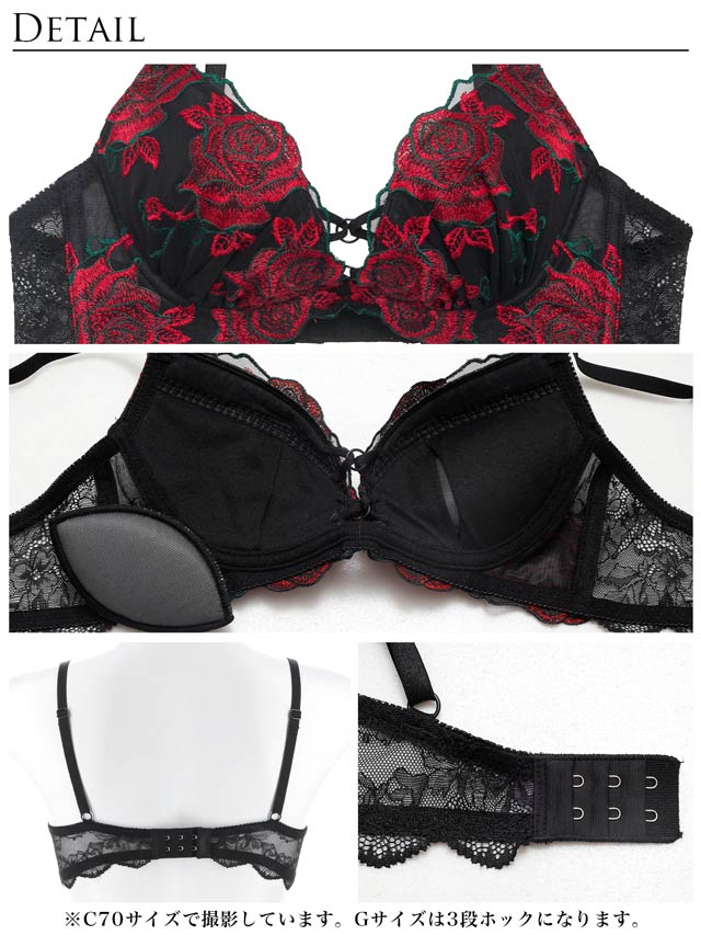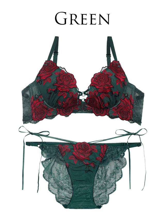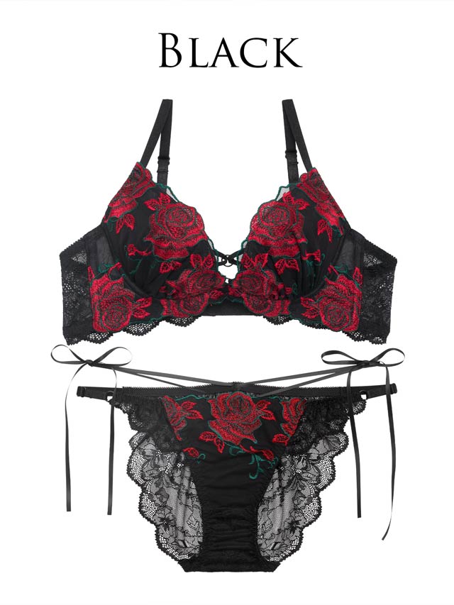大ぶりで真っ赤な薔薇の刺繍が施された大人セクシーなランジェリー。中心のコードとリングで美しい谷間魅せを叶え、色気アップ♪ショーツはほどけるリボン付きで更にセクシー。細めのリボンで腰元が華奢見えします◎