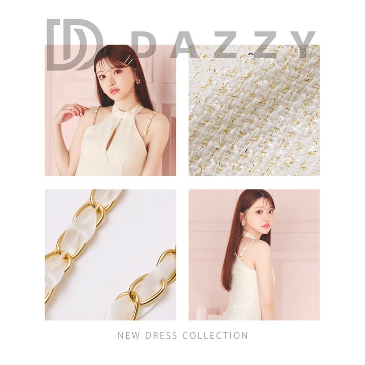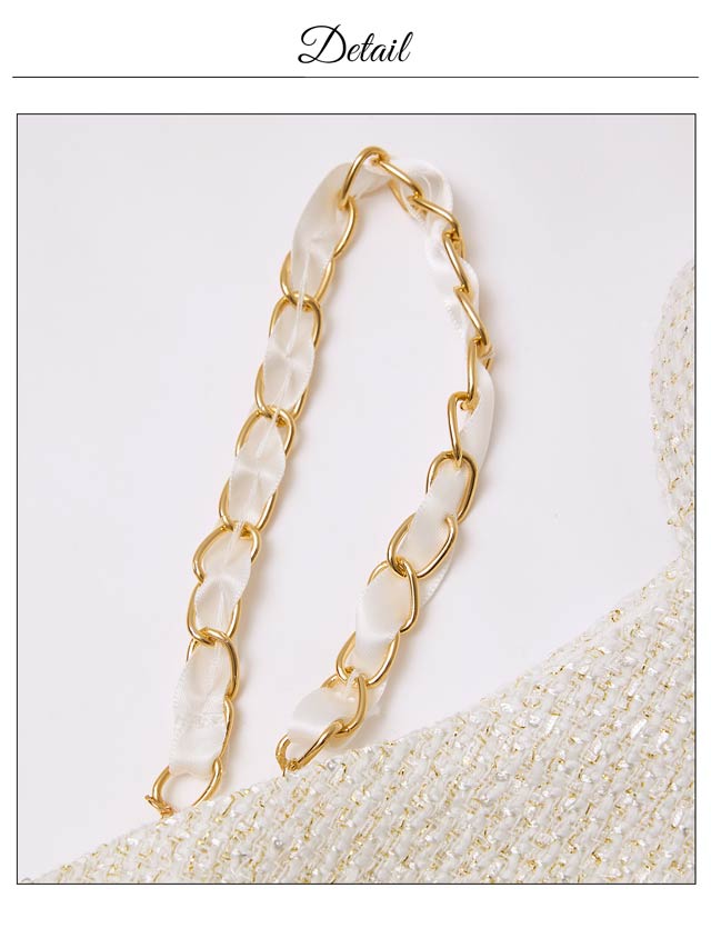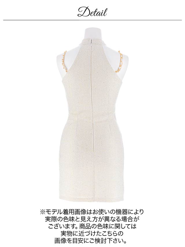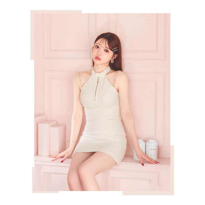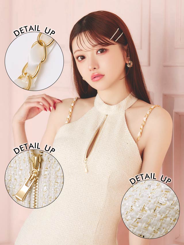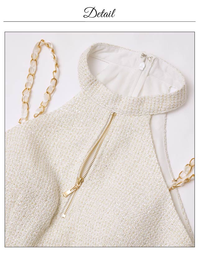 清潔感と上品さを兼ね備えたホワイトカラーのツイードドレス。女性らしさ漂うアメスリデザインとゴールドチェーンの組み合わせが印象的◎調節自在なジップ付きで、胸元を隠したり谷間魅せをしたりお好みでアレンジできるのもポイントです♪