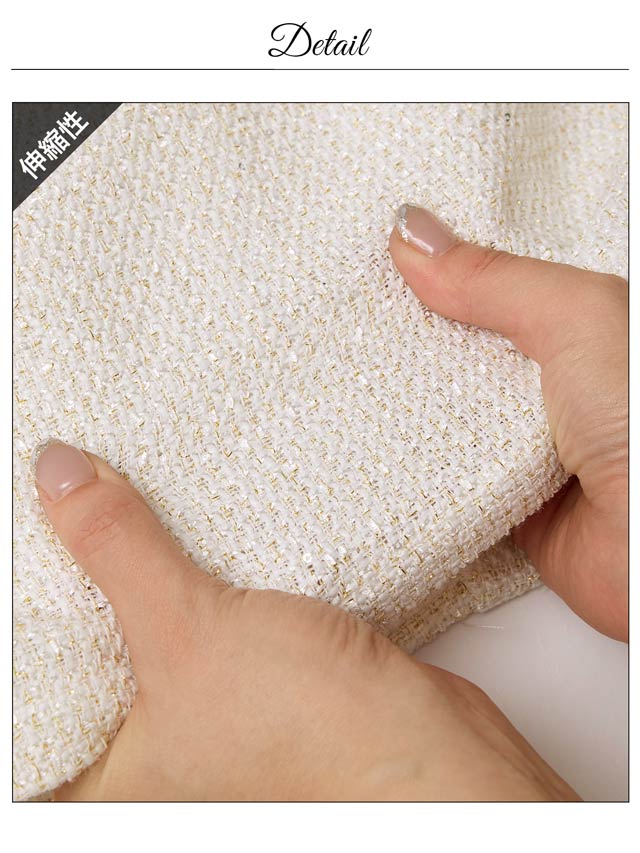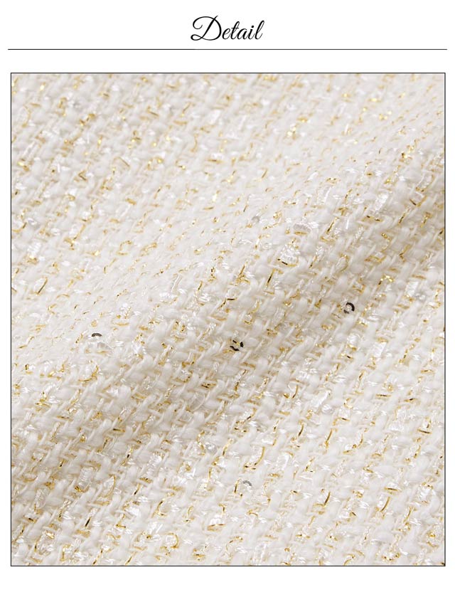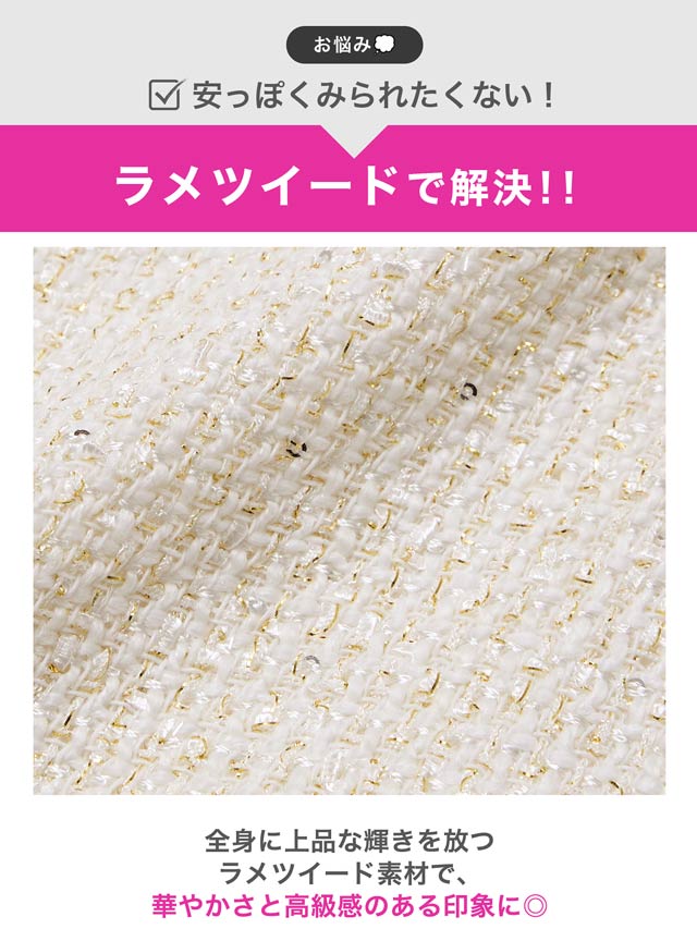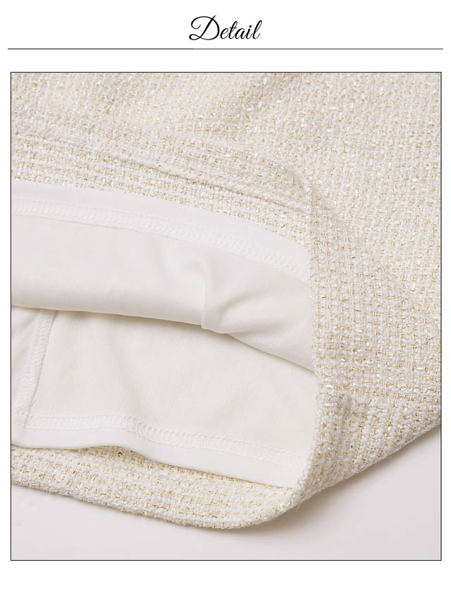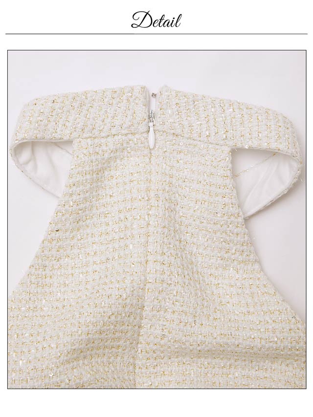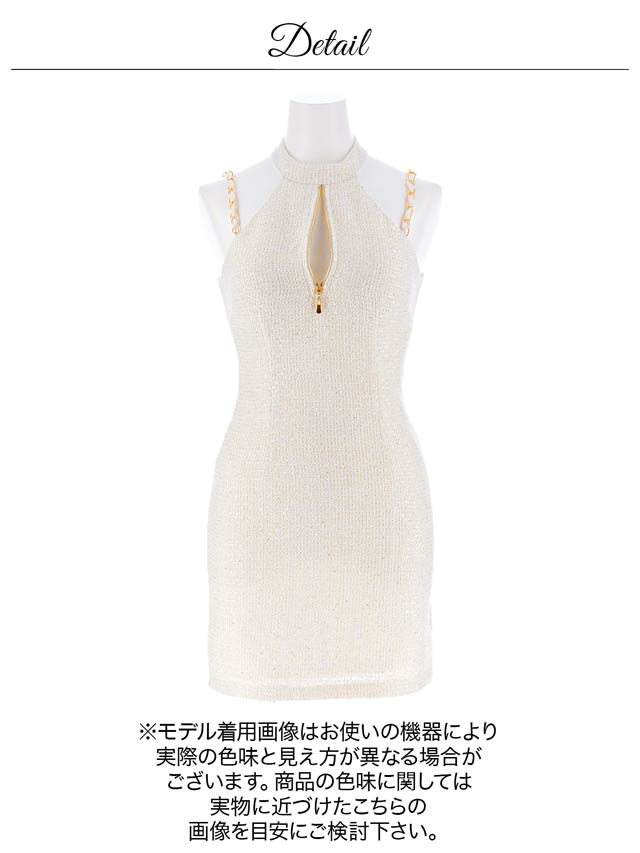 清潔感と上品さを兼ね備えたホワイトカラーのツイードドレス。女性らしさ漂うアメスリデザインとゴールドチェーンの組み合わせが印象的◎調節自在なジップ付きで、胸元を隠したり谷間魅せをしたりお好みでアレンジできるのもポイントです♪