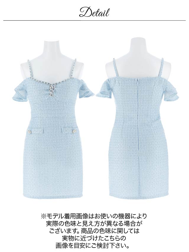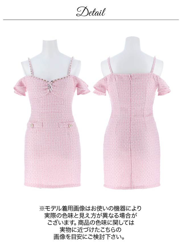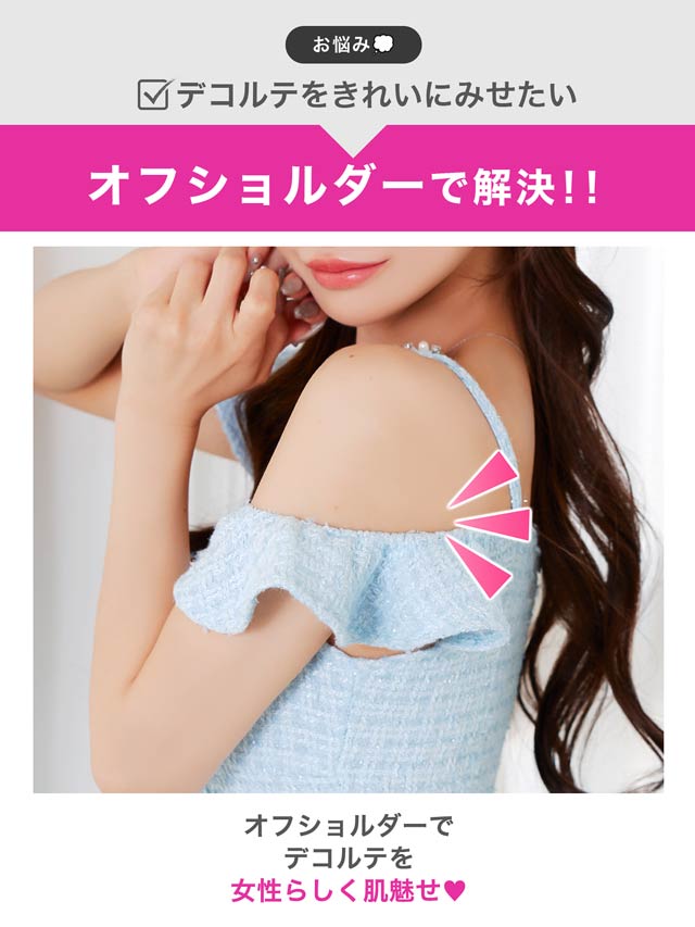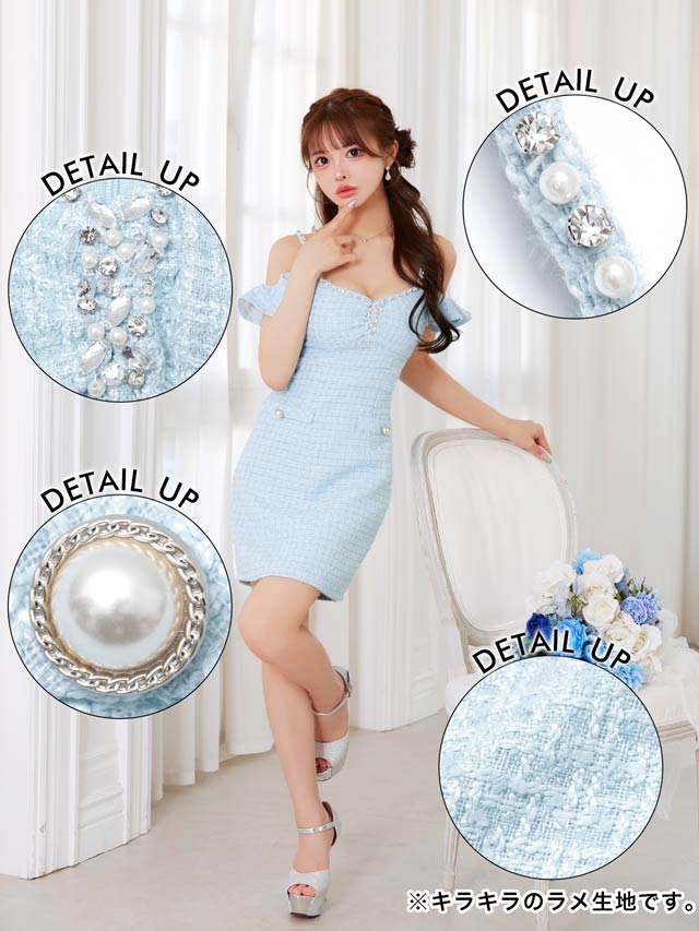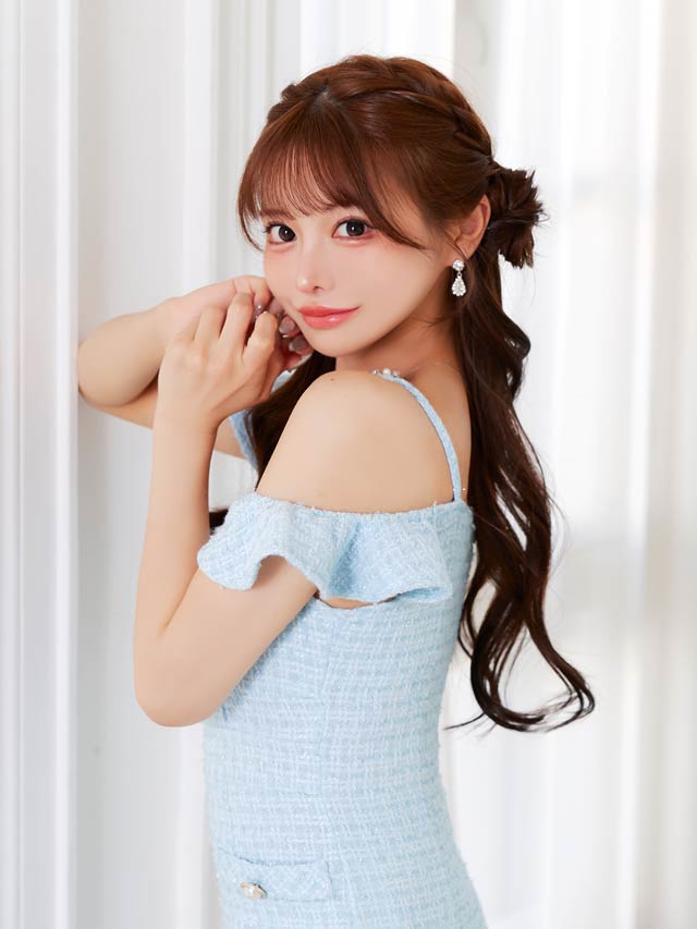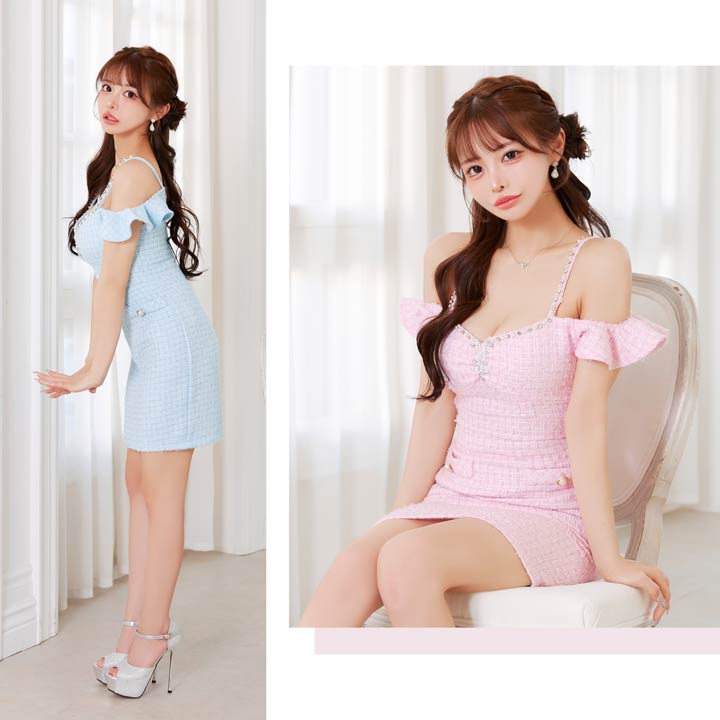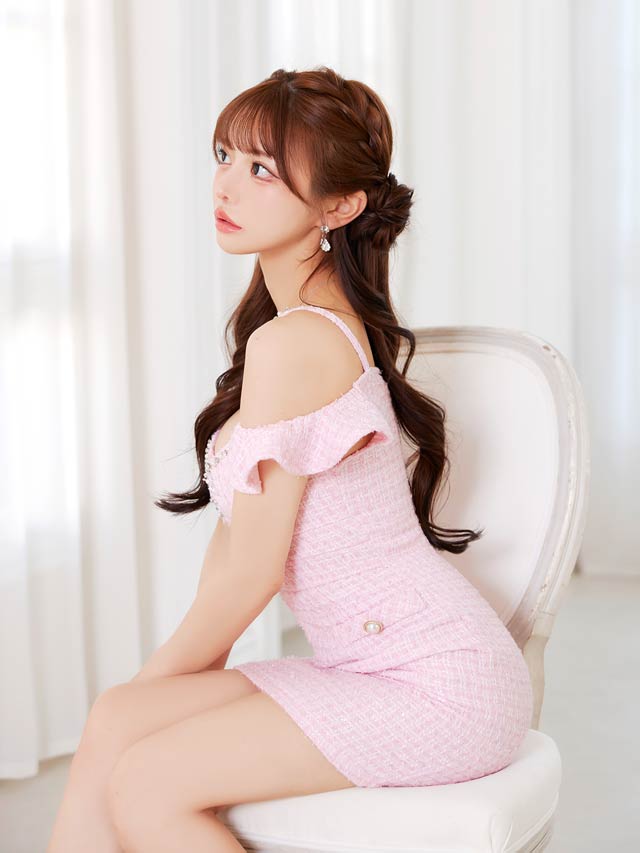 淡いカラーのツイード生地にきらめくビジューをあしらい、春らしい華やかさを演出するキャバドレス。オフショルデザインでデコルテを美しく見せ、可愛らしさの中にさりげない色気もプラスします。肩口のフリルがやわらかな印象を添え、女性らしさを引き立てる一着です♪