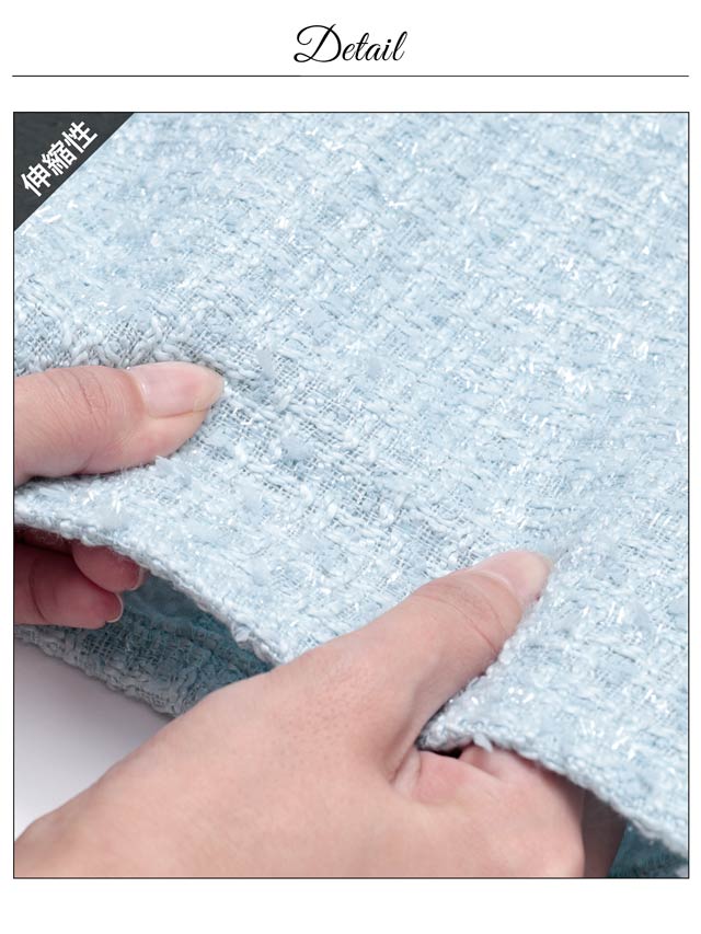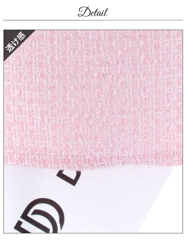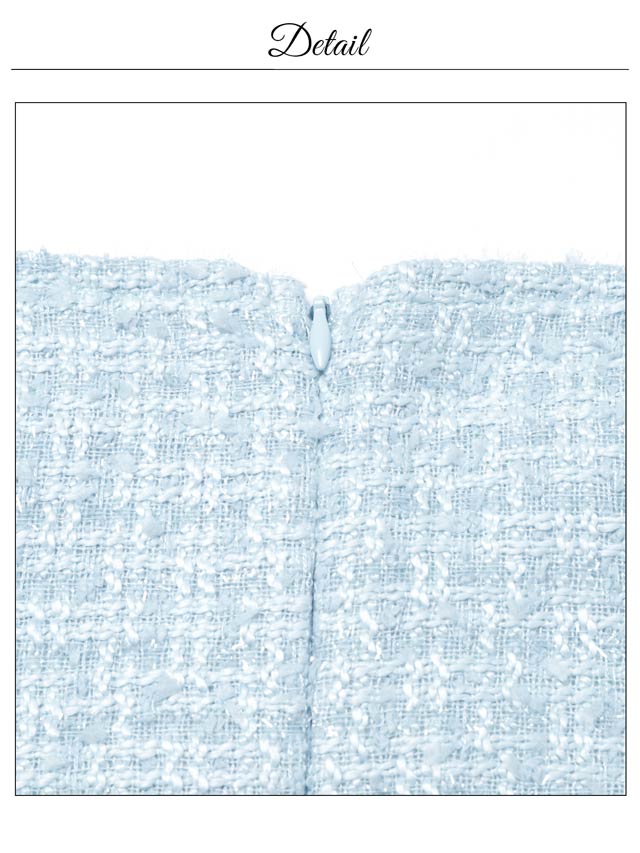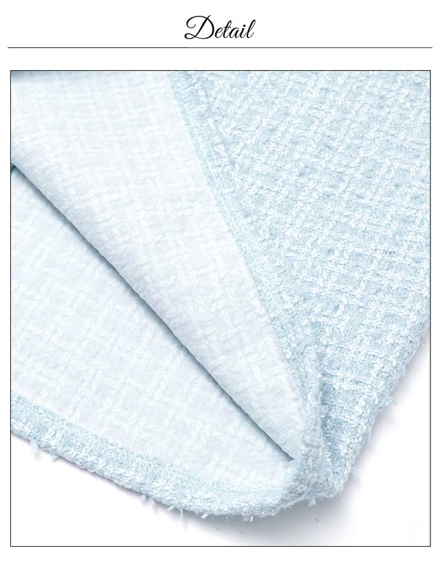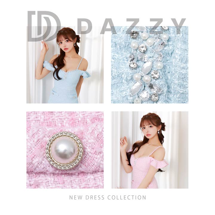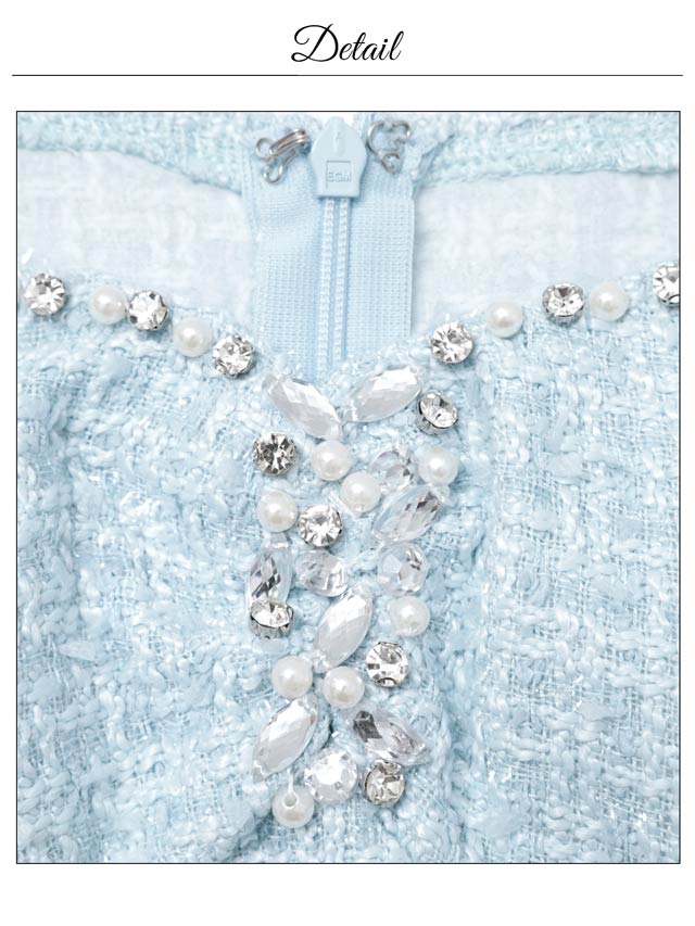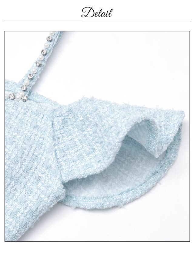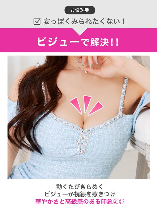 淡いカラーのツイード生地にきらめくビジューをあしらい、春らしい華やかさを演出するキャバドレス。オフショルデザインでデコルテを美しく見せ、可愛らしさの中にさりげない色気もプラスします。肩口のフリルがやわらかな印象を添え、女性らしさを引き立てる一着です♪