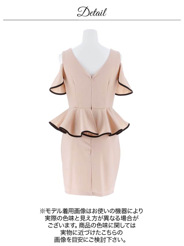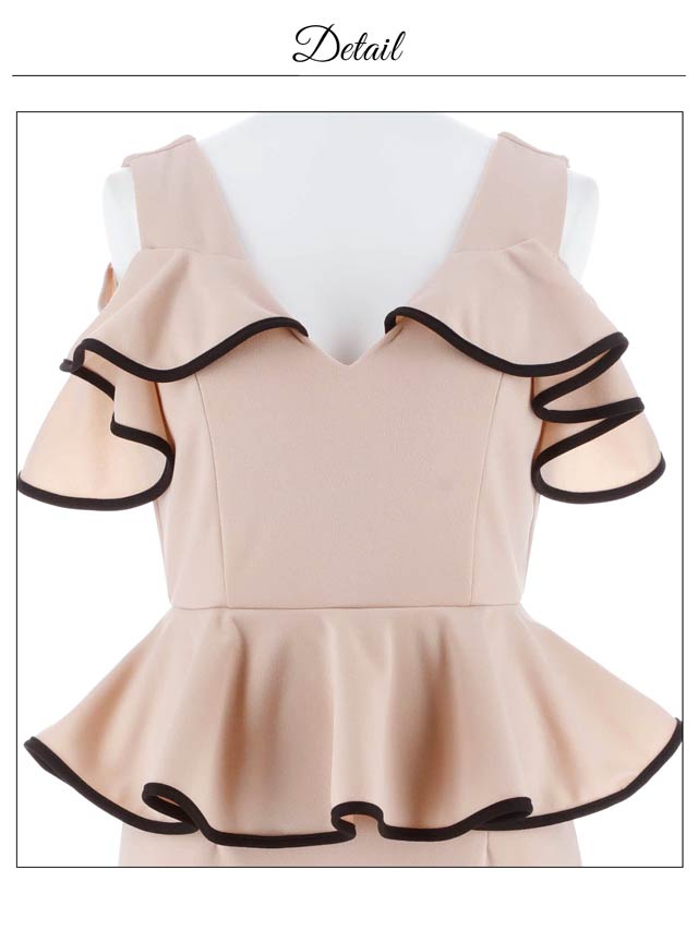 大人上品なベージュカラーにブラックのパイピングがアクセントになったミニドレス。ちらっと肌見せする肩あきデザイン&ふんわりフリルがあざと可愛いポイント♪ウエストにはペプラム付きで気になるお腹まわりもおしゃれにカバーできます◎