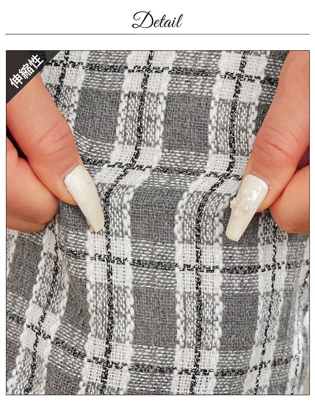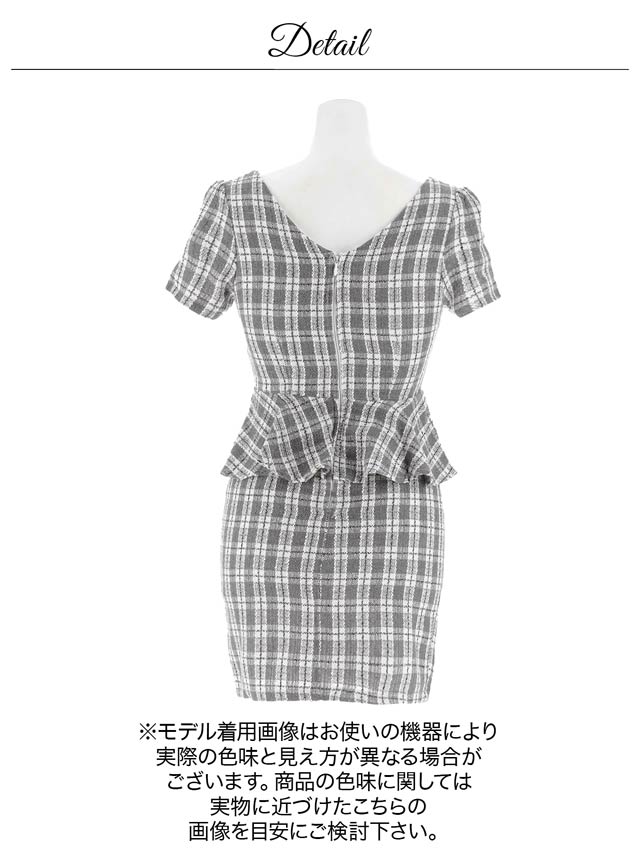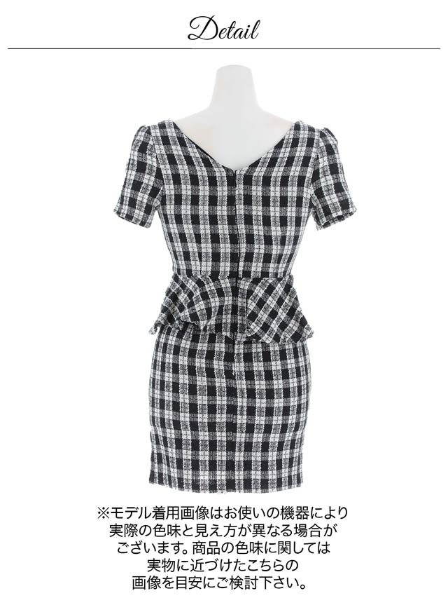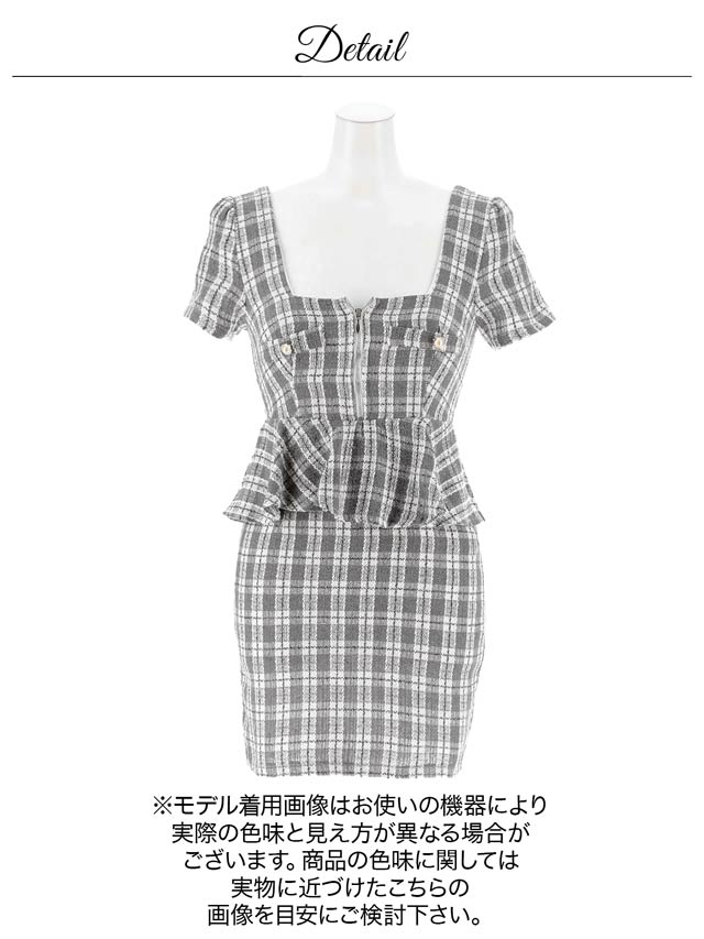 全面チェック柄のペプラムシルエットが可愛らしいミニドレス。デコルテを綺麗に見せてくれるスクエアネックにフロントジップ仕様で色気もばっちり◎ ハイウエスト切り替えでスタイルアップ効果を与えてくれる1着です。