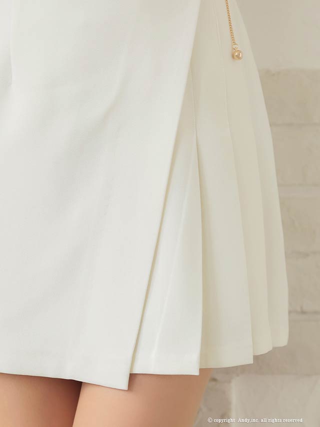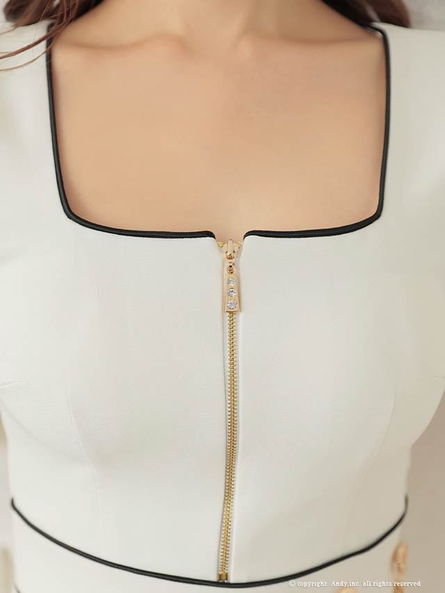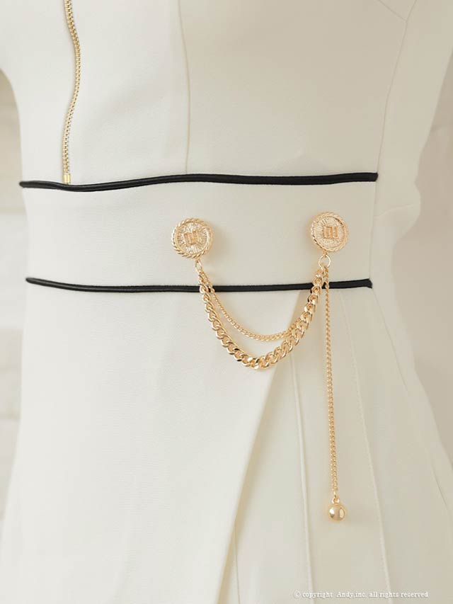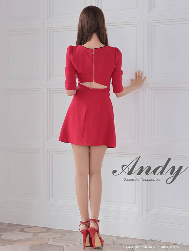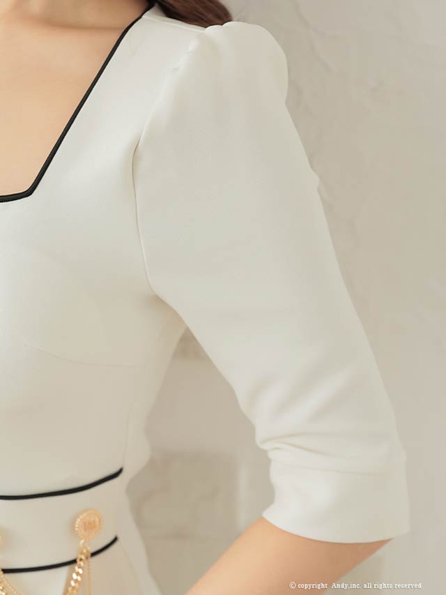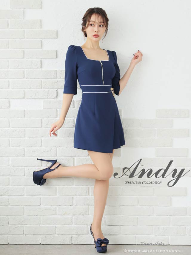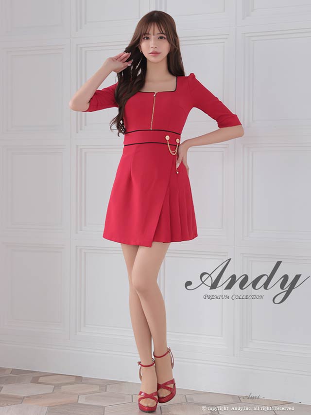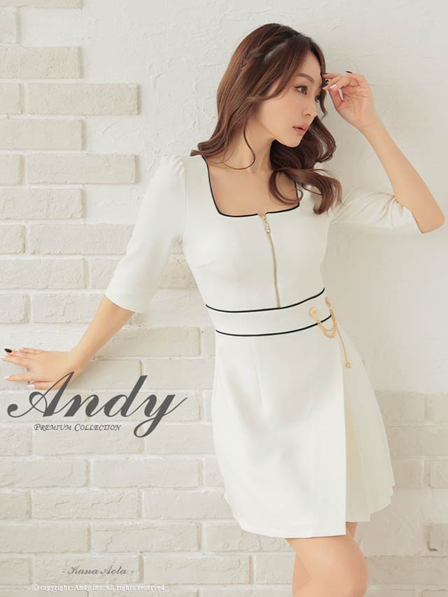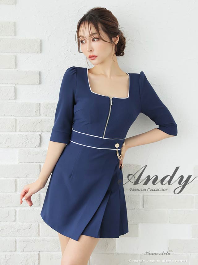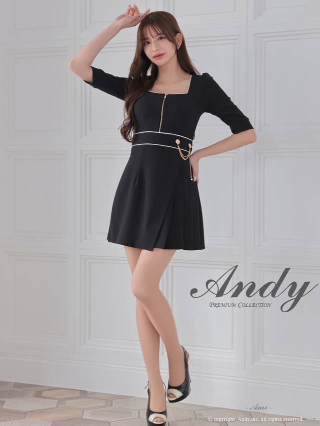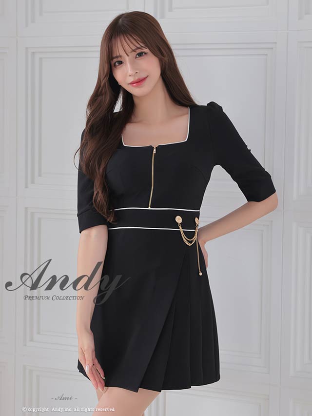3/5新作![Andy]パイピングジップウエストチェーン七分袖プリーツAラインミニ丈キャバドレス[AN-ON2823]