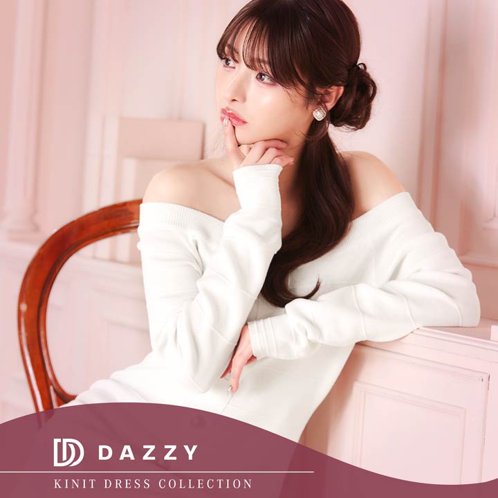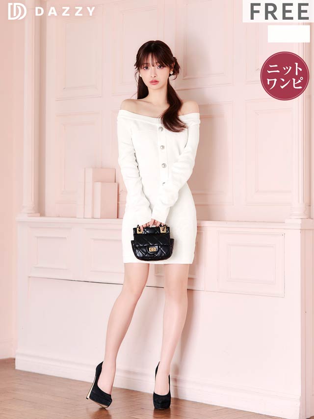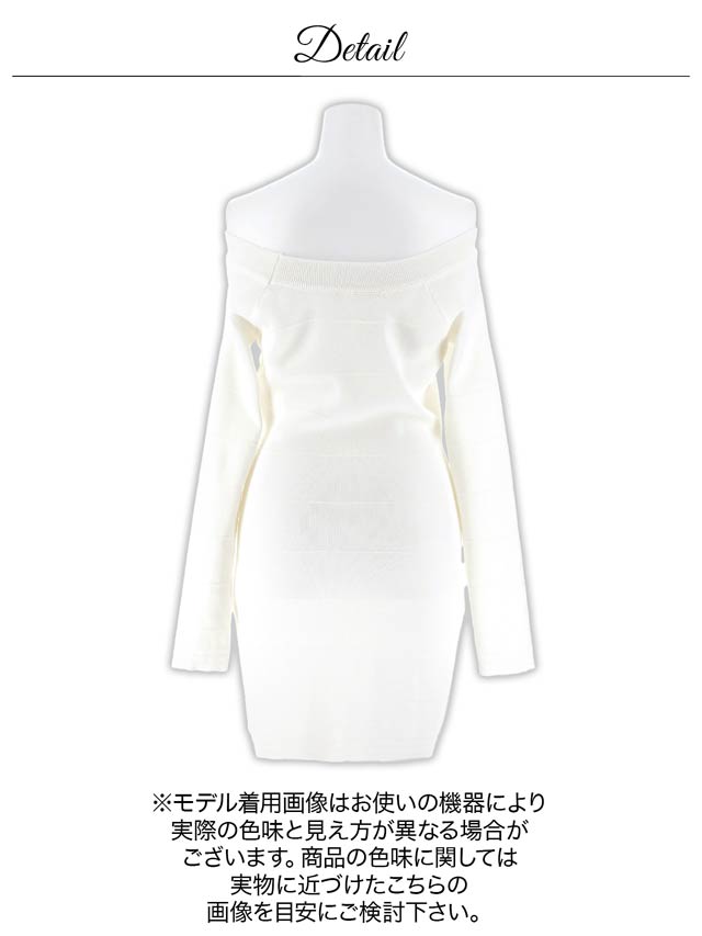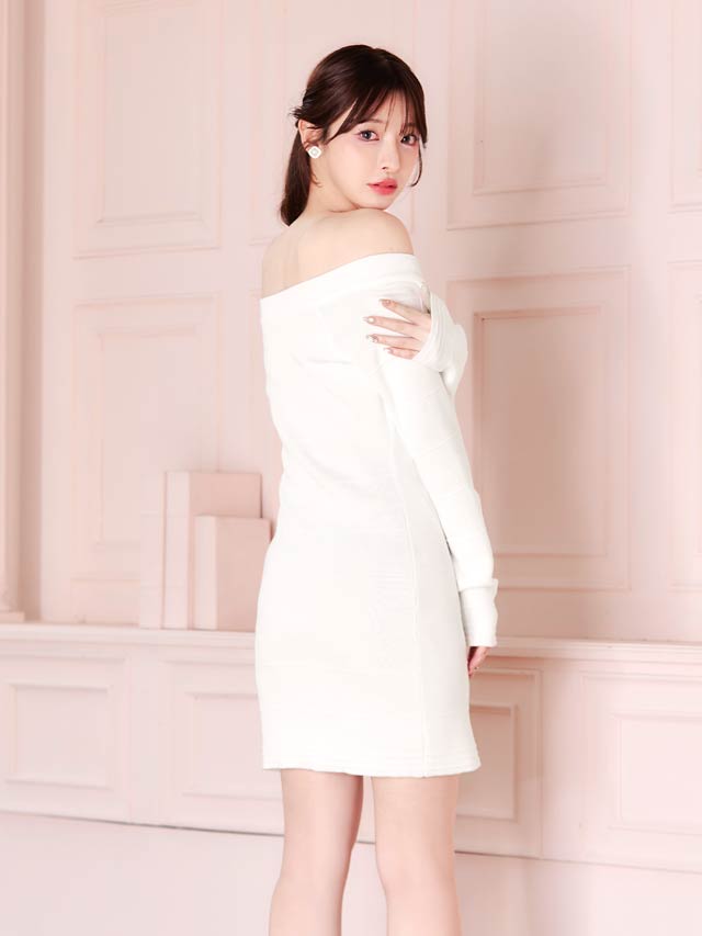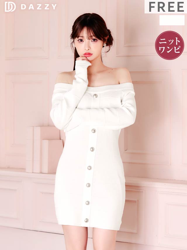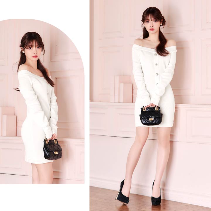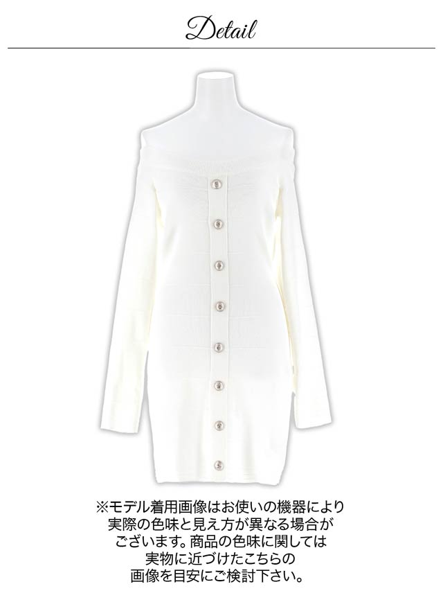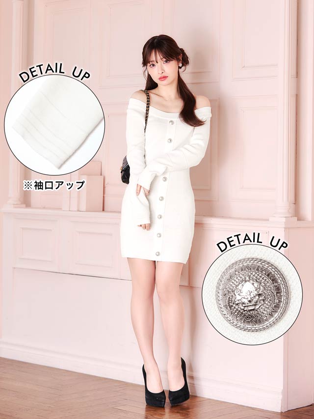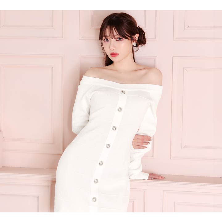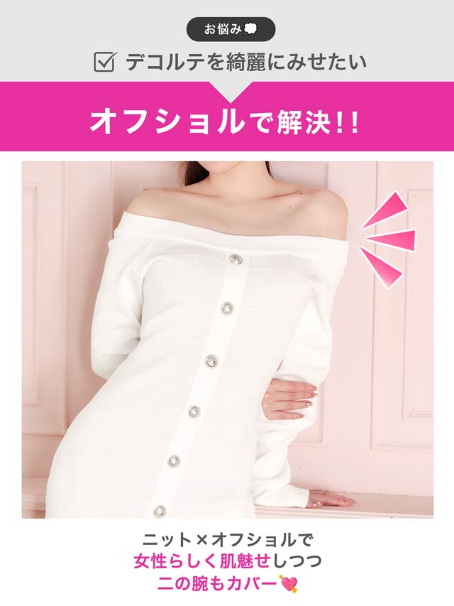 デコルテを美しく見せてくれるシンプルなオフショルニットワンピース。フロントの飾りボタンがさりげないアクセントに◎上品さと色っぽさを兼ね備えたデザインで、ラウンジなどお仕事はもちろん私服としても活躍する一着です!