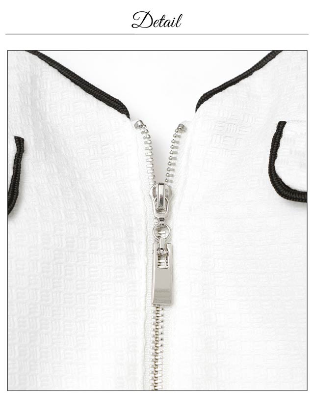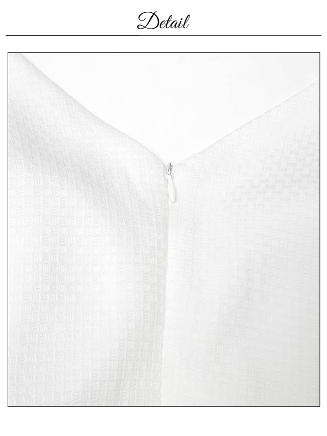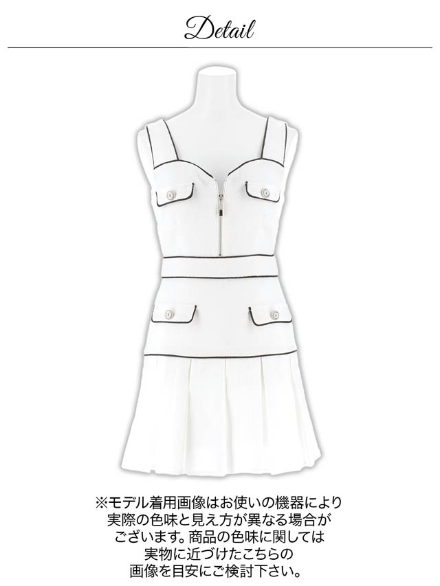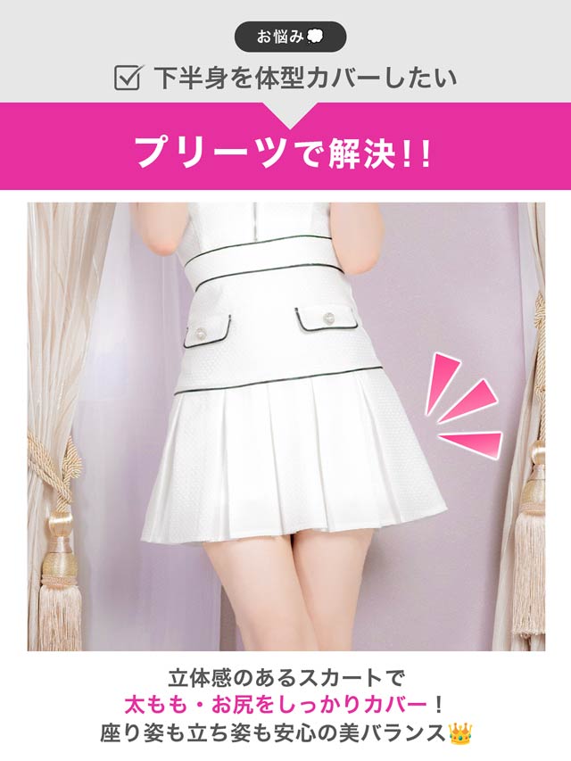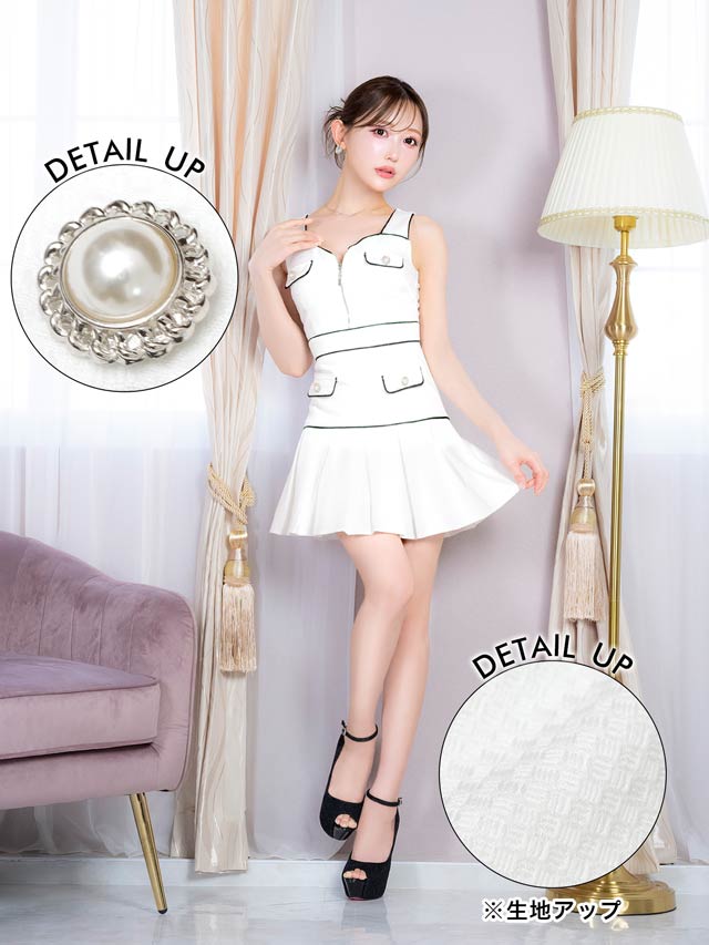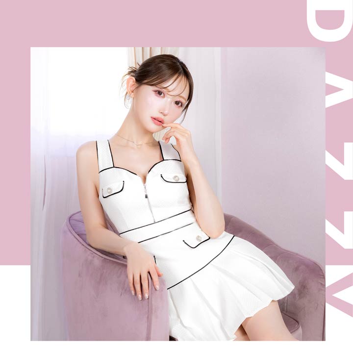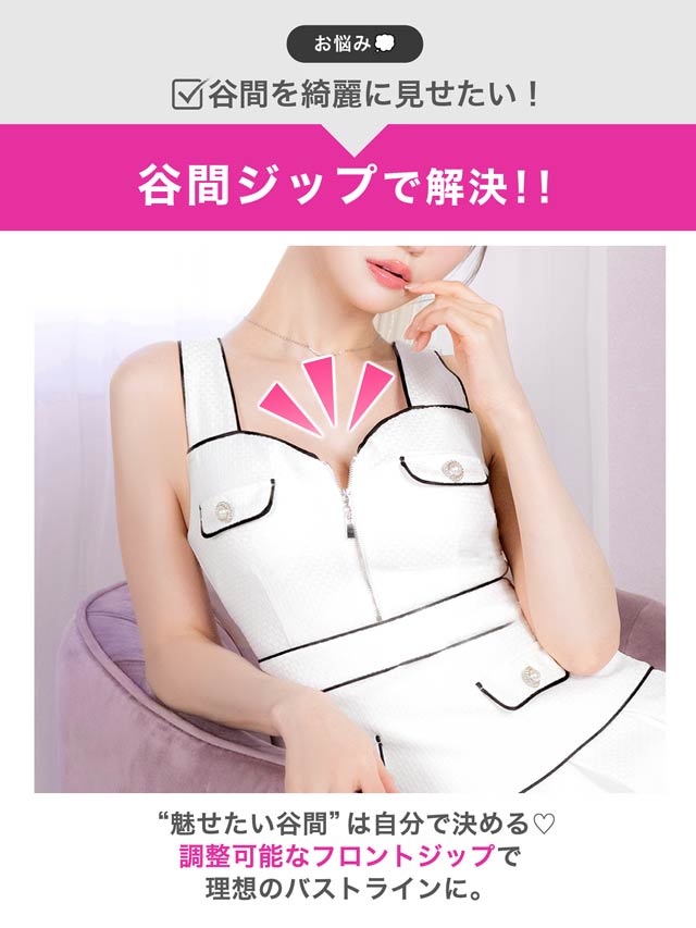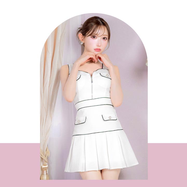 清楚なホワイトカラーにパイピングでメリハリをプラスした上品可愛いキャバドレス。胸元には視線を惹きつけるジップ付きで、谷間の魅せ方をお好みで調節できちゃいます♪プリーツを施したAラインのスカートが気になるお尻まわりもカバーしてくれます◎