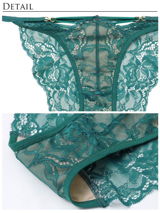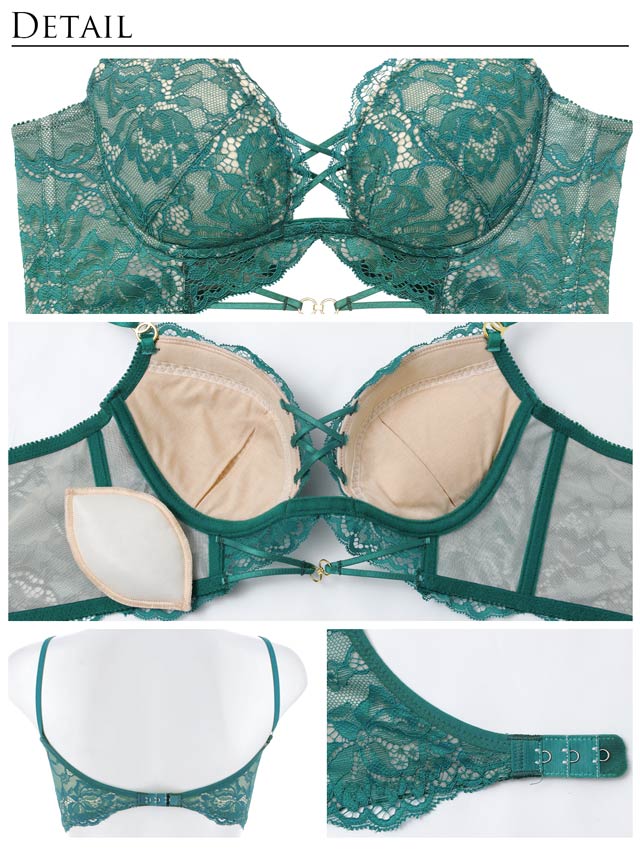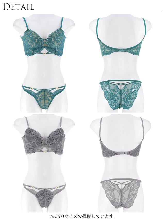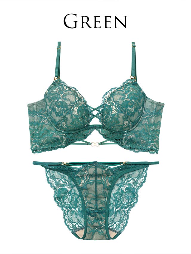 繊細なレースと胸元のレースアップがセクシーなランジェリー。総レースデザインに華奢なストラップデザインを重ね、バストラインを美しく引きたてます。上品なバック透けショーツと大胆にカットされた背中で後ろ姿も抜かりなく仕上げました。大人の色気を引き出す一着です。