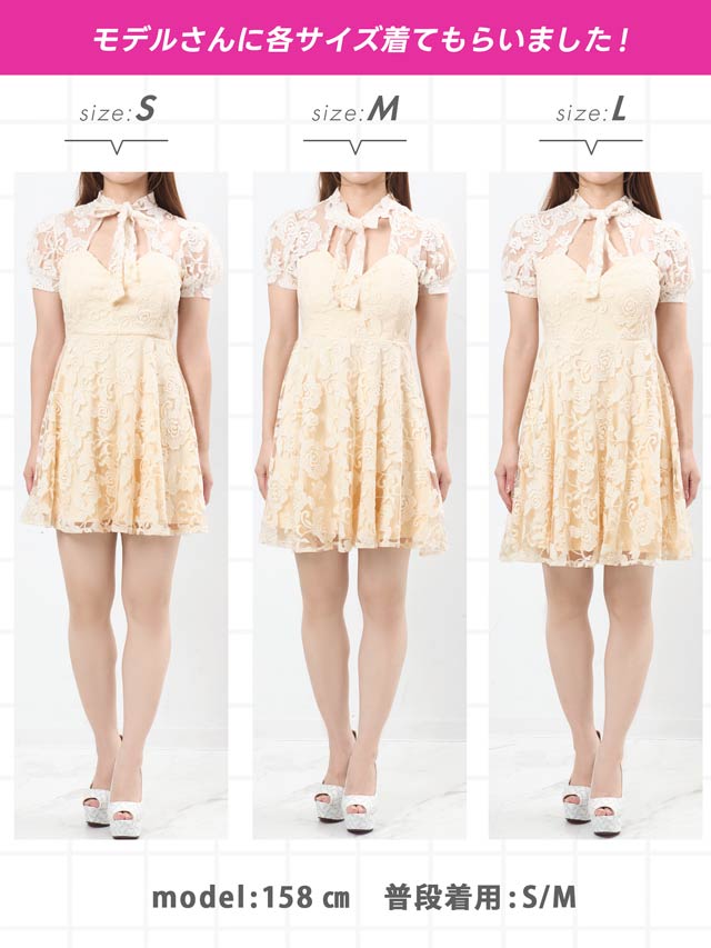 クラシカルと可愛らしさを兼ね備えたローズ刺?が美しいミニドレス。リボン下の谷間ホールデザインが程よく色っぽさを与えてくれる1着♪ ふんわりとしたAラインスカートやパフスリーブで女性らしい柔らかさを演出します◎