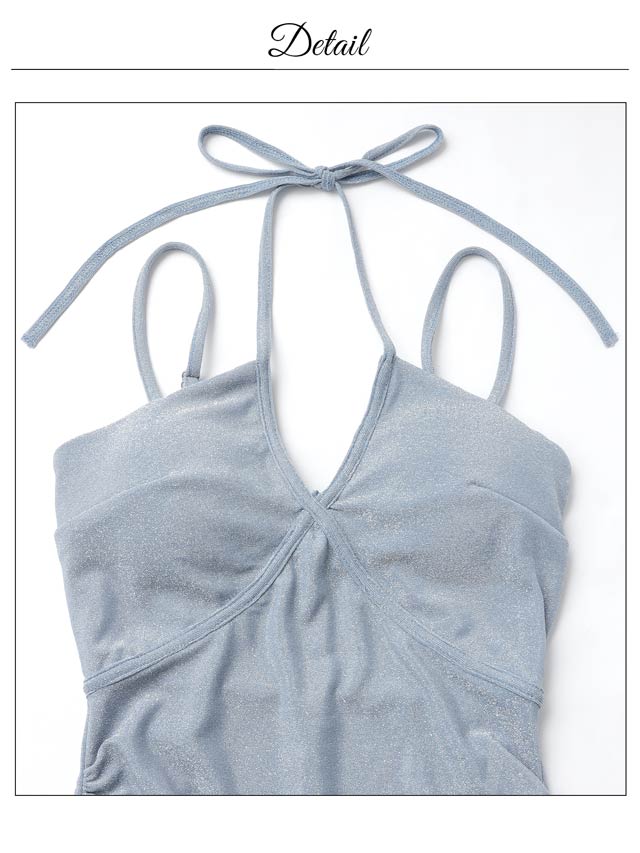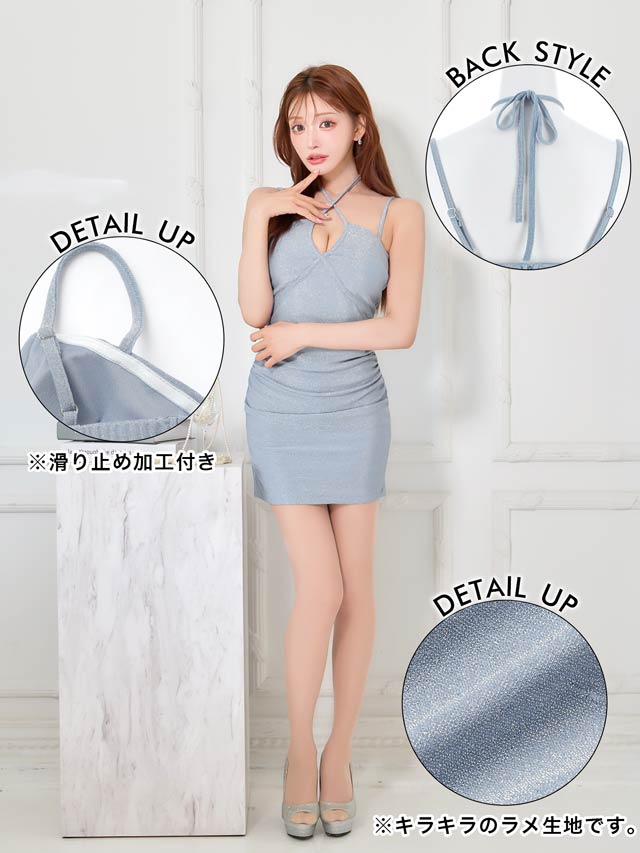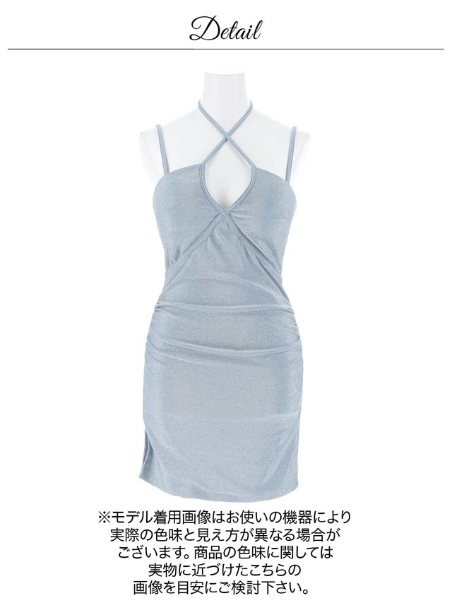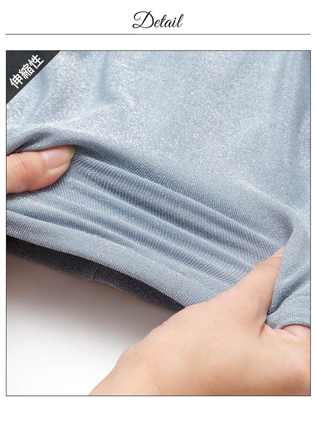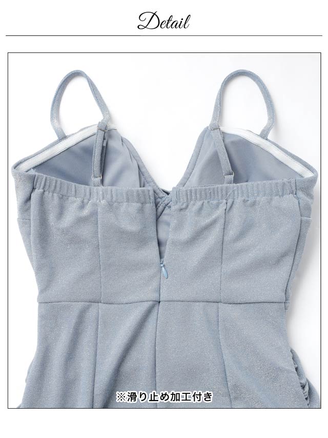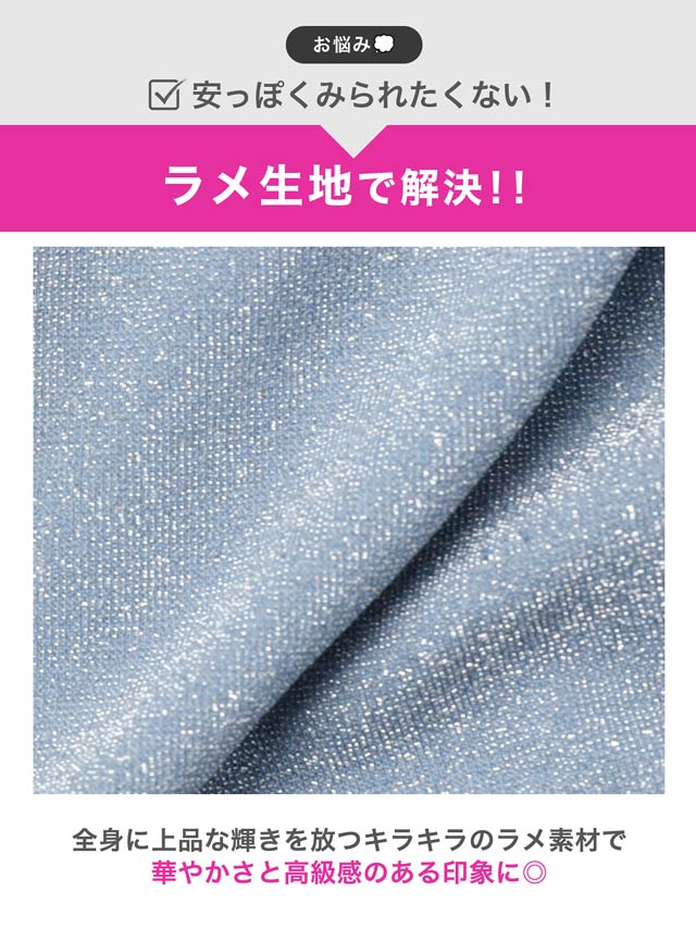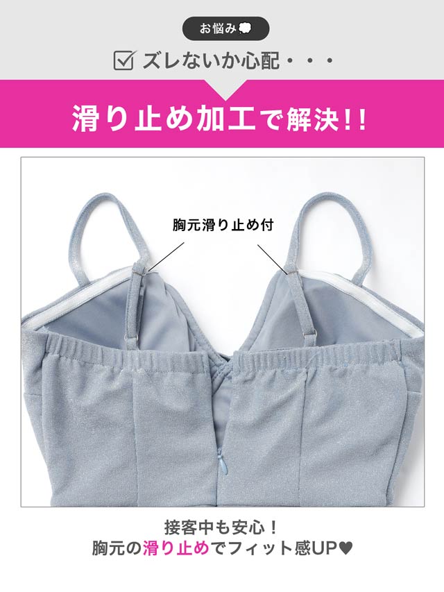 きらきらと輝くラメ生地が暗い店内でも存在感を放つ華やかなキャバドレス。深めのVカットとデコルテのクロスデザインが谷間を綺麗に見せ、大人の色気を感じさせます♪キャミソールの肩紐にはアジャスター付きなのでお好みの長さに調節が可能です◎
