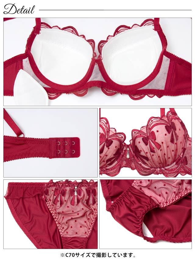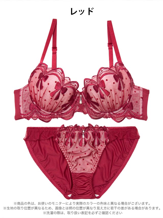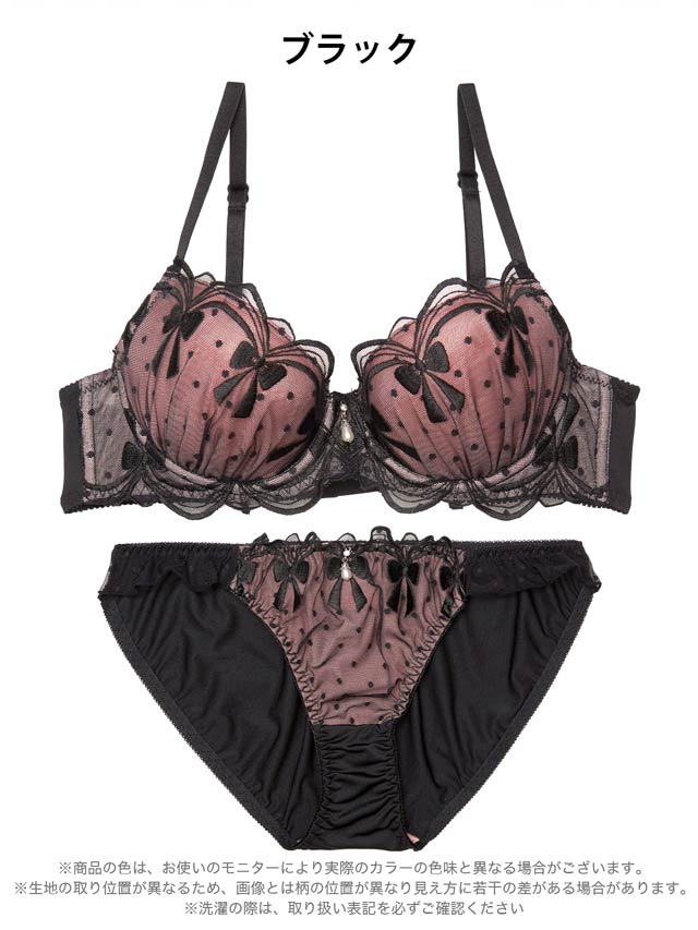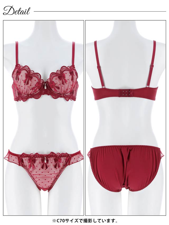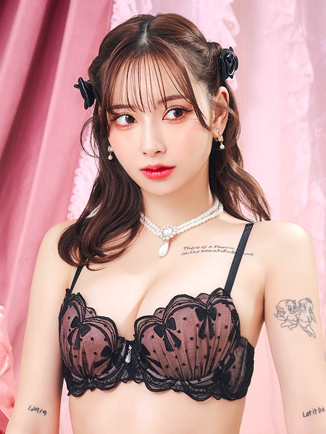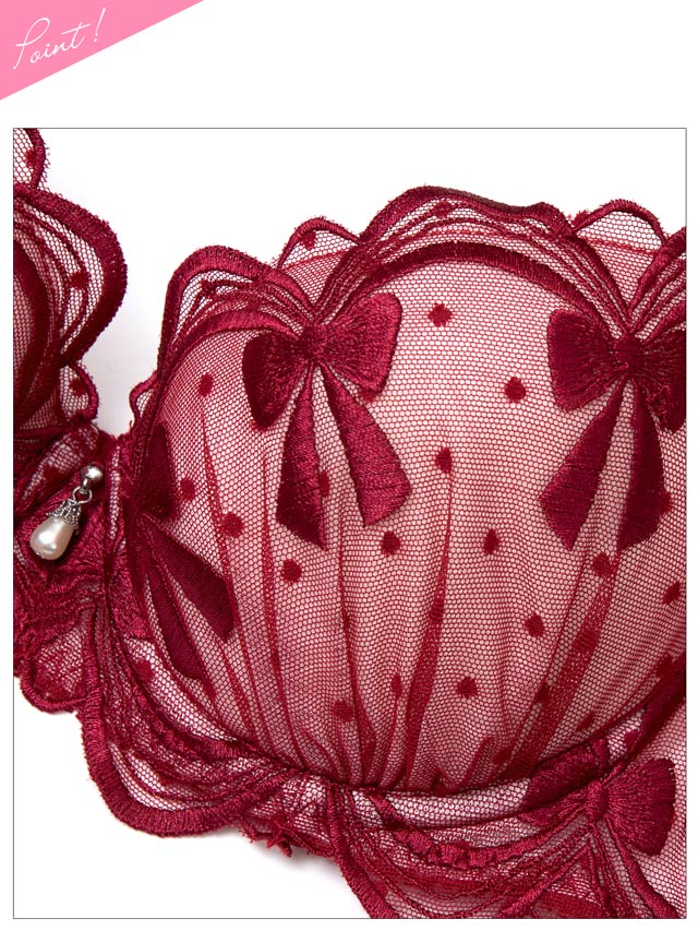 ドット柄とリボンの刺繍がたくさん施されたキュートなランジェリー。バストに沿ったリボンチェーンや中心のチャームなど女の子らしさがたくさん詰まったデザインです♪ショーツサイドはフリルラインで透け感がカワイイ!気分を上げたい時に着たい一着です!
