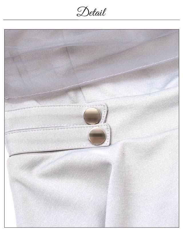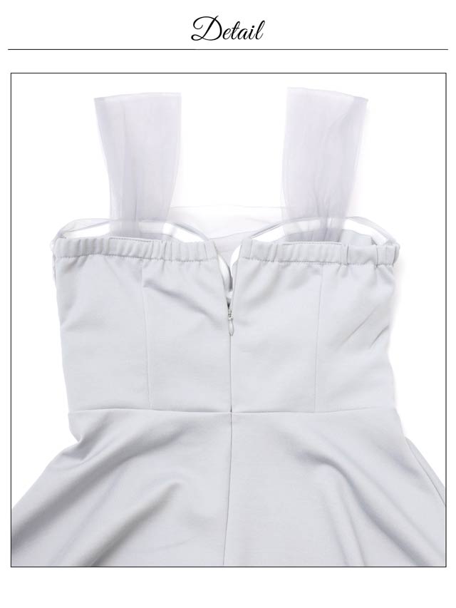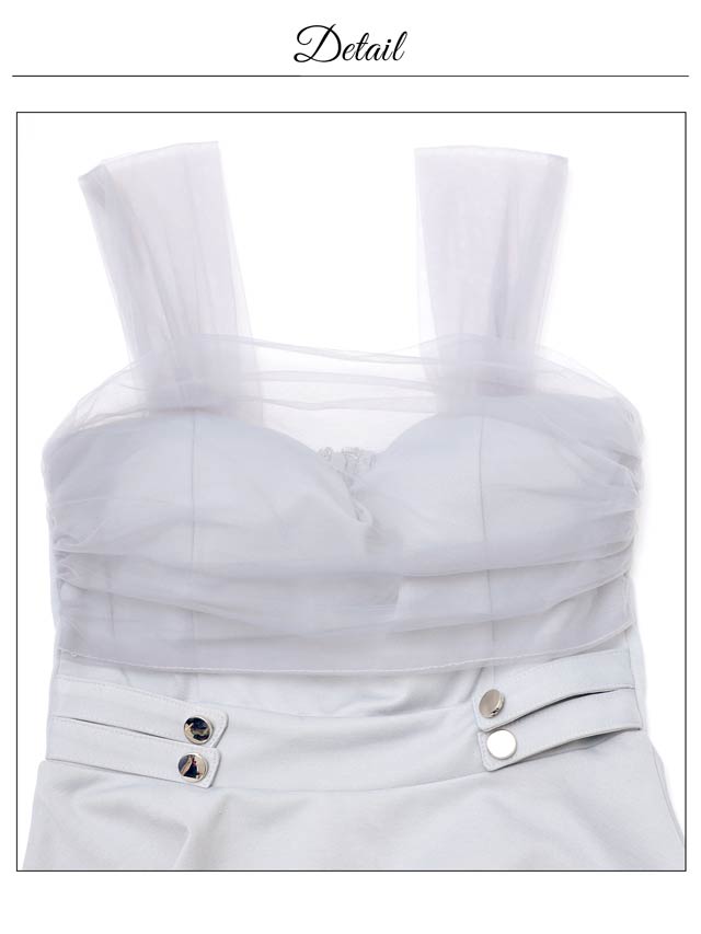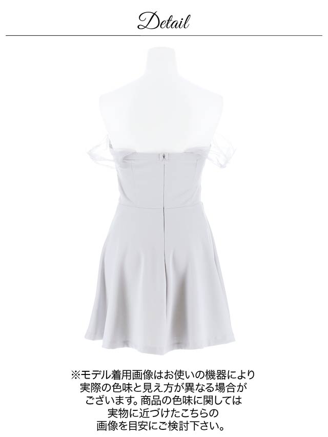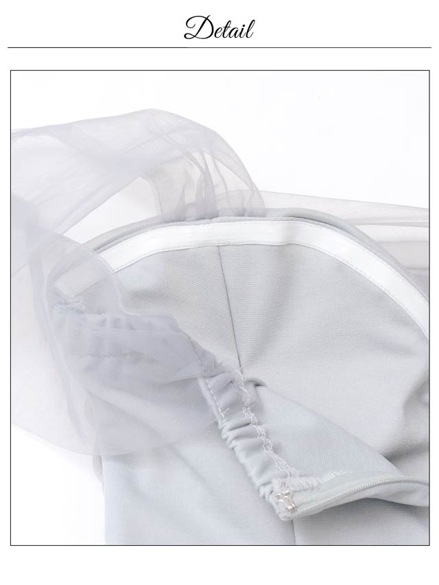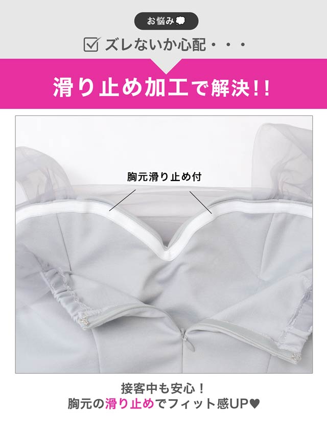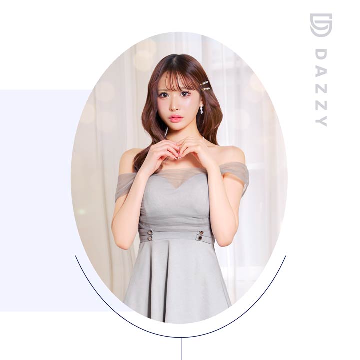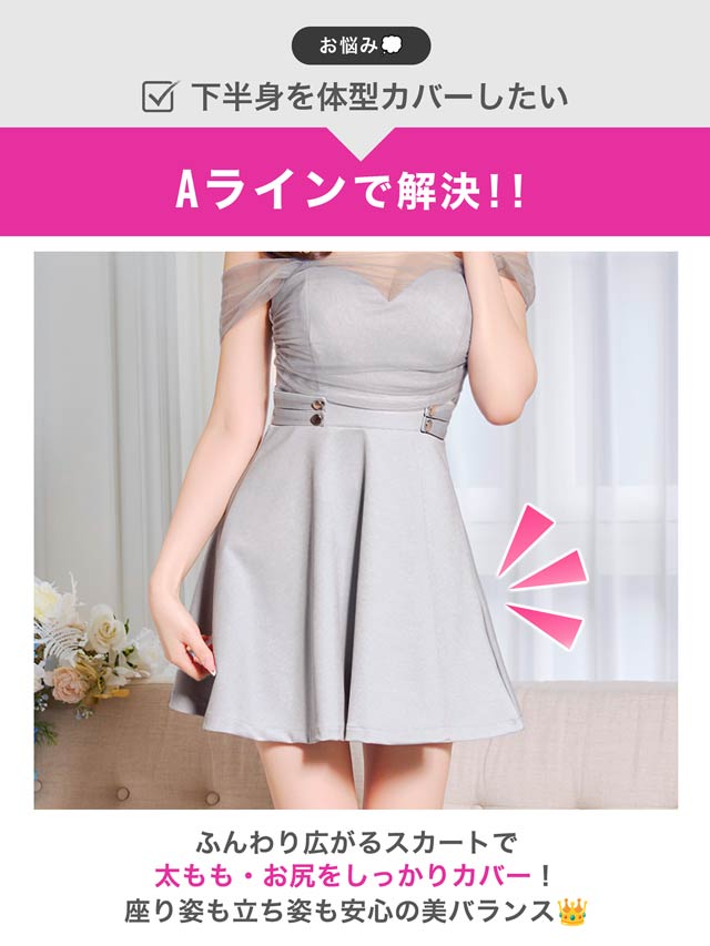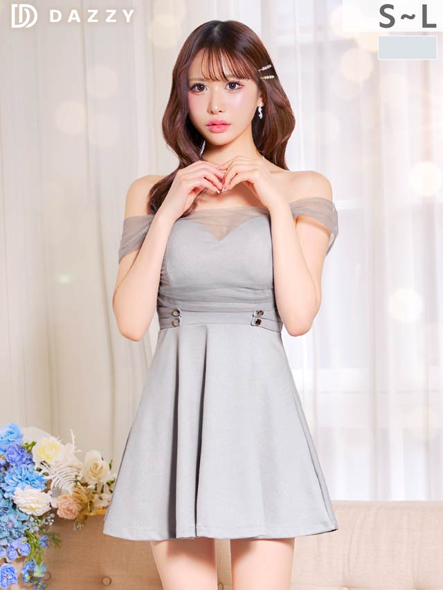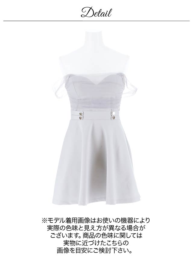 透け感のあるチュールが華奢で可憐なキャバドレス。大胆なオフショルスタイルから覗く谷間透けが甘さとセクシーさを兼ね備えた1着◎ ウエストにはダブルボタンを施し、自然にメリハリのあるシルエットを演出します。