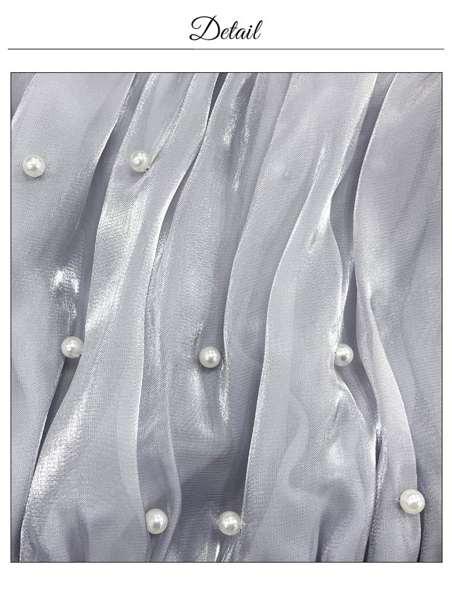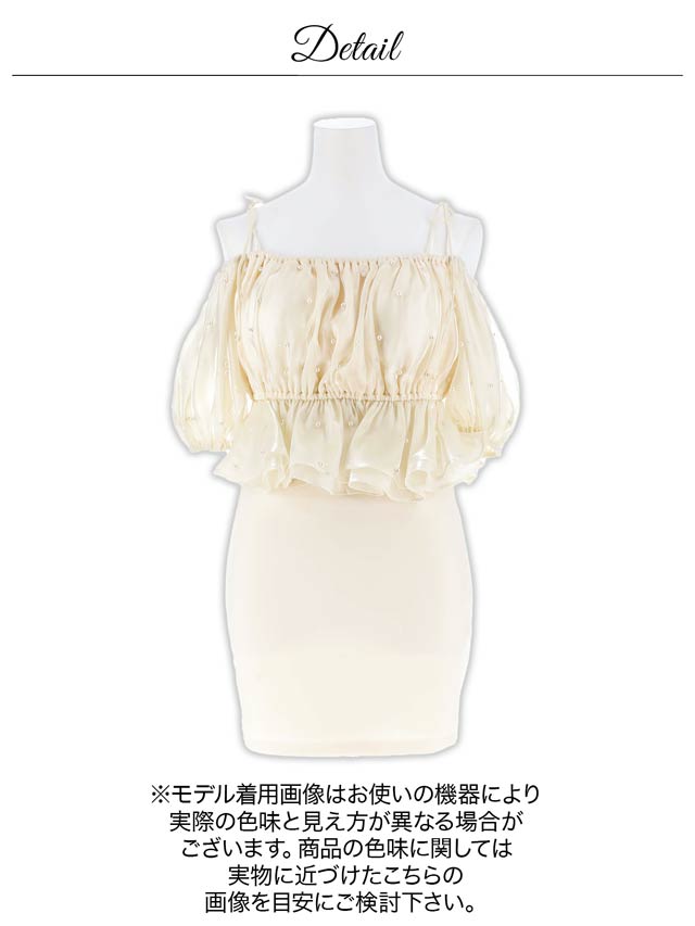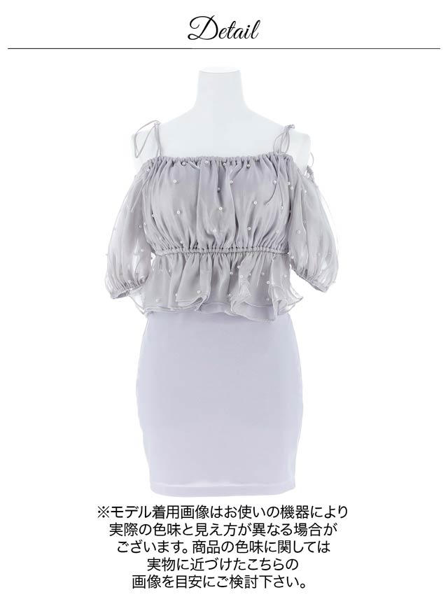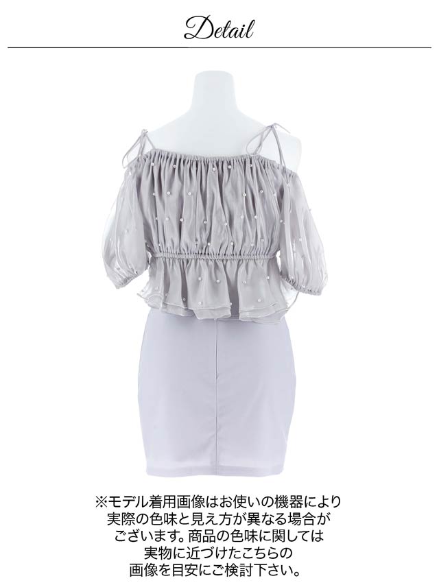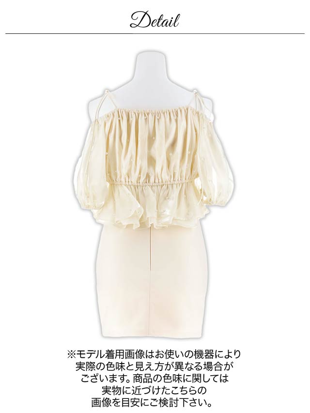 光沢のあるシフォンにパールを散りばめた上品フェミニンなセットアップドレス。デコルテを綺麗に見せるオフショル×肩リボンがあざと可愛い雰囲気を演出!ふんわりしたパフスリーブ&ペプラムシルエットで華奢見え効果も抜群の一着です♪私服としての着回しも出来ちゃいます??