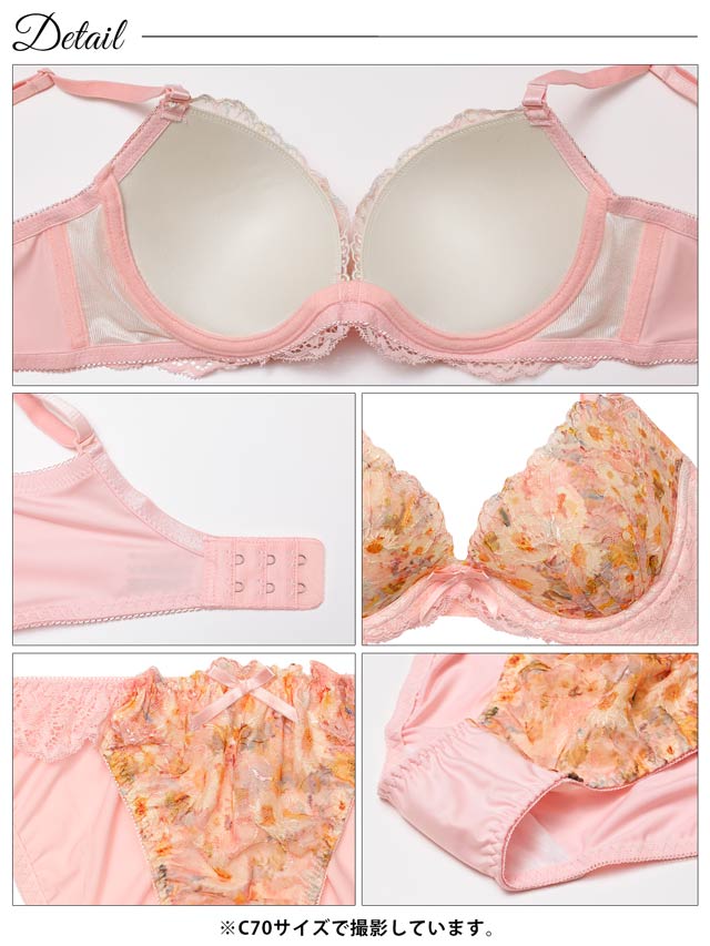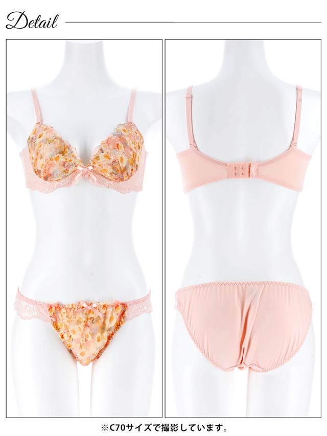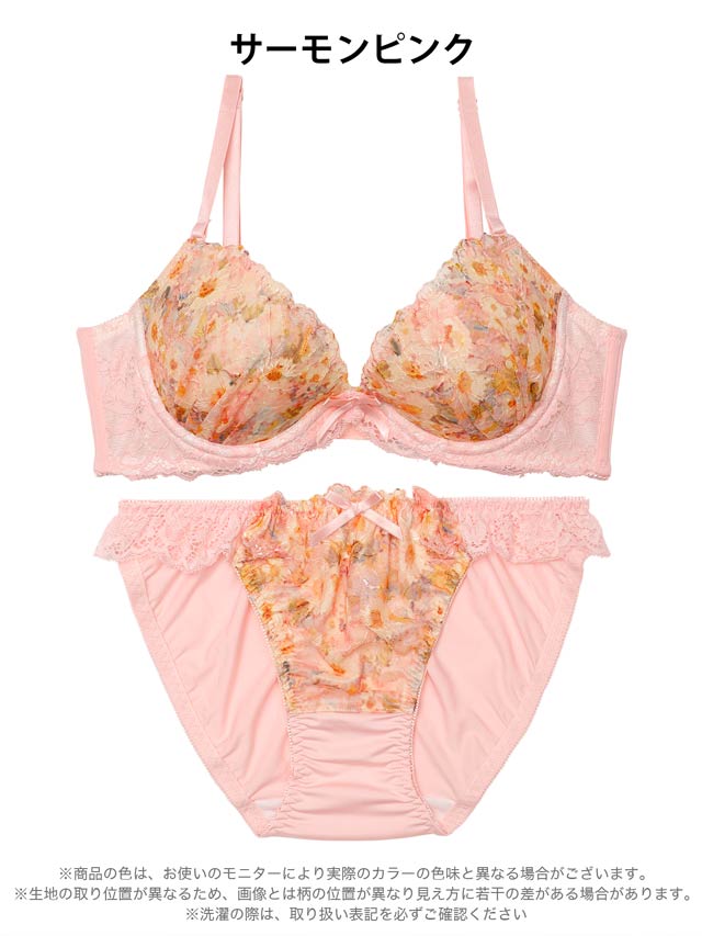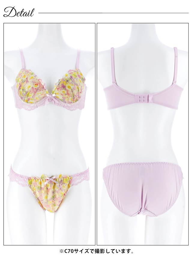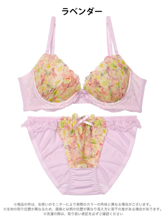 色とりどりのフラワープリントをあしらったお花畑のようなデザインのランジェリー。淡いカラーのレースやリボンを飾って、女の子らしい甘い雰囲気に仕上げています♪ショーツはデイリー使いしやすいフルバック仕様。サイドレースの透け感もポイントです◎
