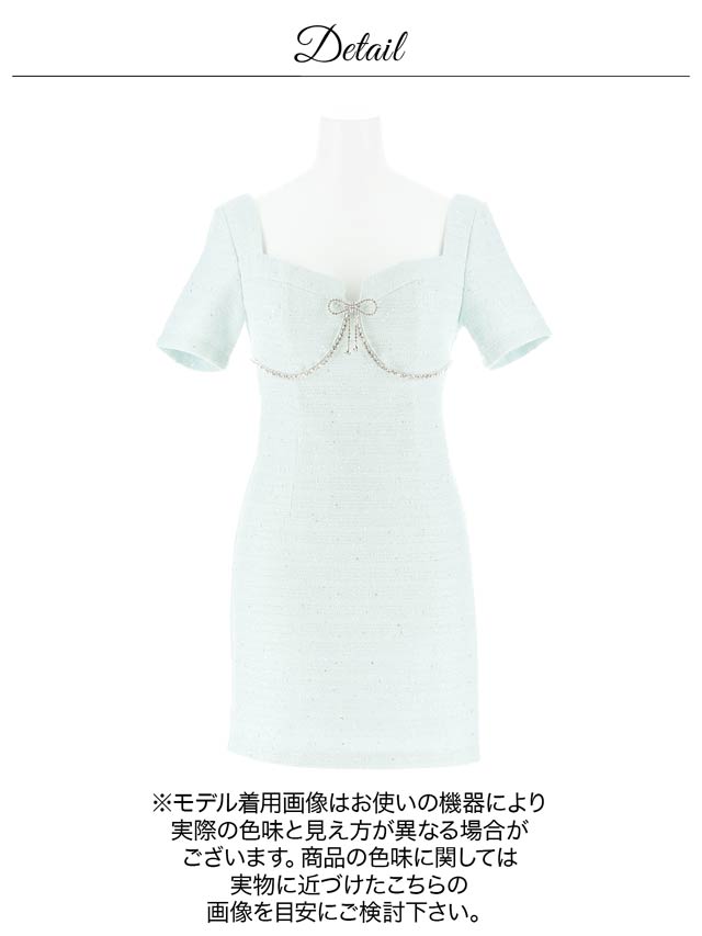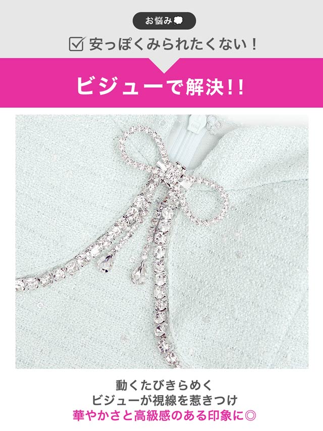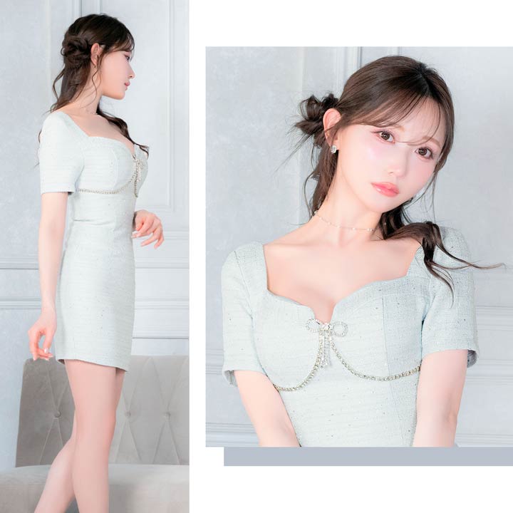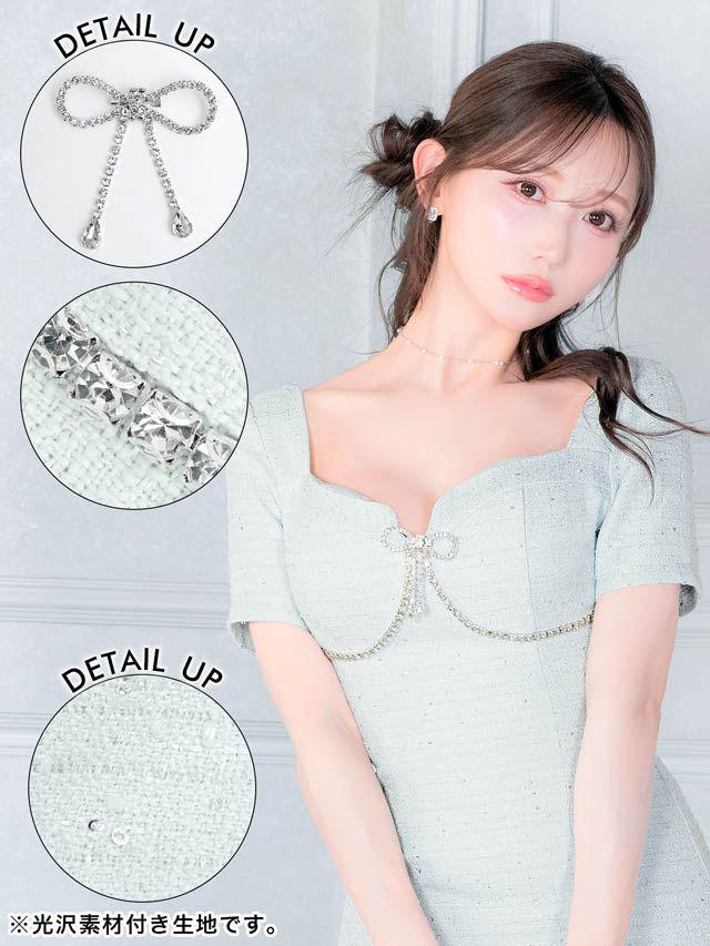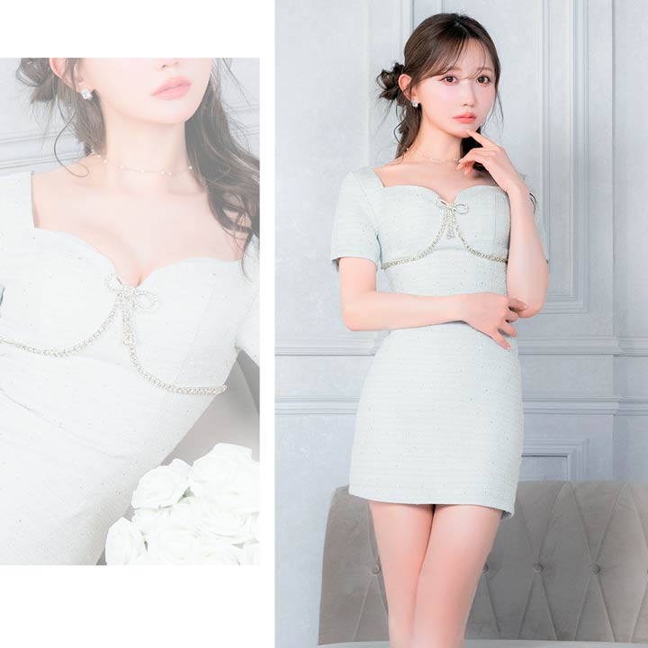 4/17新作!ビジューリボンが目を惹く高級感半袖×バスト強調ビジューのツイードタイトミニ丈キャバドレス[SML/3サイズ展開]