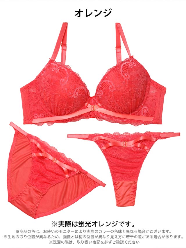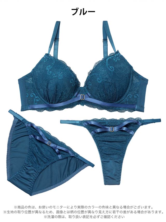 シンプルなレースデザインにクロスするリボンをあしらい、甘さを添えた大人可愛い雰囲気のランジェリー。ショーツのサイドは華奢見えなストリング仕様でちょっぴりセクシーな仕上がりに♪フルバック・Tバックが両方ついた3点セットなので、気分に合わせて使い分けできます◎