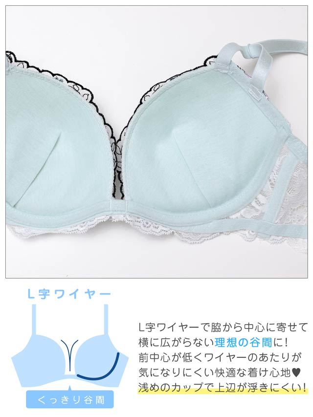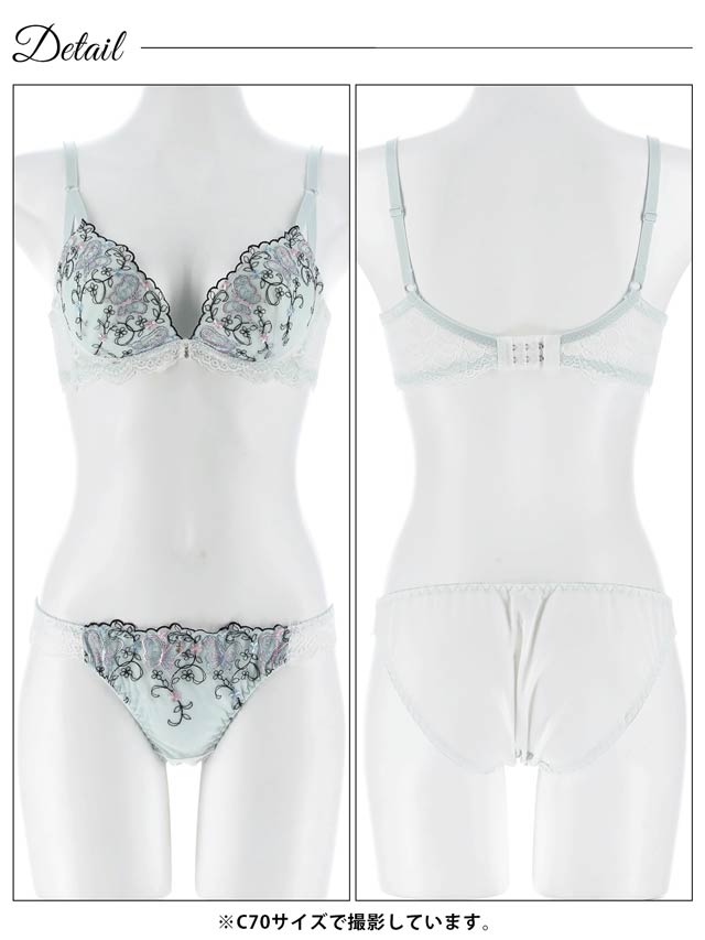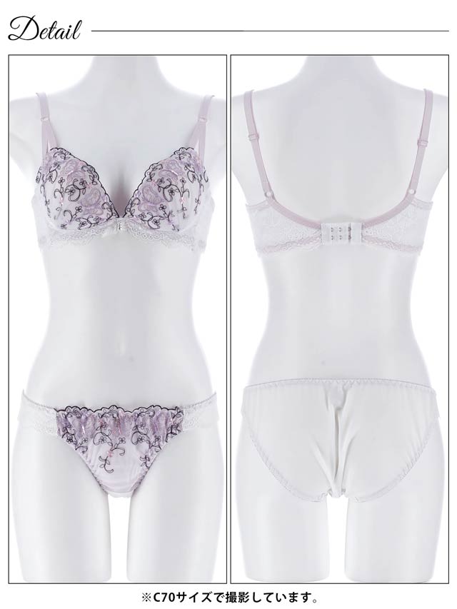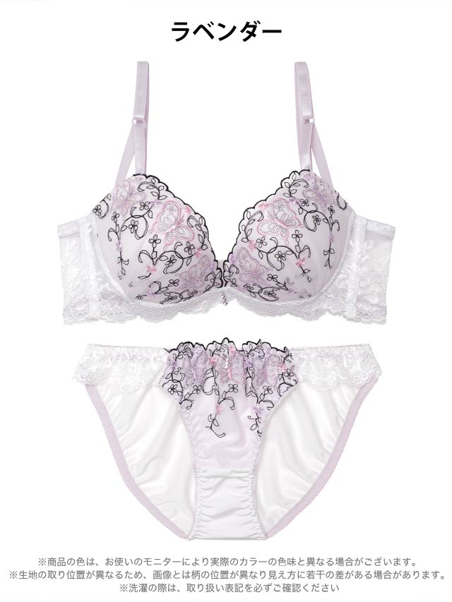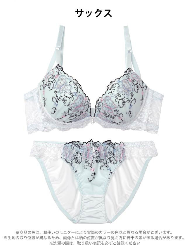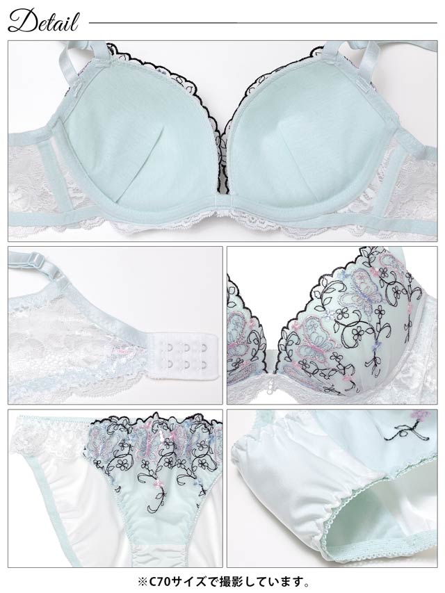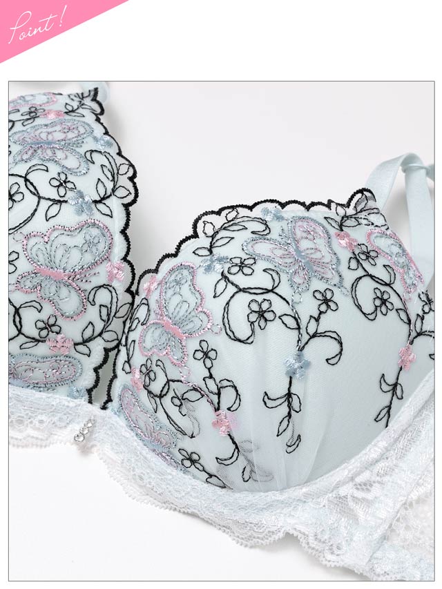 パステルカラーに細かな花と蝶の刺繍が儚げなランジェリー。丸めの刺繍と柔らかな色使いが可愛らしいデザインです。レースの透け感でちょっぴりセクシーさをプラスしました。