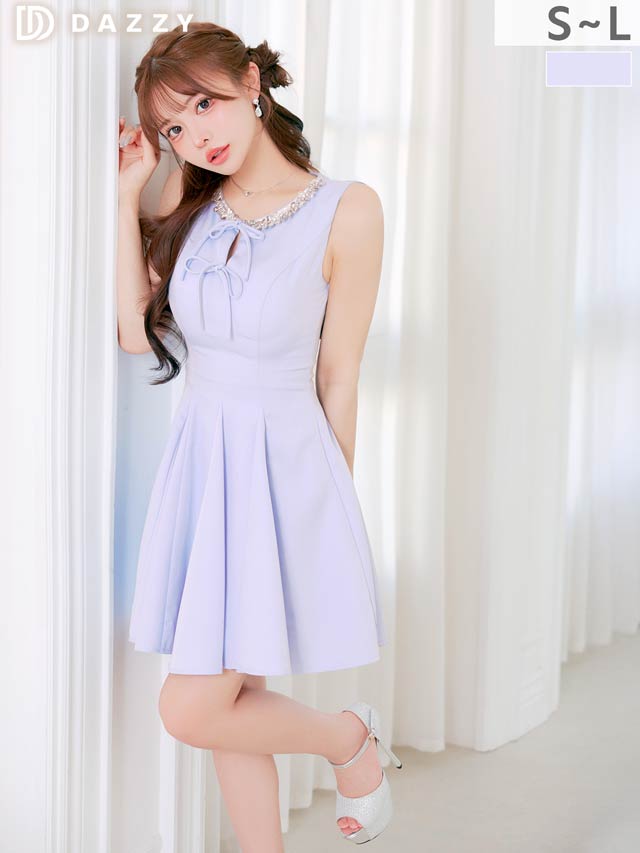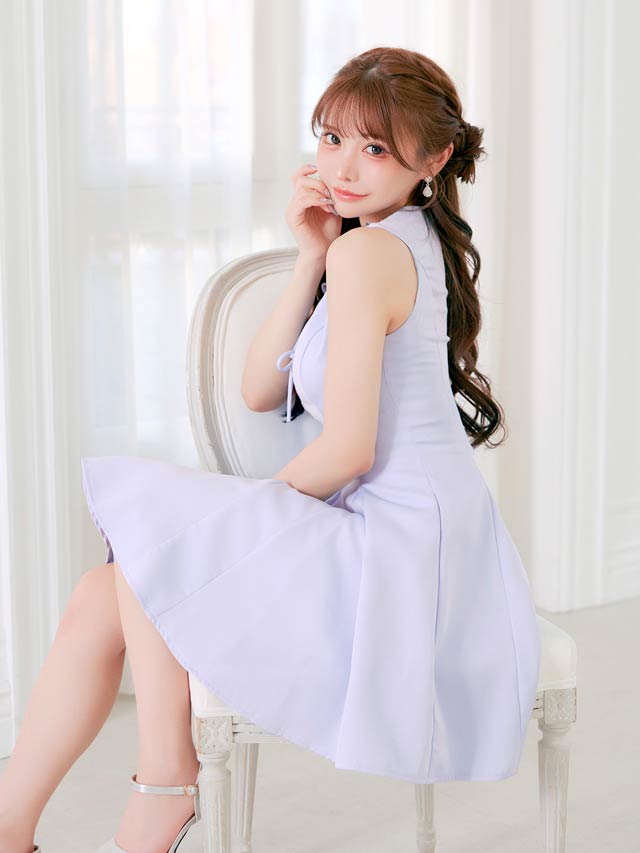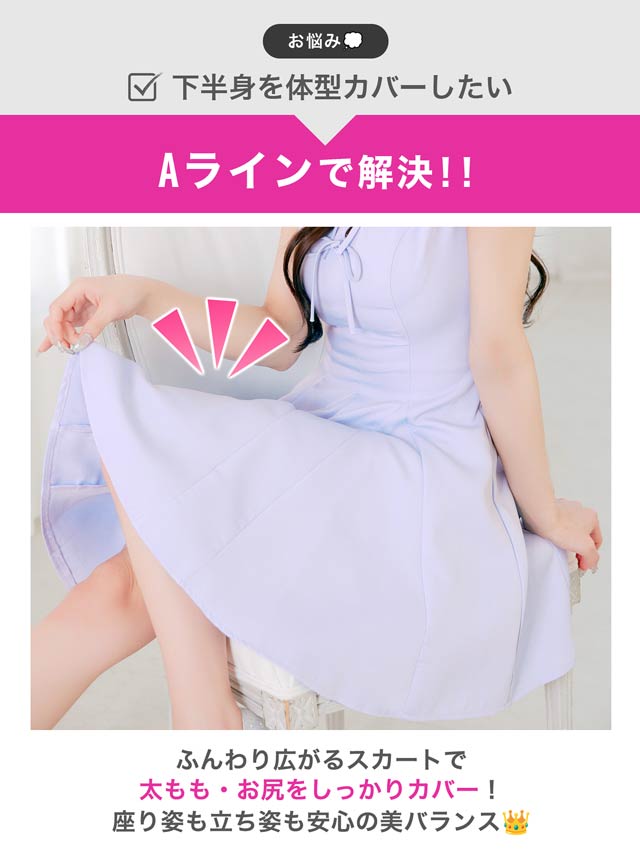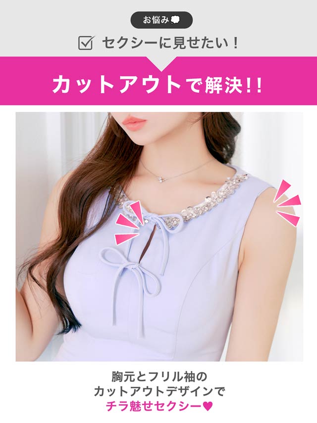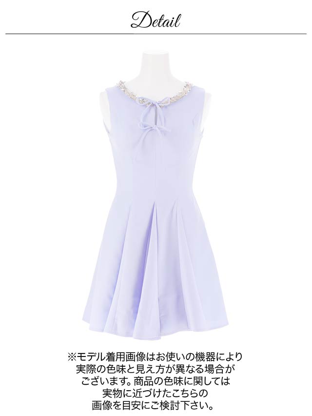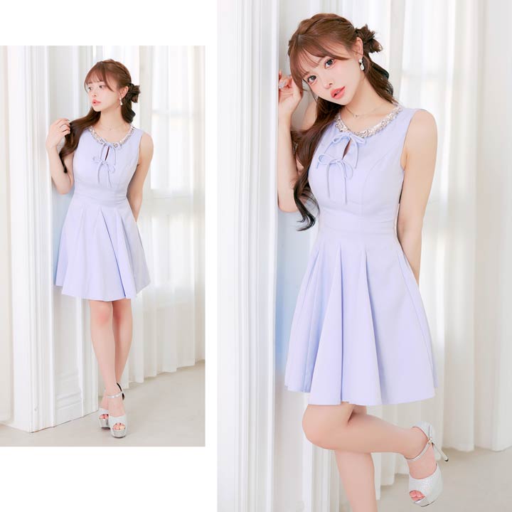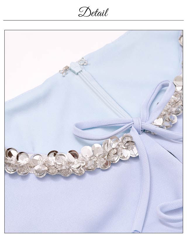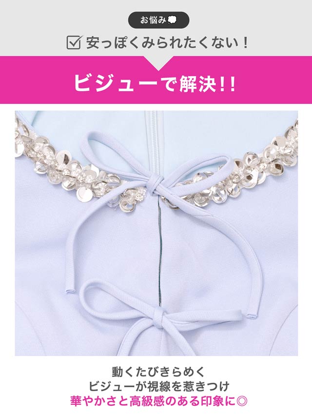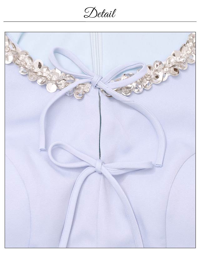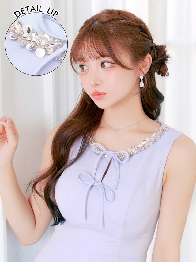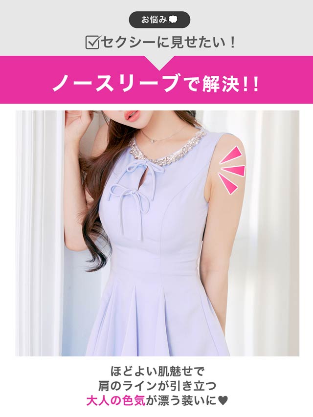 きらきら輝くビジュー×スパンコールと華奢なリボンが、顔まわりを華やかに見せてくれるキャバドレス。ノースリーブで肩をすっきり見せながら、胸元が隠れるデザインで露出が苦手な方にもおすすめ◎Aラインシルエットが女の子らしさを演出し、気になるお尻まわりも自然にカバーできます♪