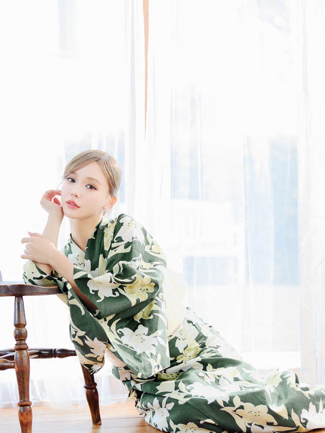 落ち着いたグリーン地に大ぶりの百合柄が映える、上品で大人っぽい印象の浴衣。セットの兵児帯はくしゅっとした生地感で、ほどよく可愛らしさをプラスしてくれます◎サンダルを合わせた抜け感のあるコーデもおすすめです♪