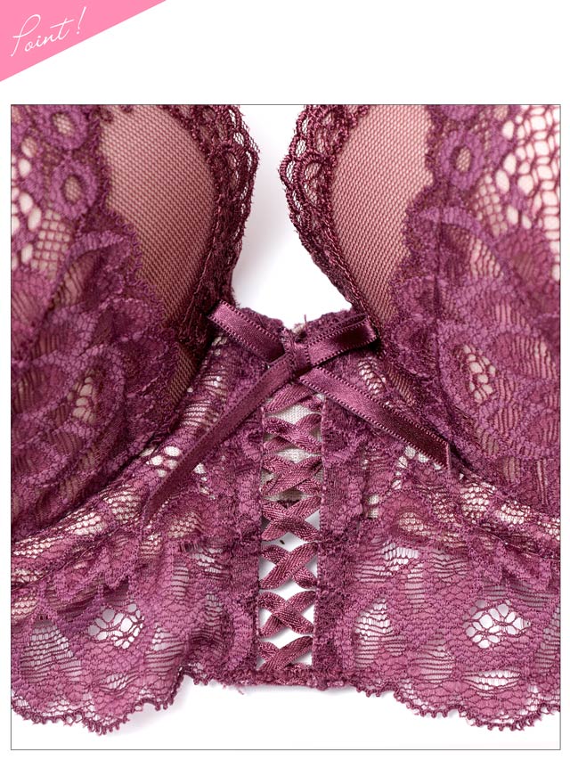 重なる粗目のコードレースがセクシーなランジェリー。中心のレースアップが色っぽさと甘さをプラスします♪ショーツはレースラインでサイドのリボンがキュートなデザインです。