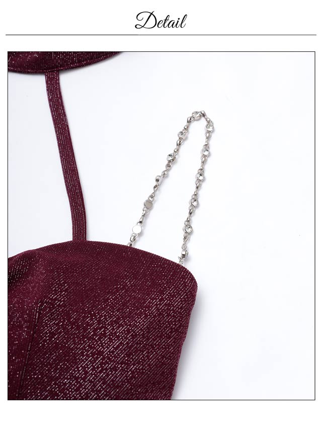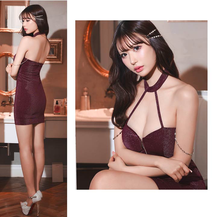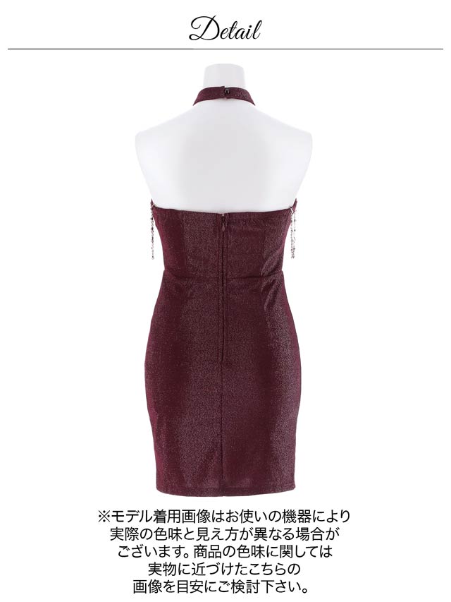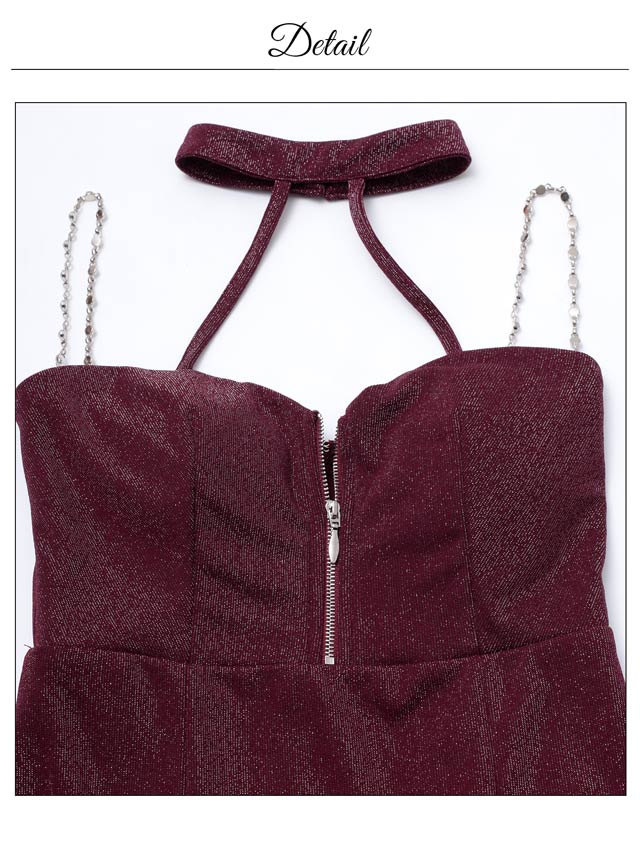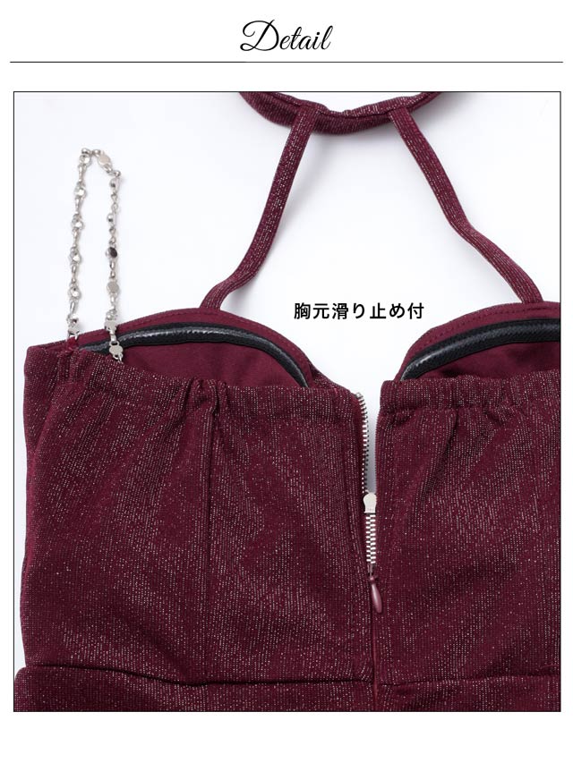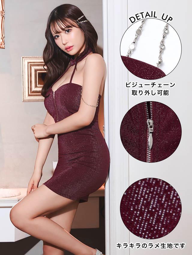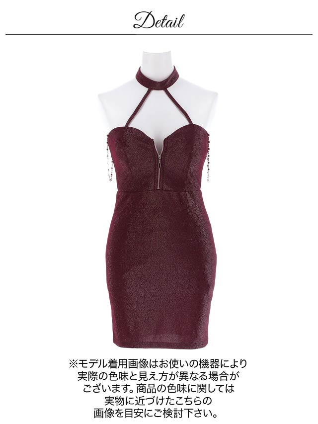 4/27新作![伊藤桃々着用]谷間魅せジップ×コードデザインがSEXY♪ラメが輝くビジューチェーン付きホルターネックタイトミニ丈キャバドレス[SML/3サイズ展開]