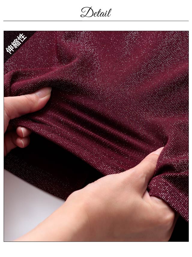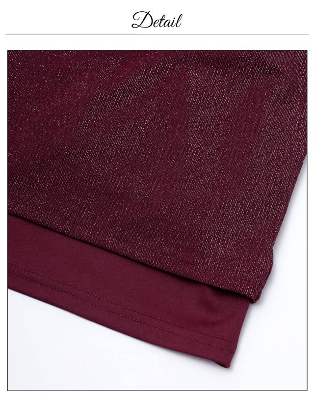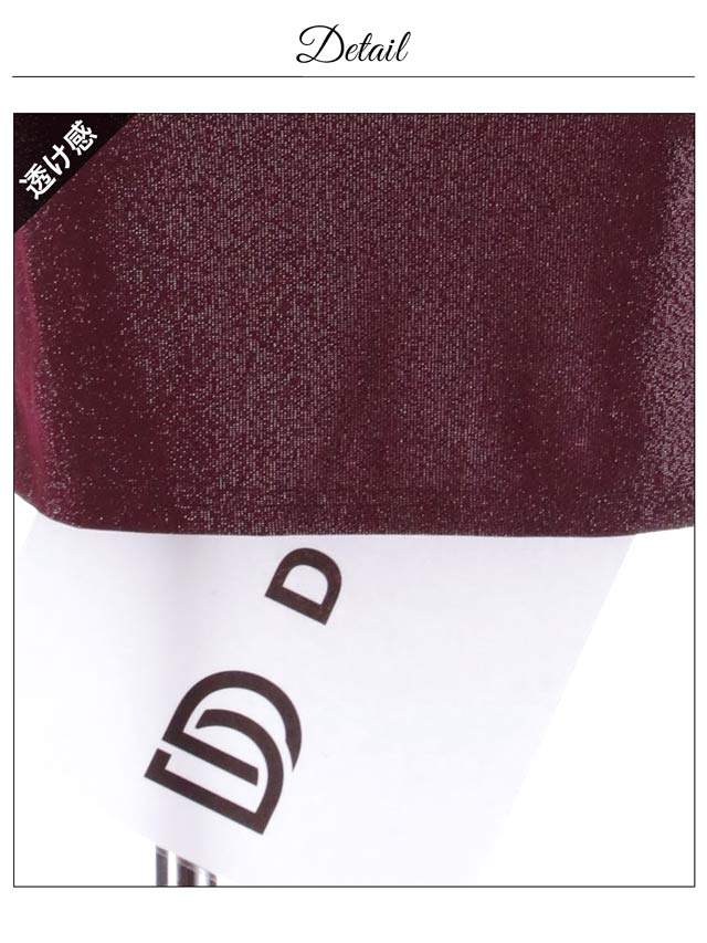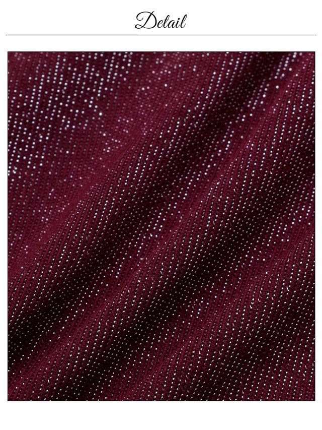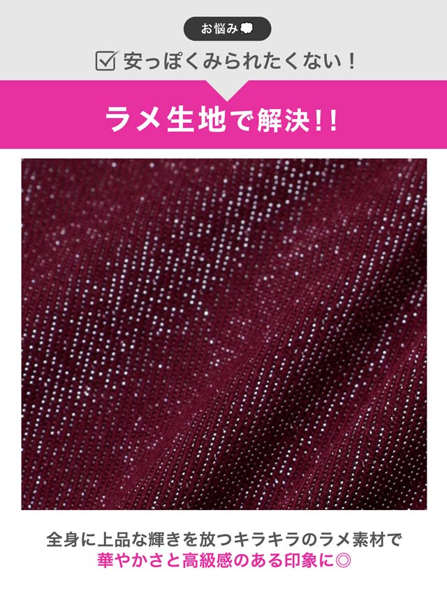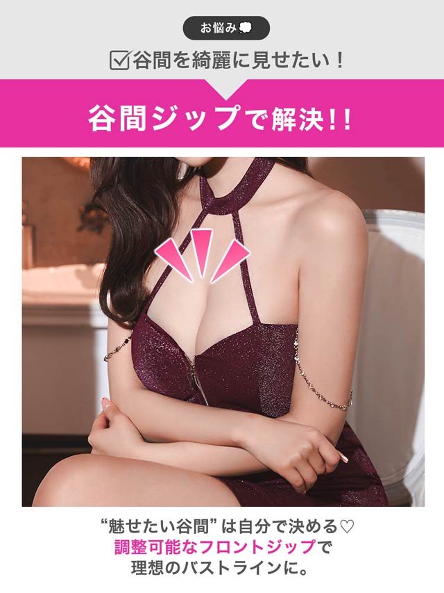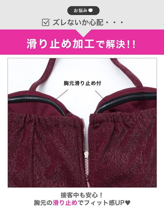 きらめくラメ生地とビジューチェーンが存在感を放つ、華やかなキャバドレス。フロントジップとデコルテのコードデザインが谷間を色っぽく際立たせ、周囲の視線を釘付けに♪胸元にはすべり止め付きなので、ずれにくくフィット感のある着心地です。