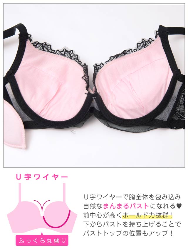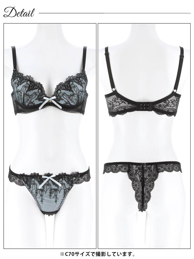 リボン柄の刺繍やレースをブラックカラーで統一し、甘すぎず大人可愛い雰囲気に仕上げたランジェリー。リボン刺繍にはきらめくラメ糸をあしらい華やかさをプラスしました♪ショーツはセクシーな透け感のバックレース仕様!お洋服にひびきにくいのも嬉しいポイントです。