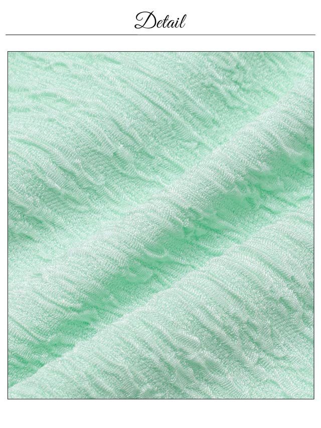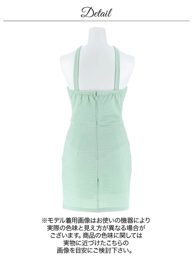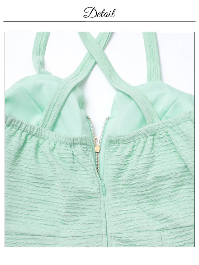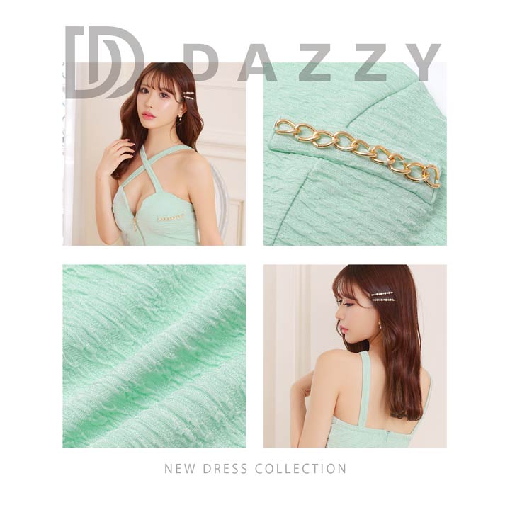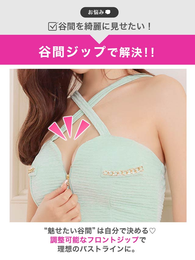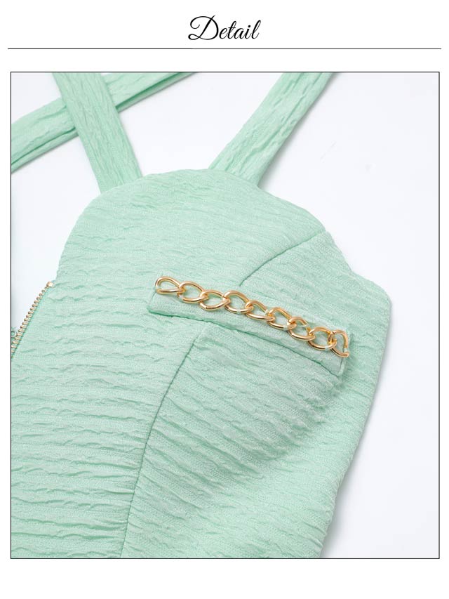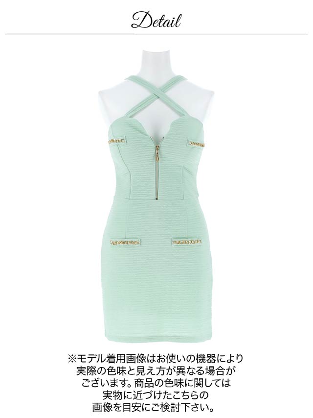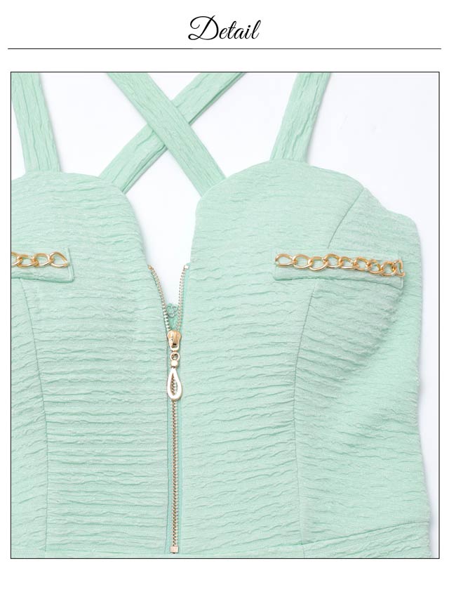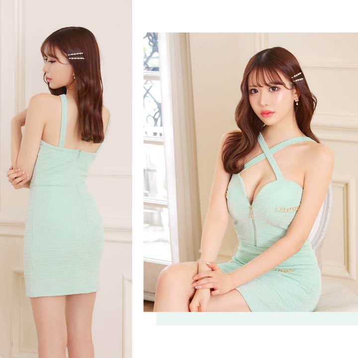 爽やかなカラーにゴールドチェーンのアクセントが映える、明るい印象のキャバドレス。クロスデザインとフロントジップが谷間を美しく引き立て、女性らしい色気を演出します。伸縮性に優れた生地を使用しているので、長時間の着用でもストレスフリーです◎