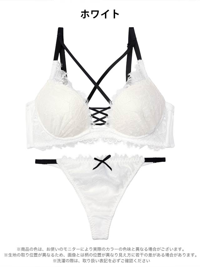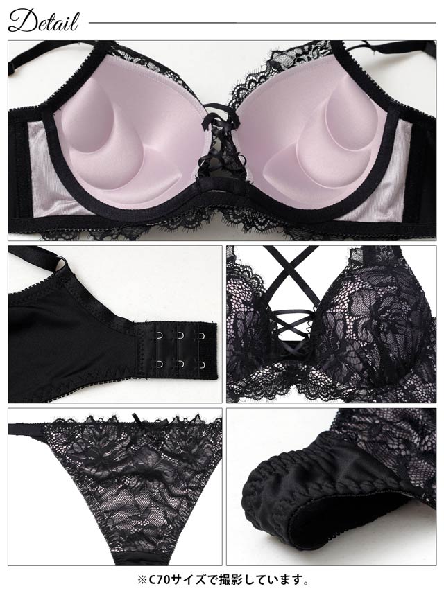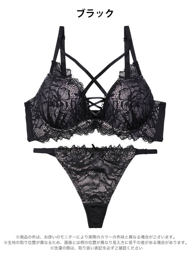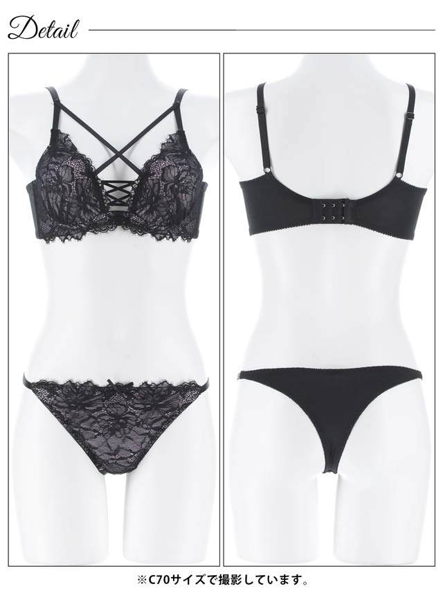 大柄のフラワーレースが上品さと華やかさを引き立てるランジェリー。視線を惹きつけるレースアップデザインがアクセントになり、谷間をよりセクシーに演出します。ショーツはヒップを包み込むフルバック仕様。サイドストリングで腰まわりを華奢に見せてくれます◎