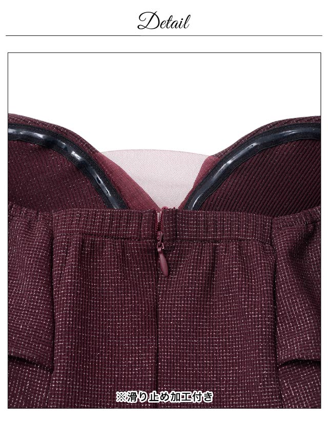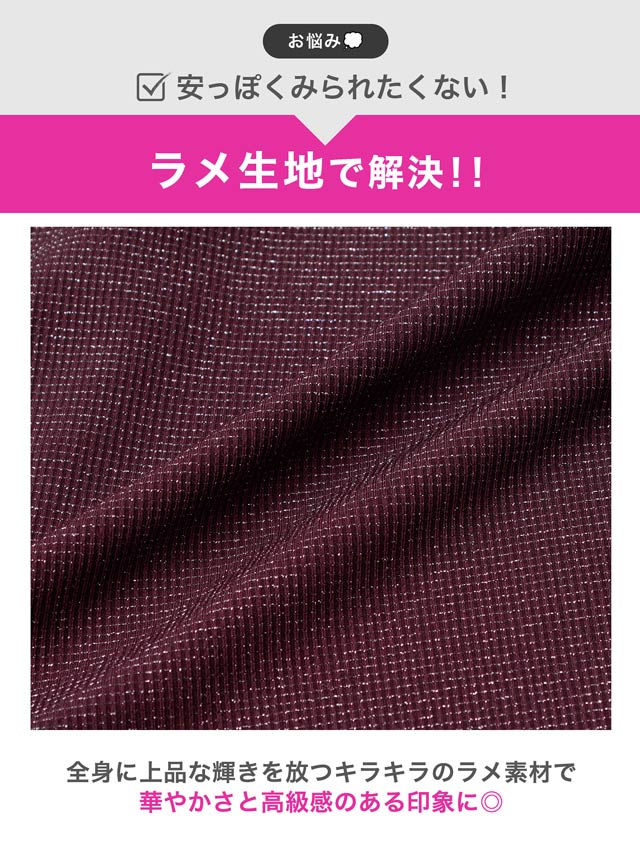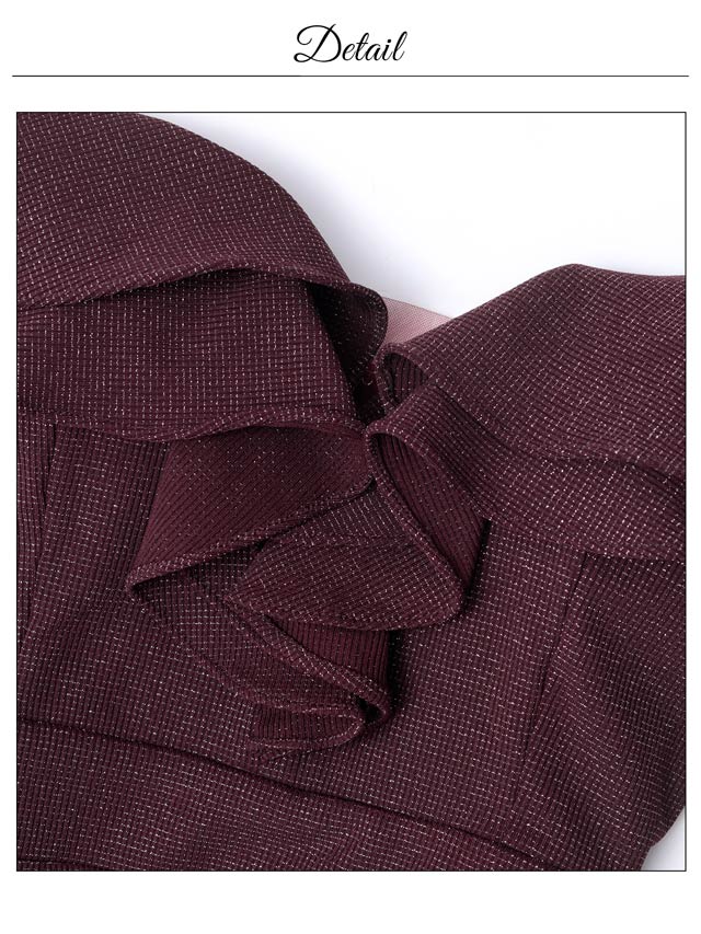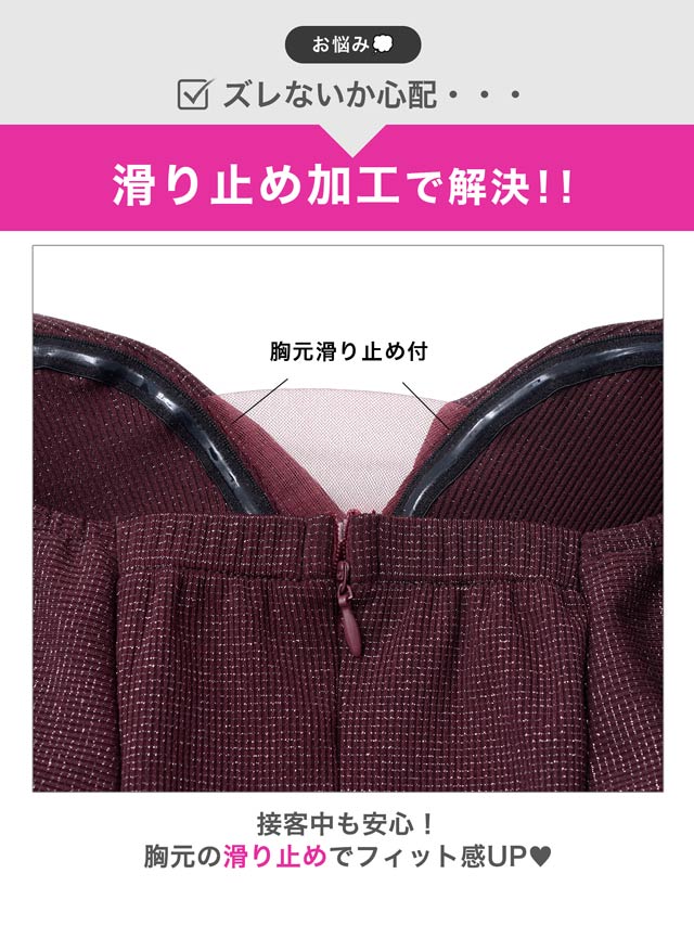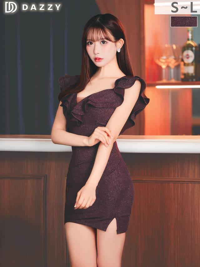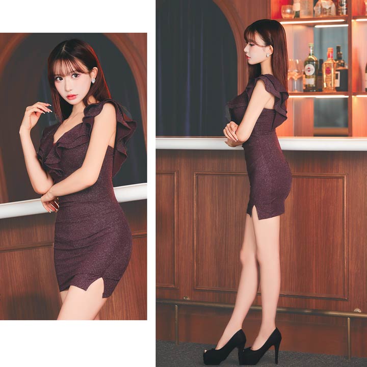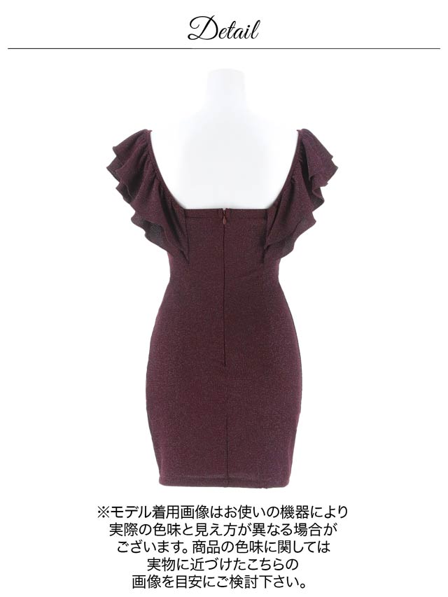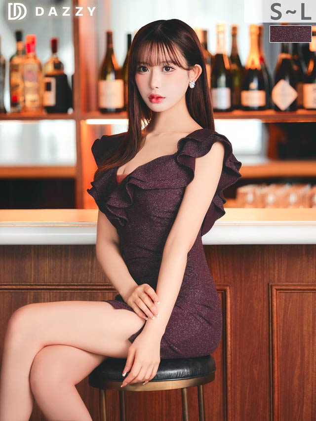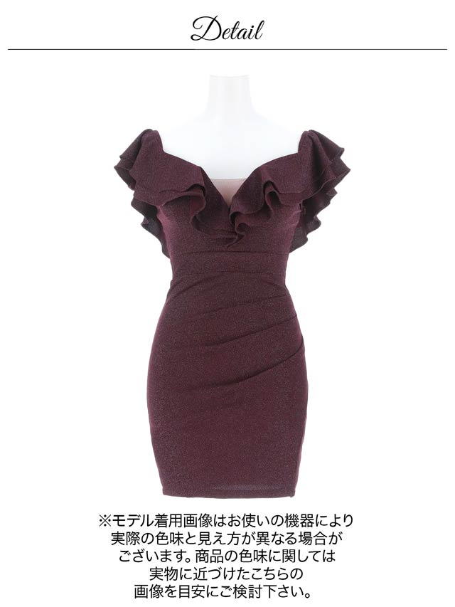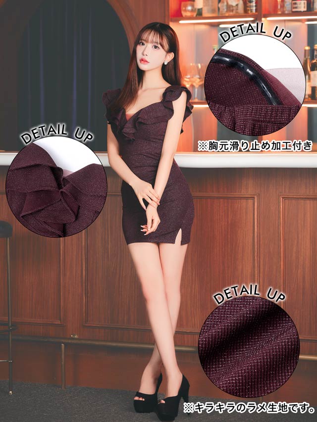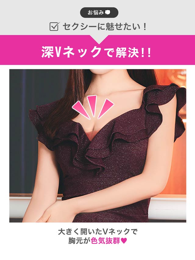 キラキラのラメ生地とボリューム感のあるフリルが華やかさを演出するキャバドレス。ふんわりとしたフリルは女性らしいやわらかさと程よい甘さを感じさせます◎胸元には深めのVカットが施され、谷間を色っぽく&キレイに見せてくれる一着です♪