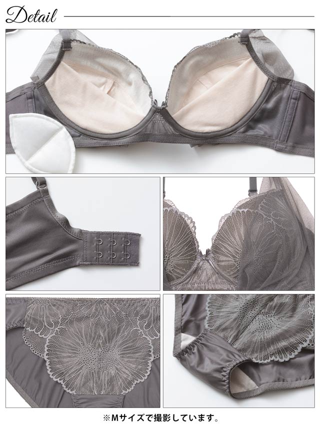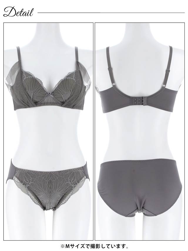 落ち着いた色味に大ぶりな花のレースがインパクトのあるランジェリー。ノンワイヤーなので体を締め付けず快適に着用できます◎シンプルなデザインで日常使いしやすい一着です。