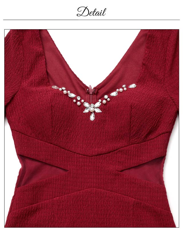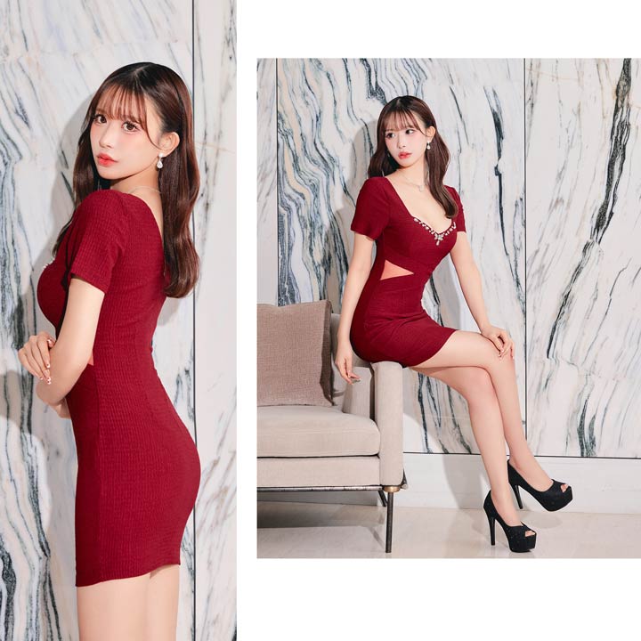 4/8新作![伊藤桃々着用]ウエストカットで美くびれ強調♪パールビジューが谷間を彩るタイトミニ丈キャバドレス[SML/3サイズ展開]